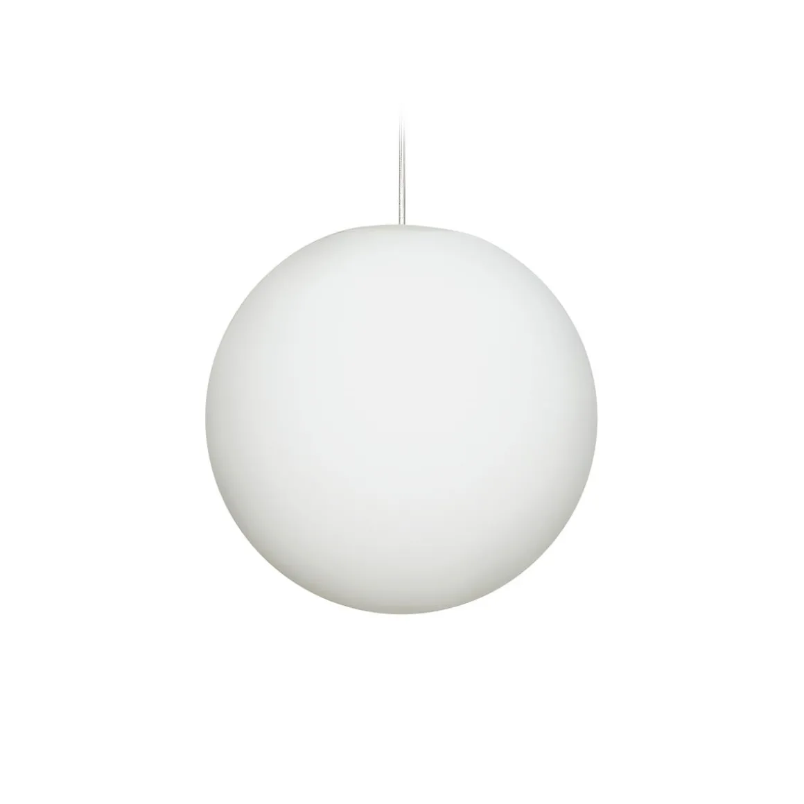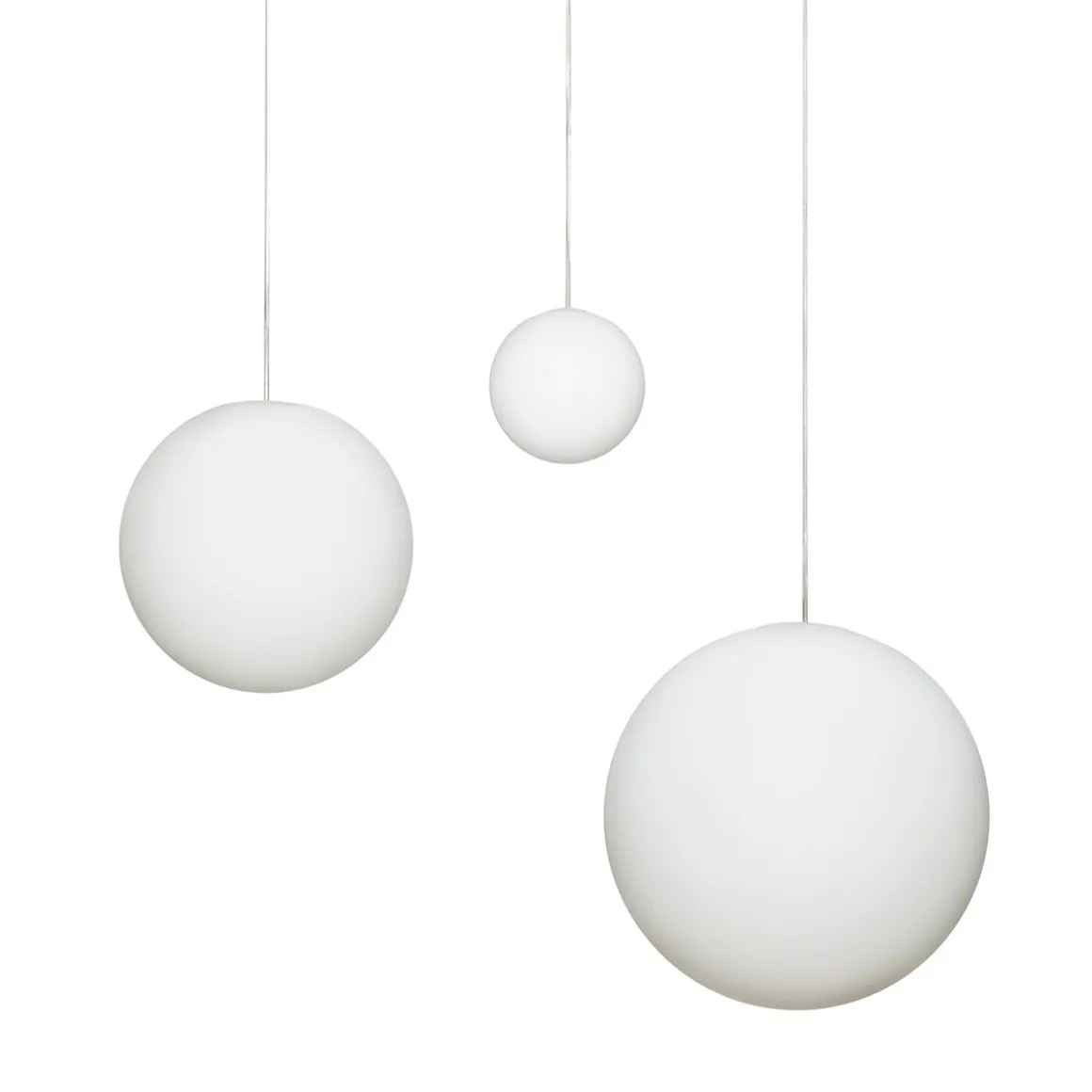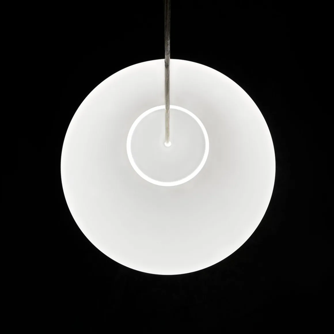 La solution a consisté à intégrer le couvercle au globe lui-même : il est caché, mais plus facile à manipuler que n’importe quel autre globe. Un souffleur de verre expérimenté de l’usine de verre polonaise a suggéré d’utiliser une vieille machine oubliée qui permet de polir les bords du globe et le couvercle à tolérance zéro. Sur les globes opaques comme sur les globes en cristal, le couvercle est un composant invisible intégral, et il a enfin perfectionné le concept du globe. Complété par une croix en acrylique transparent, le reste de la structure suspendue et les câbles électriques sont assemblés en un seul cordon. « Si vous voulez façonner un espace intérieur avec de la lumière, vous avez vraiment besoin d’une source lumineuse sans compromis. Il n’est donc pas étonnant que mon rêve ait été un globe aussi parfait que la pleine lune, sans ombres – juste une lumière irisée pure », explique Alexander. Sa carrière de designer a produit des surprises lumineuses, avec une poignée de porte lumineuse et une valise incandescente ; il a également illuminé des images 3D de scanners cérébraux, le tout dans cet espace passionnant entre l’art et le design. La nouvelle version en cristal Luna est livrée avec une ampoule LED de forme spéciale, qui améliore encore le design de la lampe. La version cristal est disponible dans les tailles M et L, la version opaque est également disponible en S ; toutes sont dimmables. La version opaque XL est 50 % plus grande que la version L, offrant un diamètre de 60 cm. Et pourtant : elle n’a pas de mécanisme de suspension ni de couvercle visible, et un seul câble. Ajoutez le support Kosmos en métal laqué blanc ou noir pour accentuer encore davantage le contraste entre la lumière et l’espace.