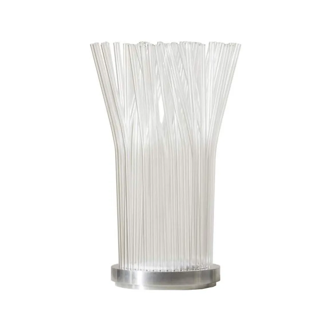 Le concept qui sous-tend la lampe de table Fluxus-E a été conçu à l’origine par Paolo Ulian pour une exposition consacrée aux inventions du Baron Bich, dont Ugo La Pietra était le curateur. La référence à la quintessence du stylo apparait immédiatement dans les bras articulés de la lampe, fabriqués à l’époque à partir de tubes en plastique transparent qui évoquent la célèbre invention. En 2001, Ulian a perfectionné ce projet pour un usage commercial, en lui conservant sa forme sculpturale grâce à des tubes en verre borosilicaté transparent pouvant être pliés pour obtenir des formes diverses. Cassina a minutieusement développé Fluxus-E en utilisant un module LED qui éclaire à la fois le corps central de la lampe, tandis que de éléments LED spécifiques placés sous chaque tube projettent la lumière à travers le verre et diffusent une lueur chaleureuse. Orienté vers l’extérieur comme la corolle d’une fleur de lotus, vers l’intérieur comme une fleur pas encore éclose, alterné pour créer des formes plus élaborées ou orienté de manière aléatoire comme une anémone de mer, chaque tube diffuseur de lumière peut être tourné d’un simple geste, ce qui en fait une lampe unique. Composée de deux matériaux seulement, le verre pour les tubes et l’aluminium pour la base, la pièce peut être facilement assemblée et démontée, tant pour la livraison que pour le nettoyage, et désassemblée à la fin de son cycle de vie afin de faciliter le processus de recyclage.