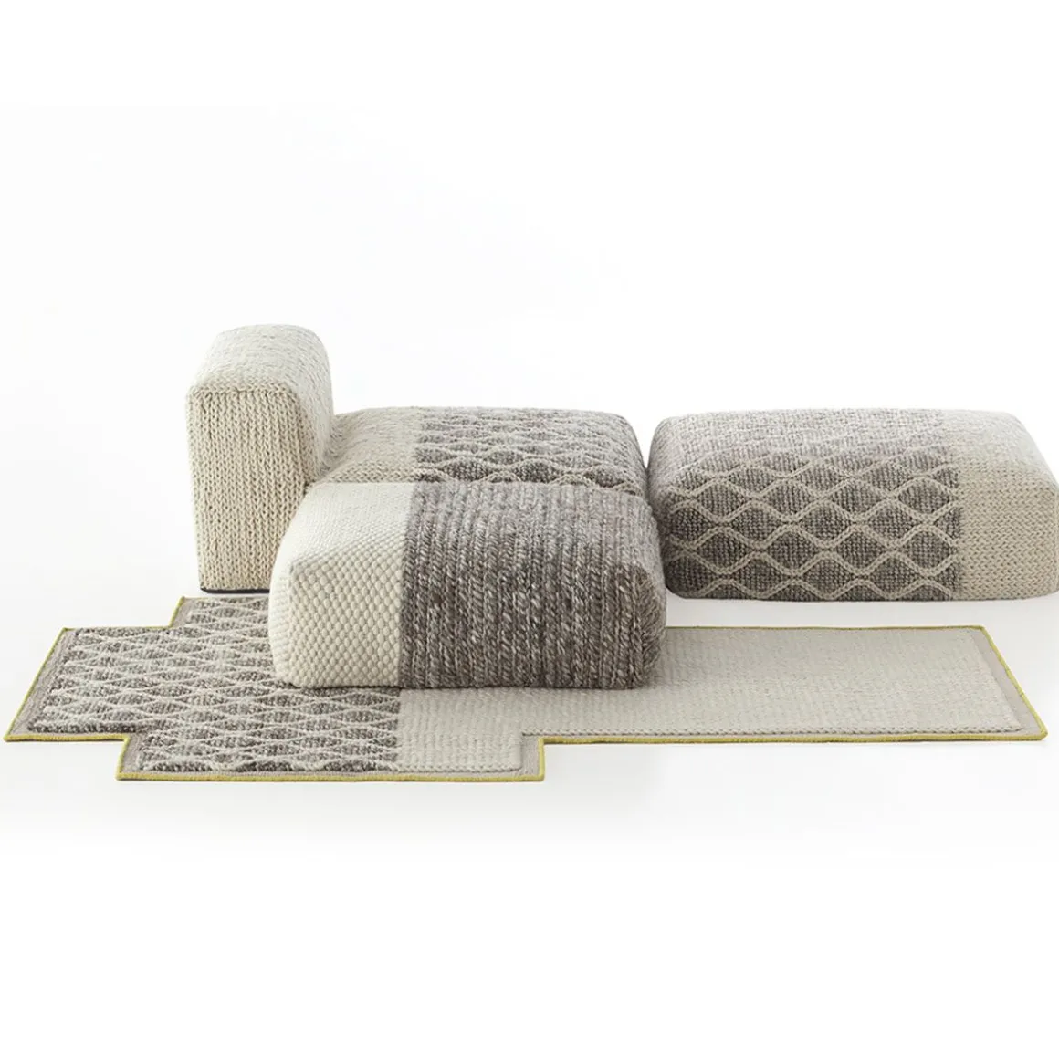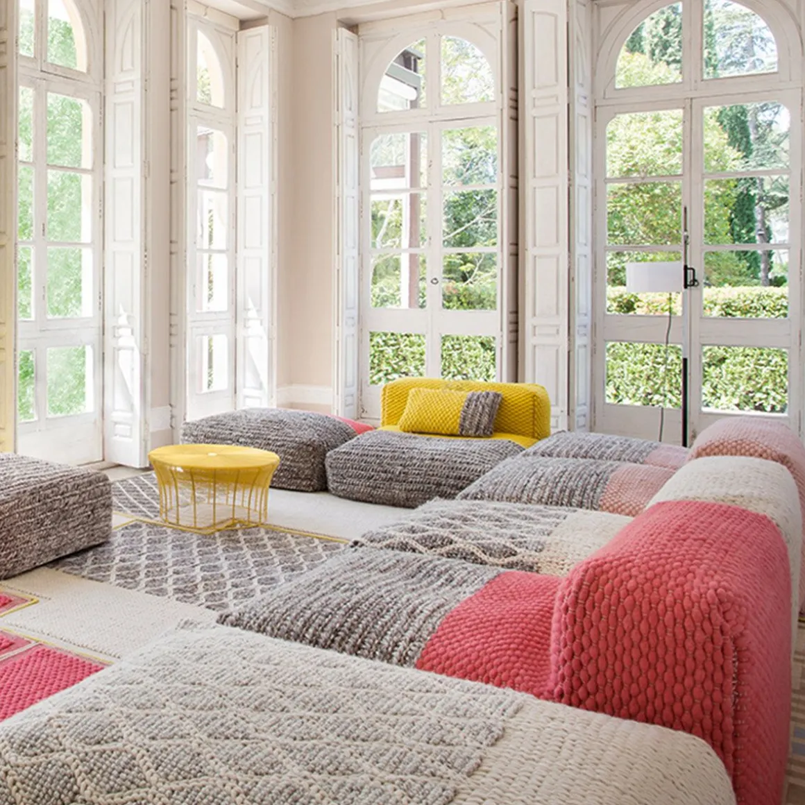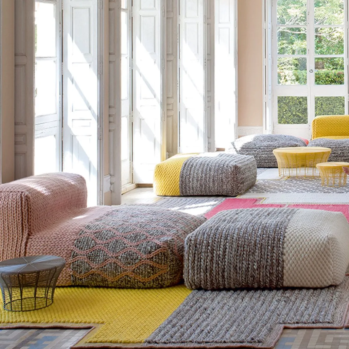 La collection Mangas Space est la suite de la recherche de textures et de volumes généreux initiées par la créatrice Patricia Urquiola avec Mangs Original. C’est une collection similaire en termes de textures, mais plus modulable, avec des éléments de plus en plus volumineux et une palette de couleurs plus audacieuse qui parvient à brouiller la ligne entre tapis et meubles.
