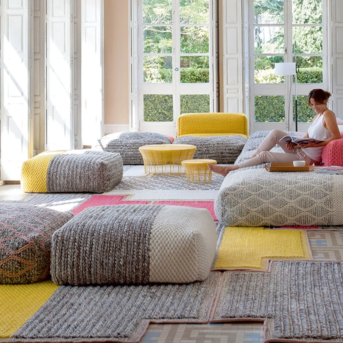 La collection Mangas Space est la suite de la recherche de textures et de volumes généreux initiées par la créatrice Patricia Urquiola avec Mangs Original. C’est une collection similaire en termes de textures, mais plus modulable, avec des éléments de plus en plus volumineux et une palette de couleurs plus audacieuse qui parvient à brouiller la ligne entre tapis et meubles.