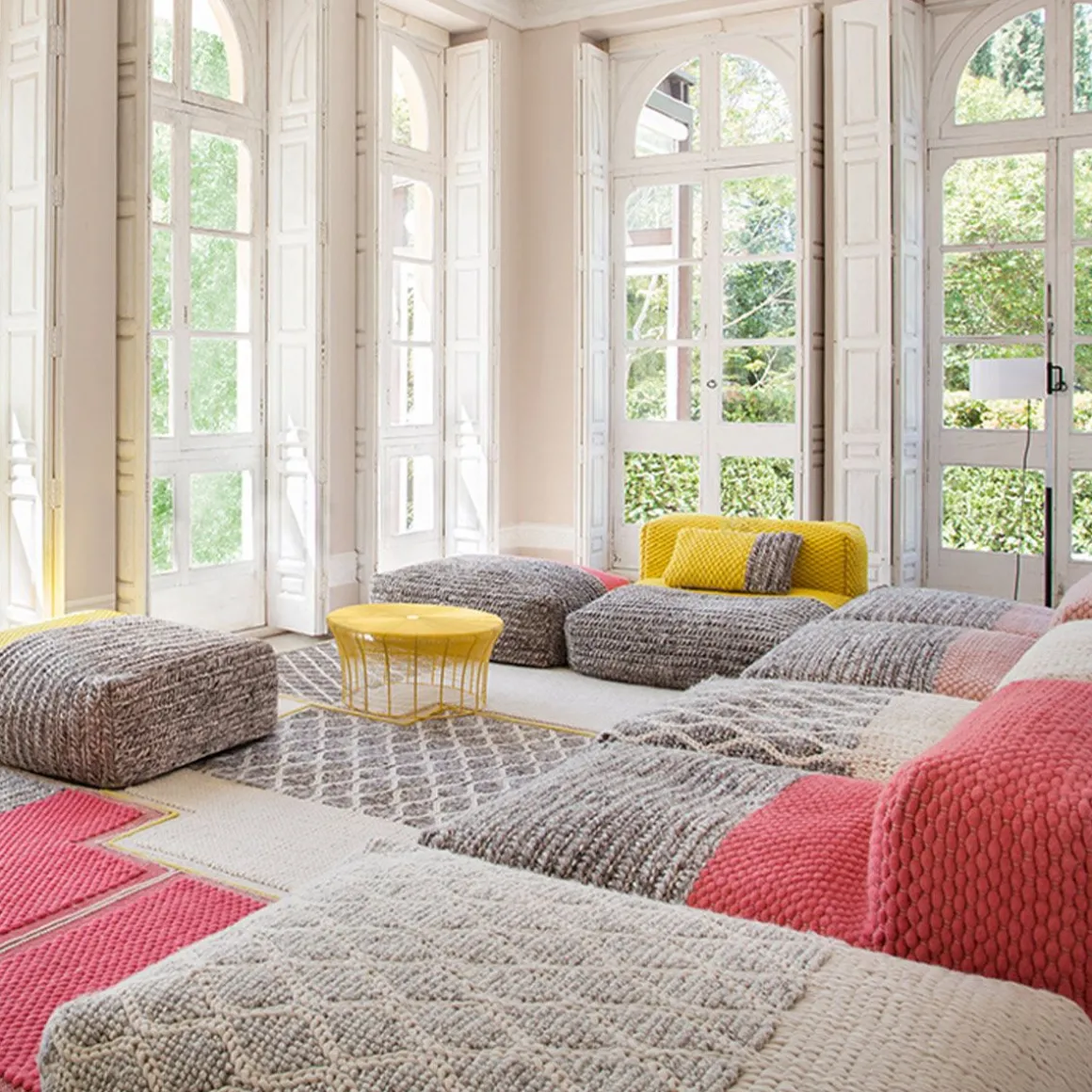 La collection Mangas Space est la suite de la recherche de textures et de volumes généreux initiées par la créatrice Patricia Urquiola avec Mangs Original. C’est une collection similaire en termes de textures, mais plus modulable, avec des éléments de plus en plus volumineux et une palette de couleurs plus audacieuse qui parvient à brouiller la ligne entre tapis et meubles.