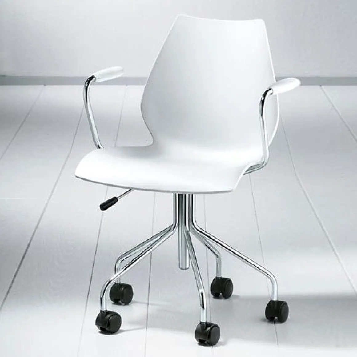 Maui est un fauteuil dessiné par Vico Magistretti pour Kartell. Toujours dans la famille Maui, la version fauteuil à roulettes est disponible avec pompe et accoudoirs. L’assise en polypropylène est fixée sur une structure en acier chromé. Les roulettes sont fixées à une base en acier chromé formée de 5 branches rayonnant du centre. Grâce au confort de son assise et à sa légèreté, la version de Maui sur roulettes est une excellente solution pour le bureau informel et l’home office.