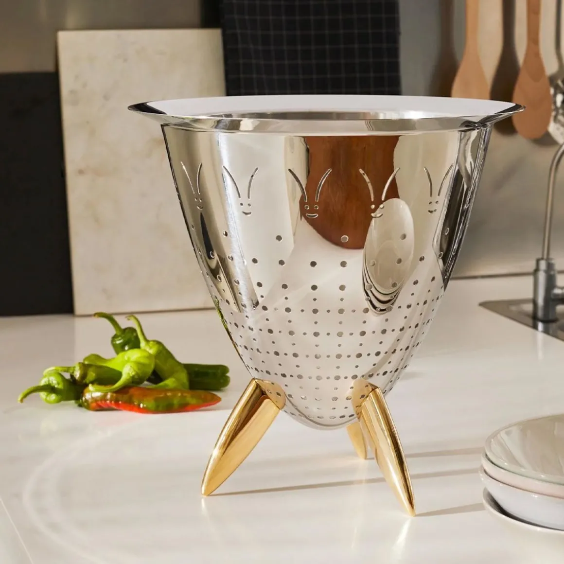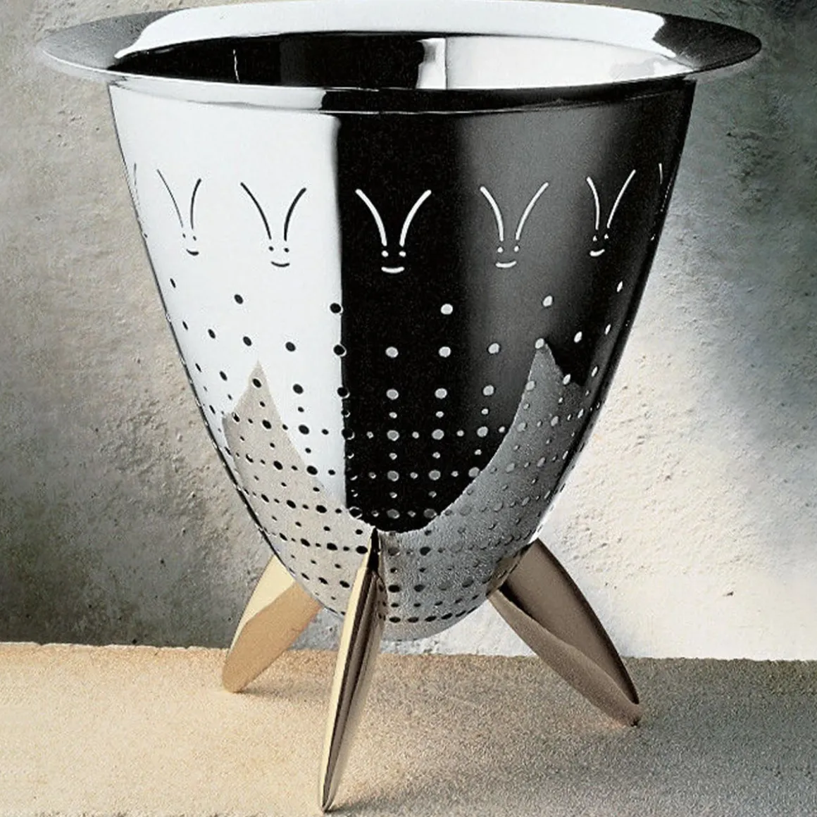 Max Le chinois de Alessi par Philippe Starck. La passoire Max le chinois est un objet ironique qui prend place dans les rituels de la cuisine. Conçu par Philippe Starck, le résultat final offre un impact fort et une expérience élevée, ce que vous ne pouvez dire pour aucun autre passoire. Construit en acier inoxyadabke, avec des pieds en laiton moulé pour une utilisation facile.
