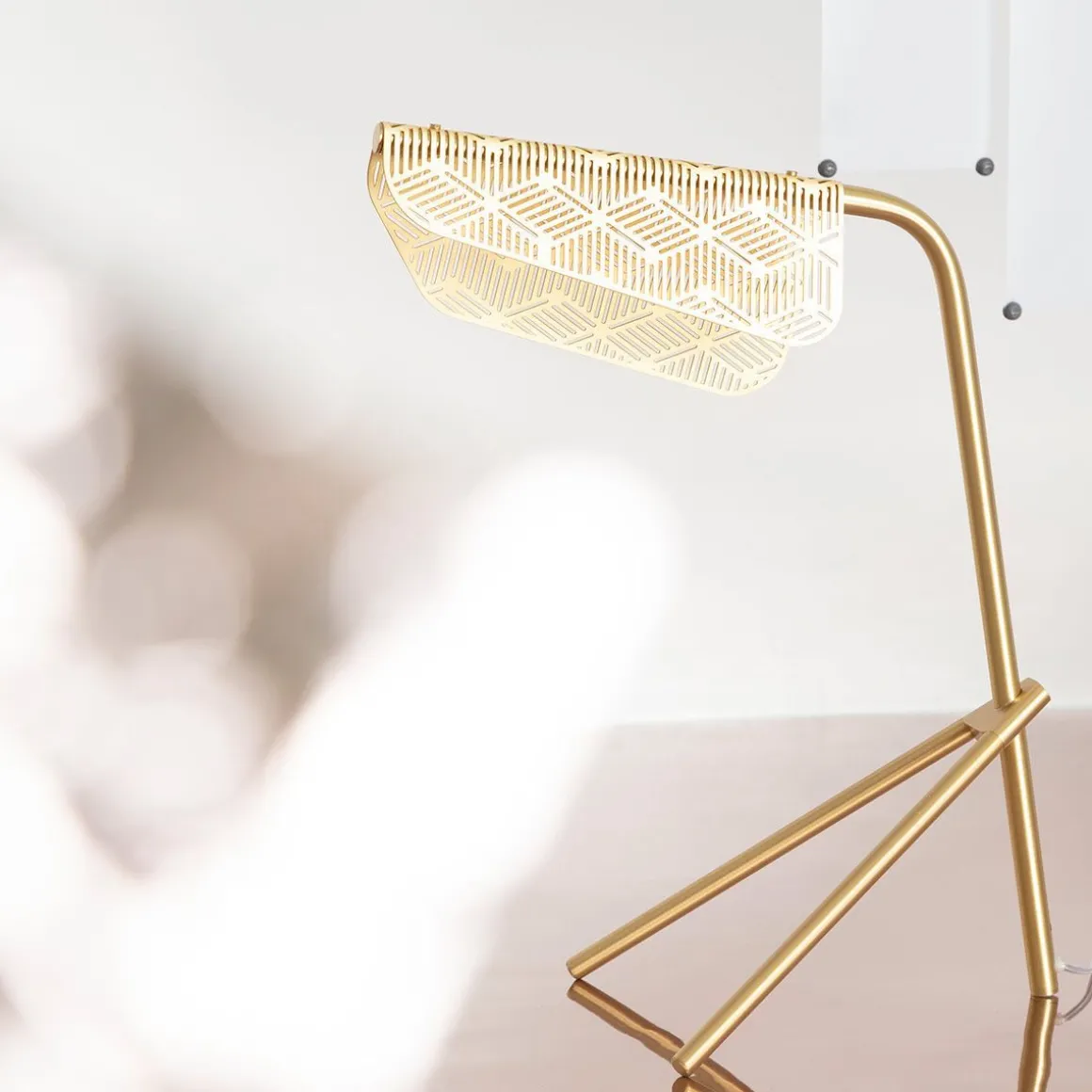 Reposant sur une structure légère, le linge de métal sculpte et diffuse la lumière grâce au motif dynamique et géométrique. Voici le modèle lampe de table.