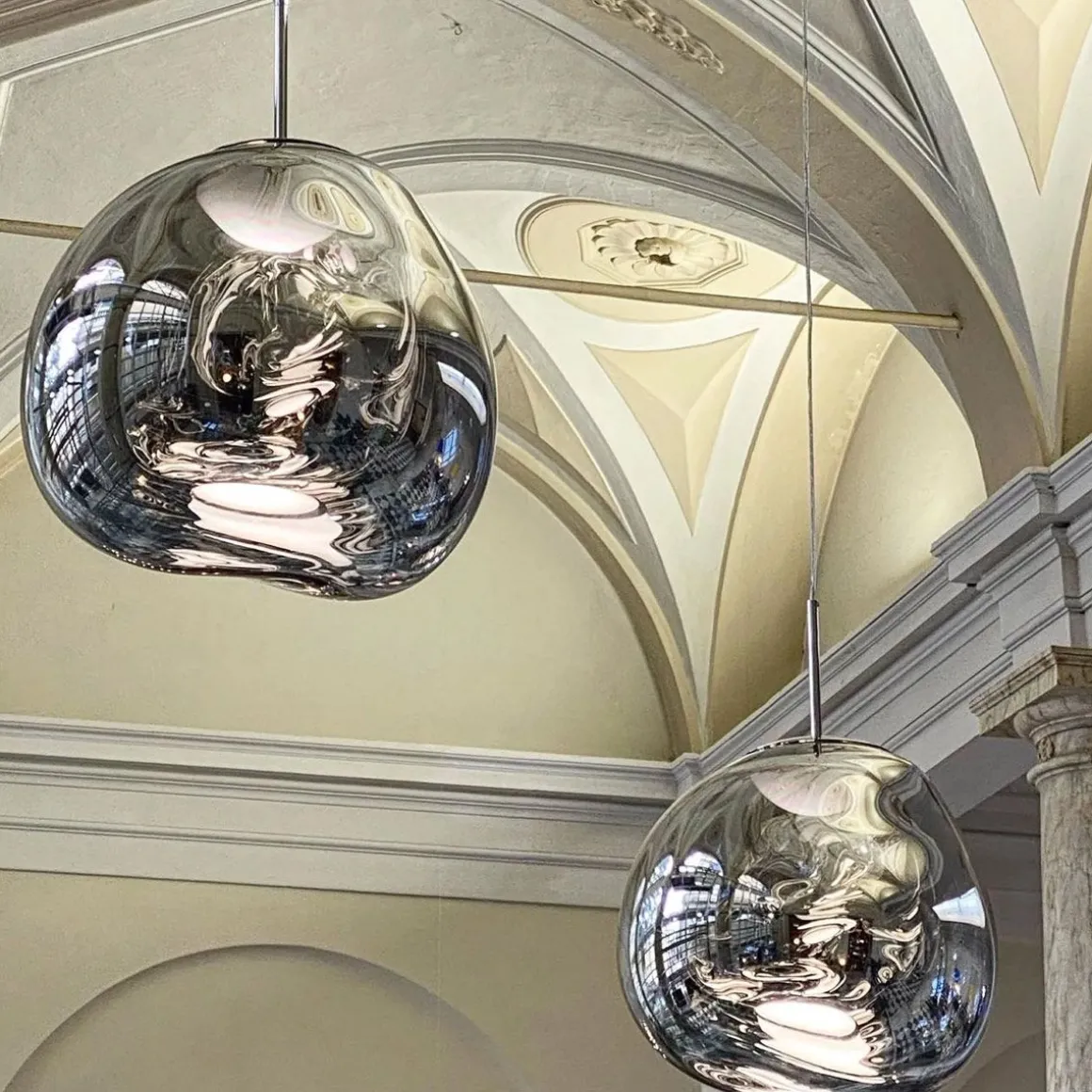Avec Melt, nos expériences dans le domaine technologiquement avancé de la prise de métallisation de vide prennent une nouvelle dimension. Melt Copper est un globe déformé né de notre collaboration avec le collectif radical suédois Design Front. Les reflets de lumière autour des surfaces inégales créent un effet spectaculaire dans le verre soufflé. Melt Copper est translucide quand il est allumé et procure un effet miroir une fois éteint. La nuit, cette suspension émet une lumière attractive et hallucinogène, apparentée aux images du cosmos du télescope Hubble. En 2019, la marque a enrichi sa gamme de luminaires Melt avec un anneau LED Tom Dixon sur mesure qui est intégré au raccord.
