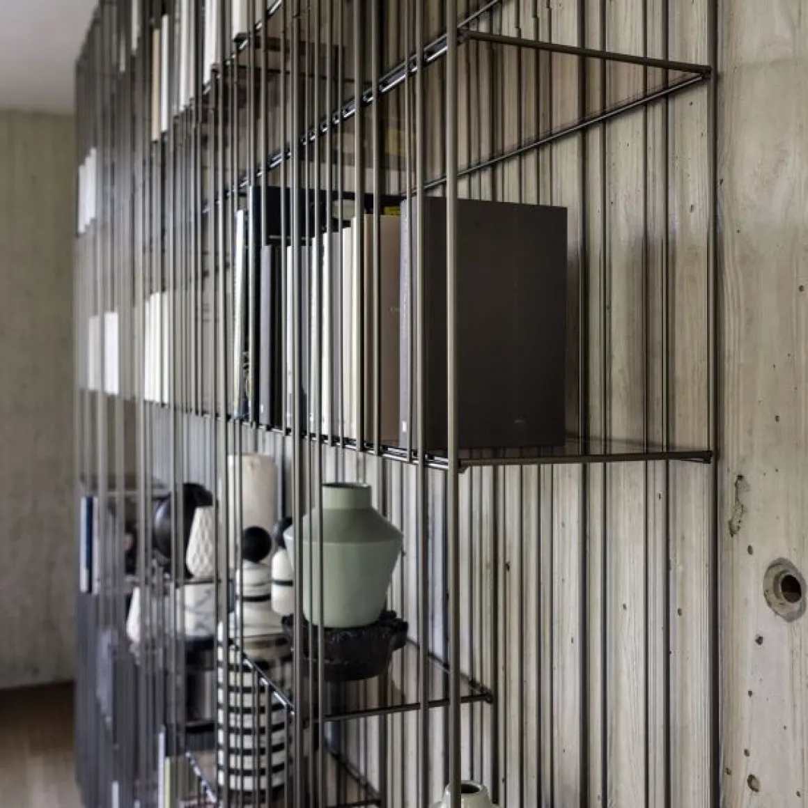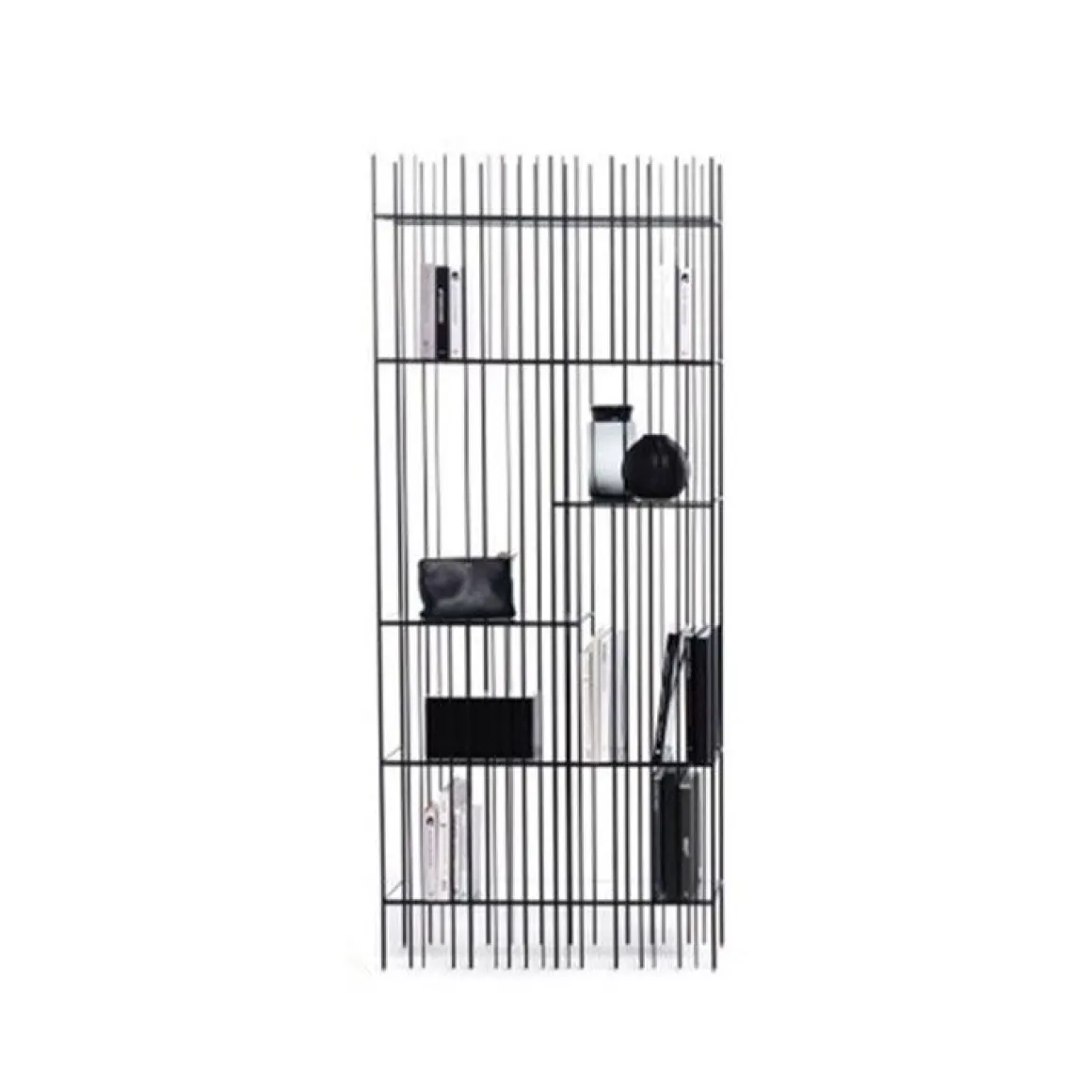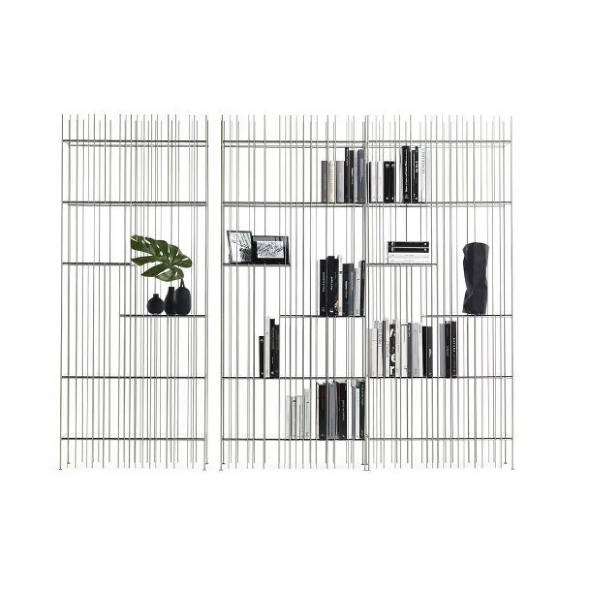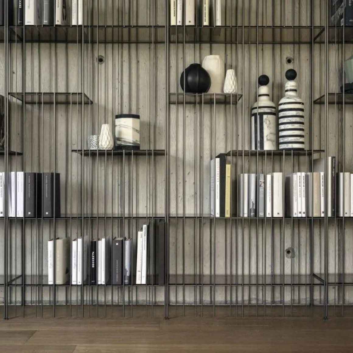 Metrica est une bibliothèque en métal disponible dans les finitions titane, bruni et or avec des étagères en cristal transparent. La structure est simple, le rythme est marqué par les tiges de fer fixées à différents intervalles sur une structure ouvertement rigoureuse à l’intérieur de laquelle les livres et objets insérés complètent la forme en écrivant de temps en temps de nouvelles compositions.