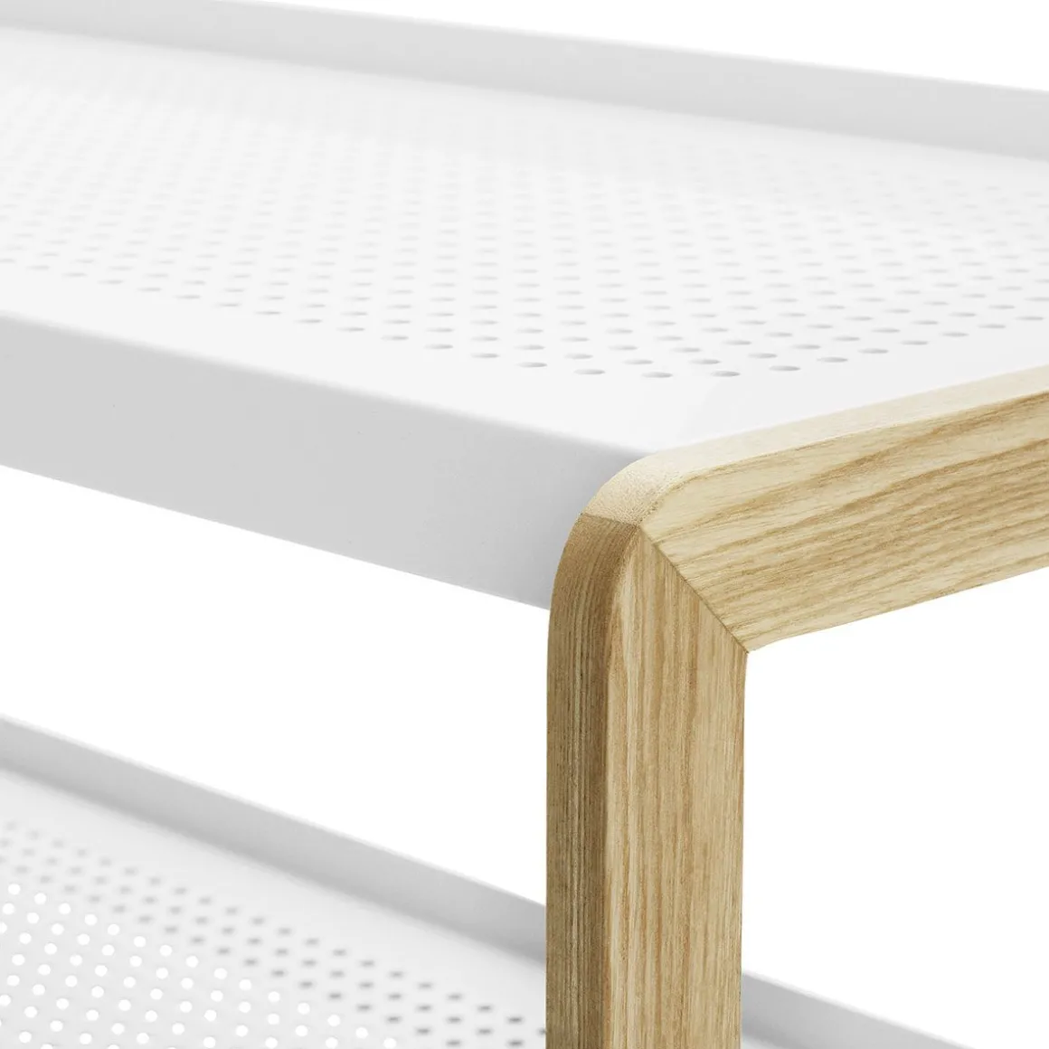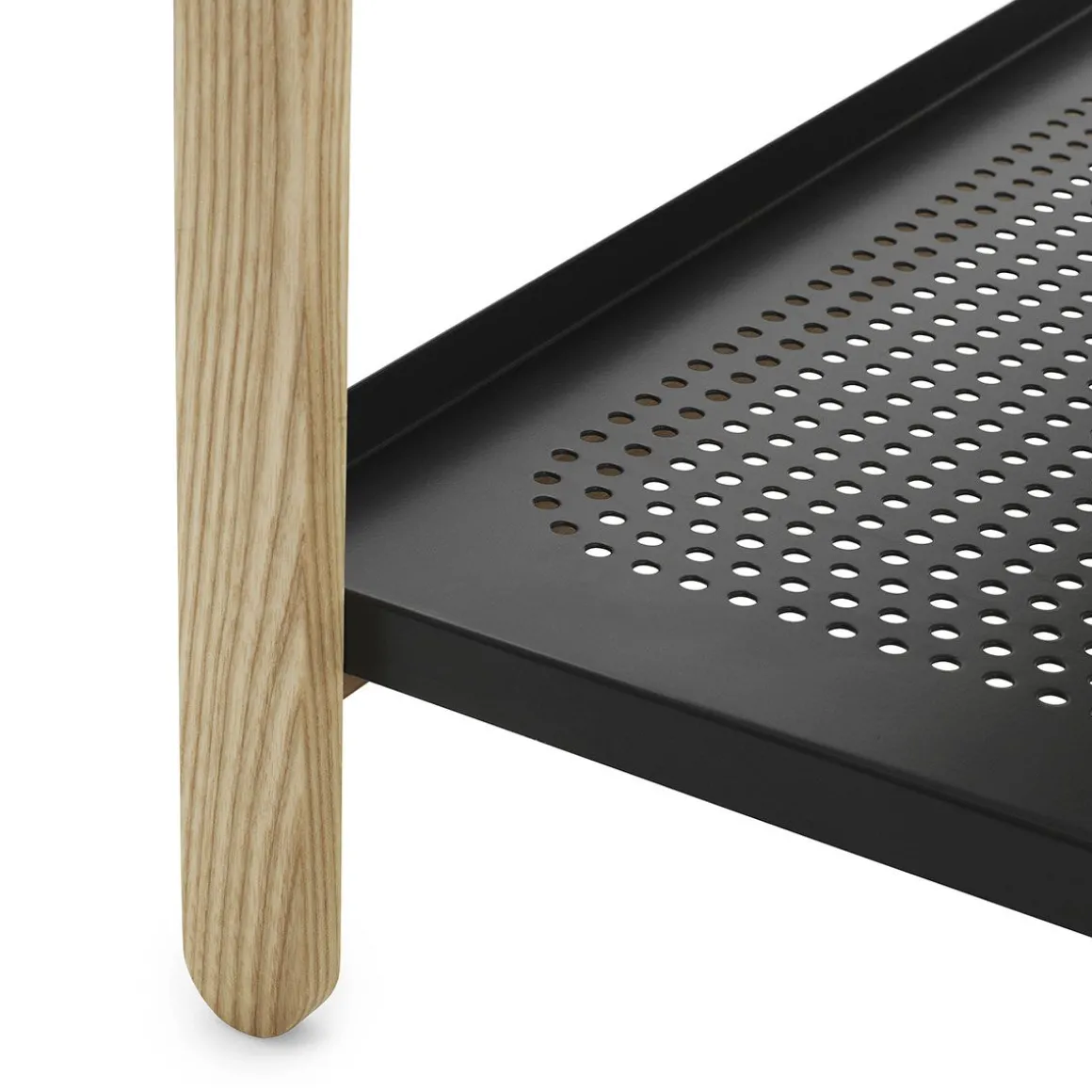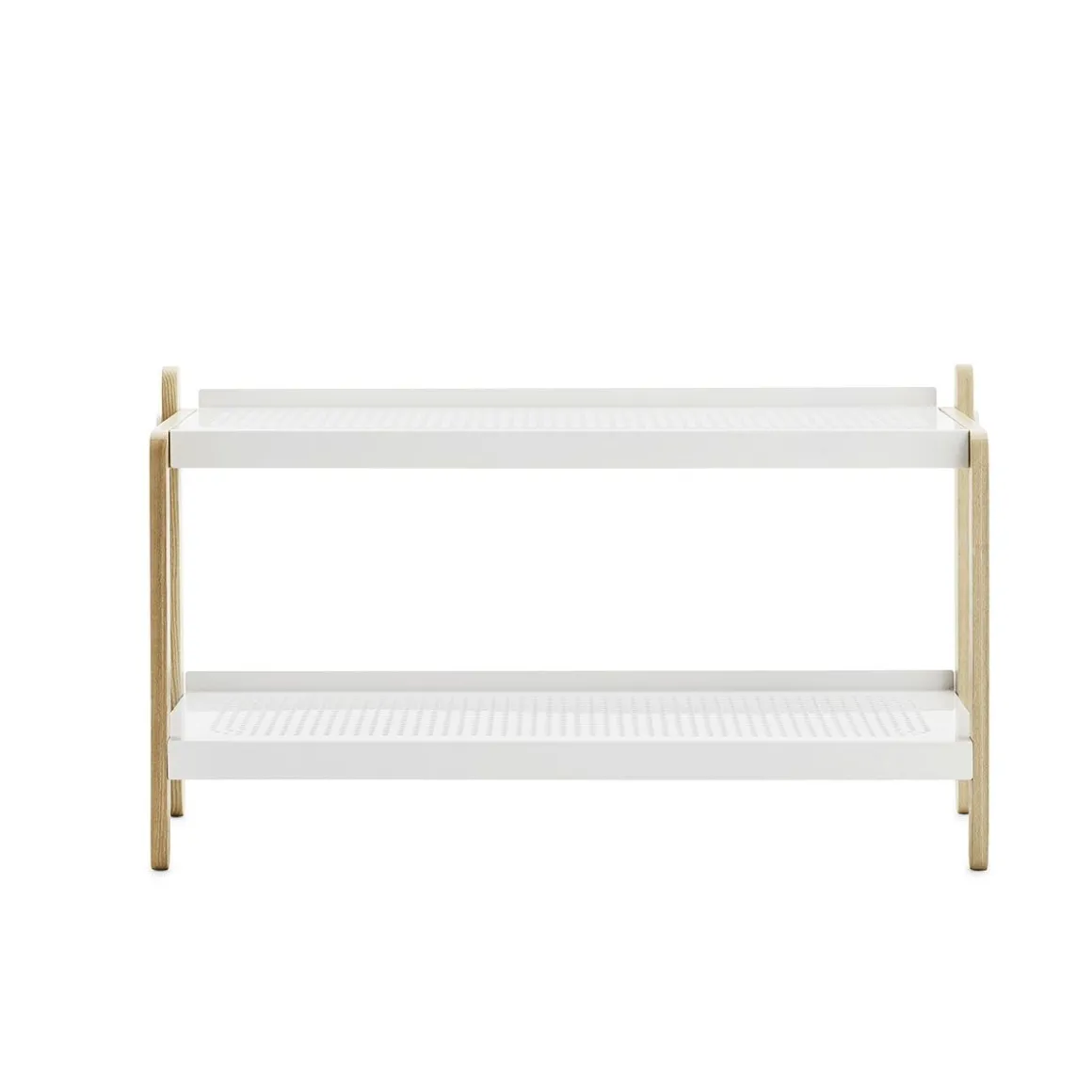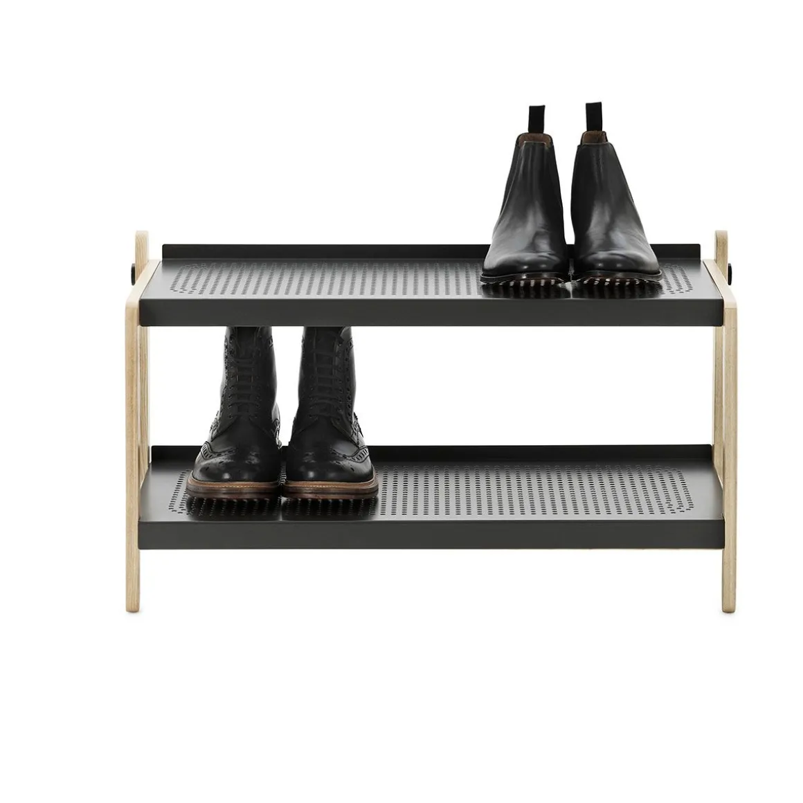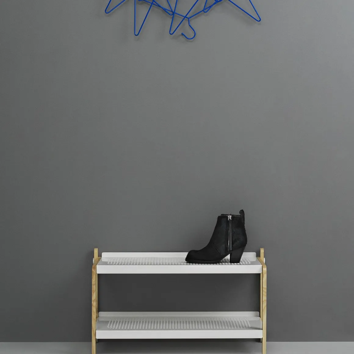 Le meuble à chaussures Sko est constitué d’acier et de frêne. L’acier peint apporte une touche contemporaine et sublime l’exquise saveur scandinave traditionnelle du bois. Sko est composé d’un montant en frêne accueillant deux plaques en acier perforées. Il trouvera sa place dans l’entrée, la chambre à coucher, ou partout où vous avez besoin d’un espace de rangement pour vos chaussures aussi bien que pour vos bottes. Dans le plus pur style moderne, ce meuble à chaussures simple et minimaliste élimine le superflu : le designer Simon Legald est allé à l’essentiel, afin d’en faire ressortir les détails. Les vis et boulons de ce rangement sont mis en valeur, tandis que ses étagères perforées créent un jeu d’ombres changeant sur le sol. Sko est le petit frère du porte-habit Toj, également conçu par Simon Legald pour Normann Copenhagen. Ces deux meubles se fondent sur des principes identiques et sont caractérisés par le même minimalisme.
