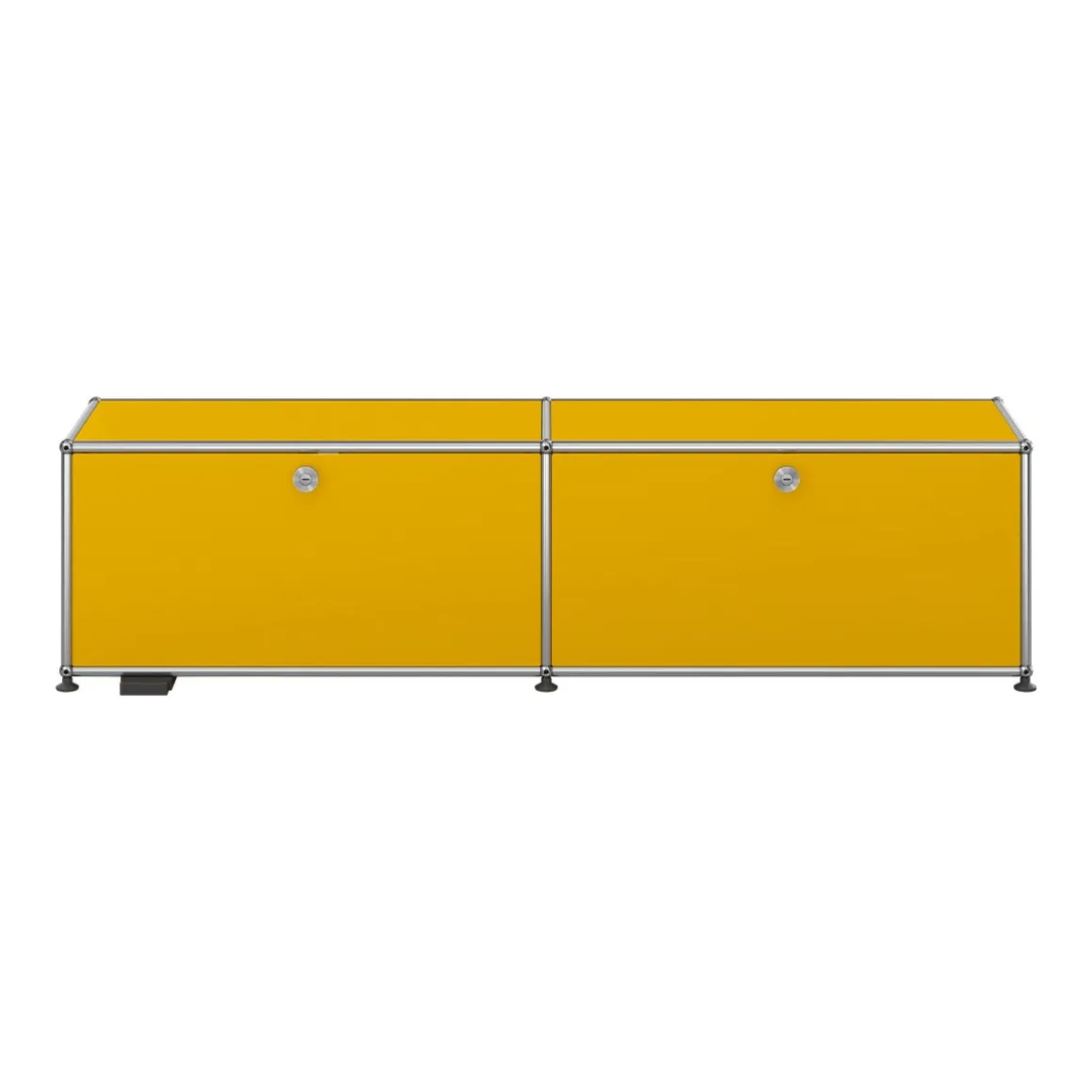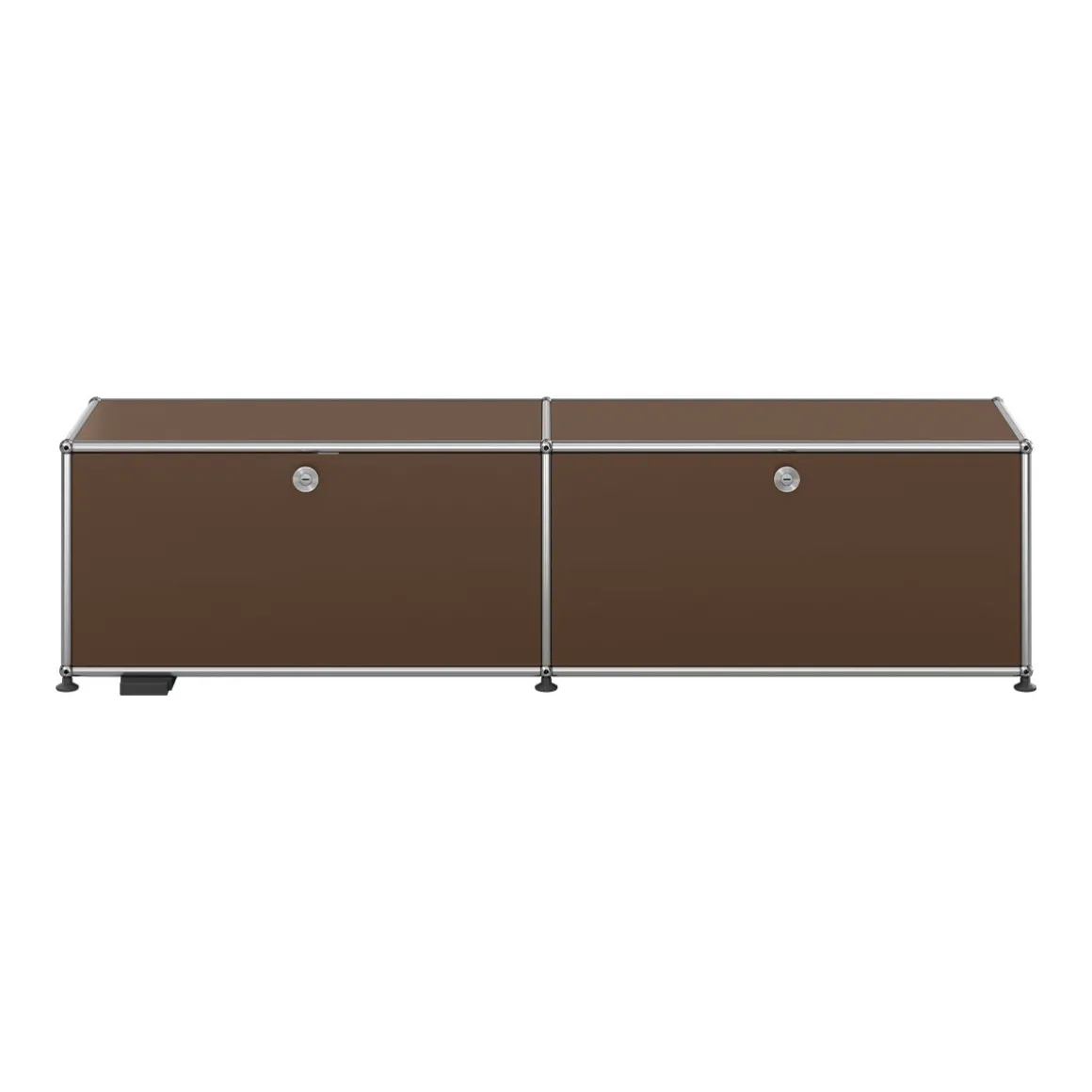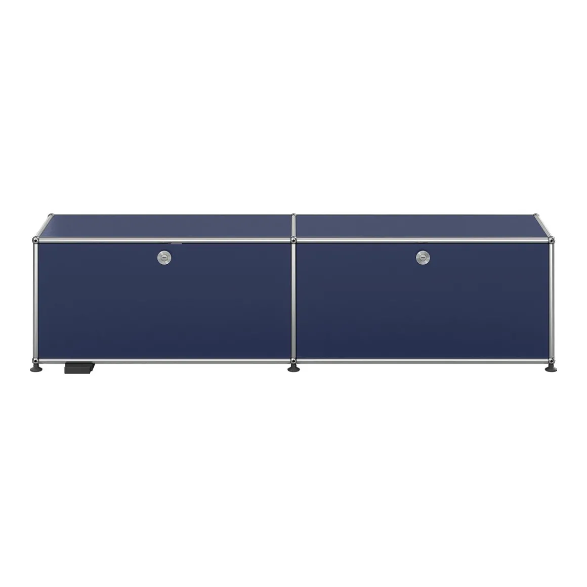 Meuble bas composé de 2 modules équipés de portes abattantes (poignées sans serrure), 1 rayon intermédiaire et 1 passage de cable. Eclairage blanc chaud à intensité variable.