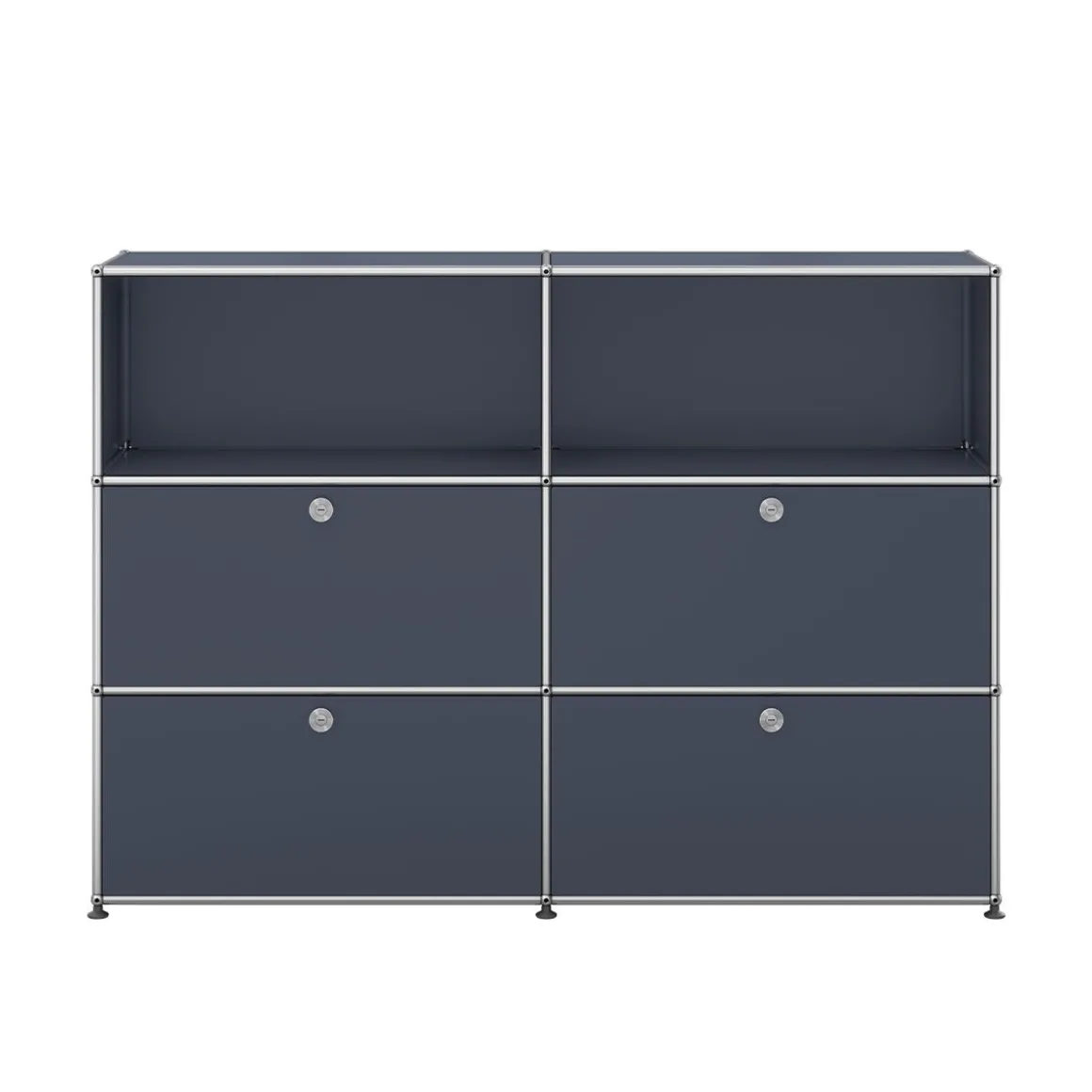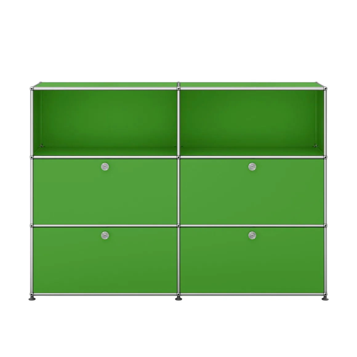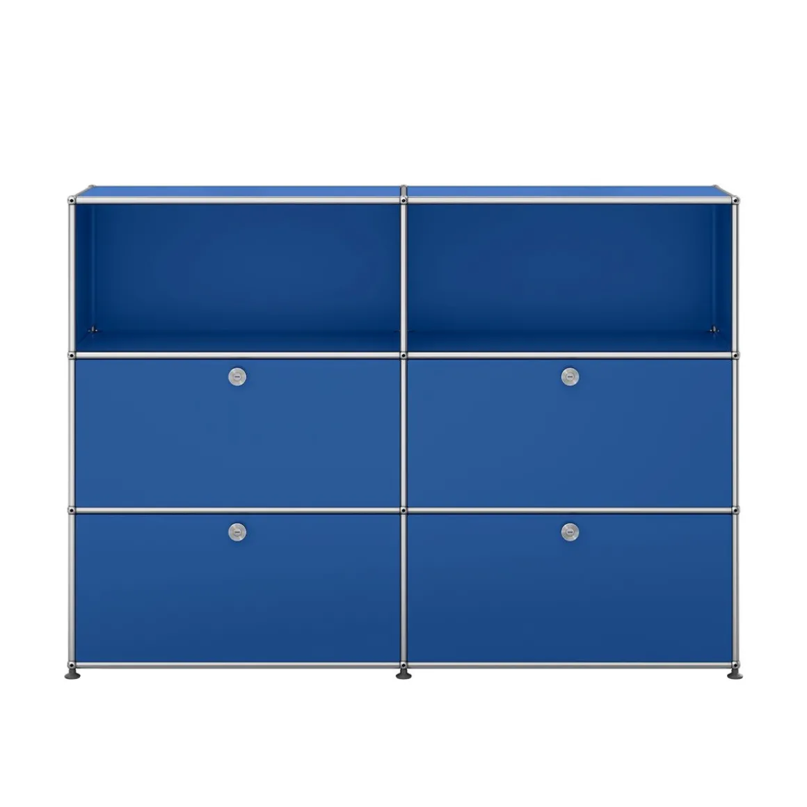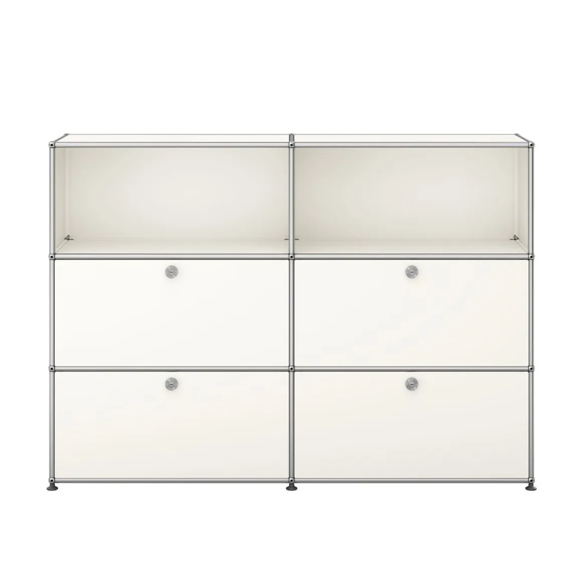 Meuble de rangement composé de 6 modules dont 4 équipés de portes abattantes (poignées sans serrure).