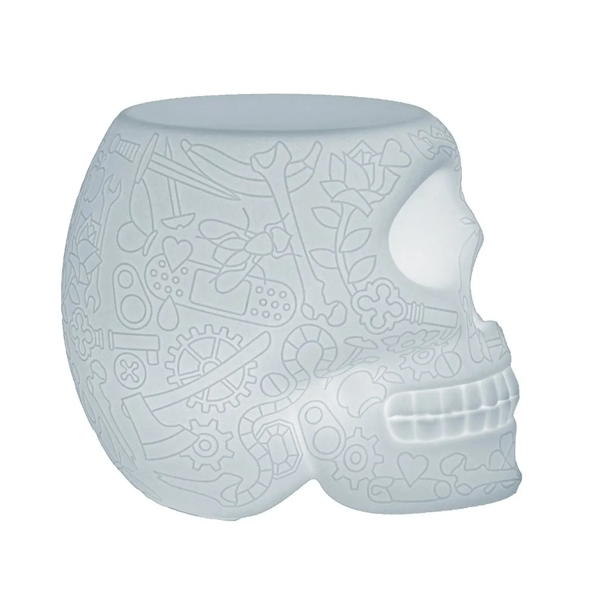 Mexico de Qeeboo par Studio Job. Mexico, conçue par Studio Job, est une lampe en forme de crâne avec un motif graphique sur la surface, fonctionnant également comme tabouret et table d’appoint. Rappelant les crânes peints traditionnels du pays du même nom, le Mexique est un rappel fantaisiste du caractère cyclique de notre présence sur Terre, pour exorciser la mort et célébrer la vie. Convient aux salons, aux salles à manger et aux espaces extérieurs. Sans fil, doté d’une batterie rechargeable, d’une lumière LED et de 16 couleurs RVB interchangeables différentes, il peut être régulé à distance par télécommande.