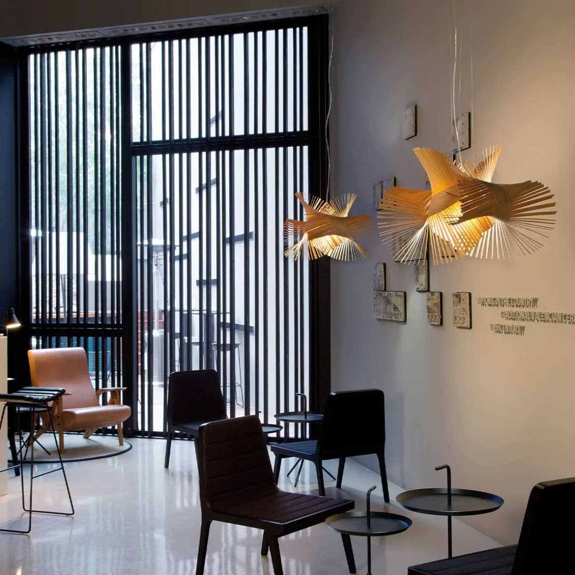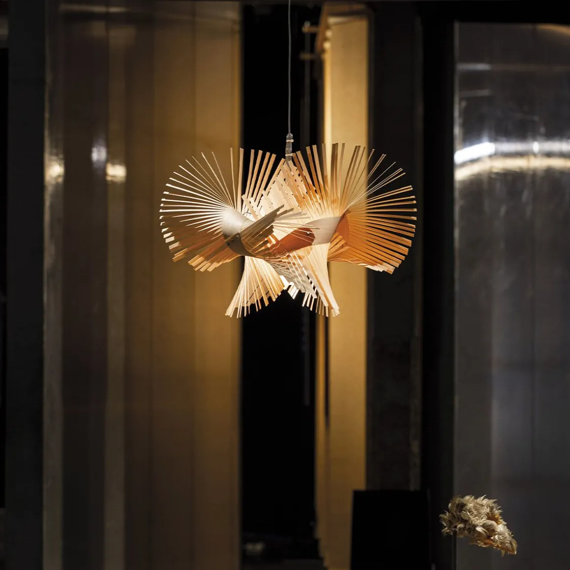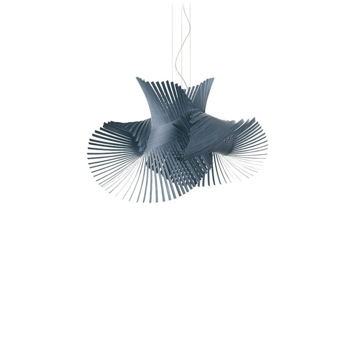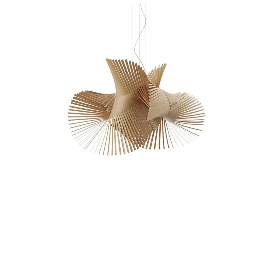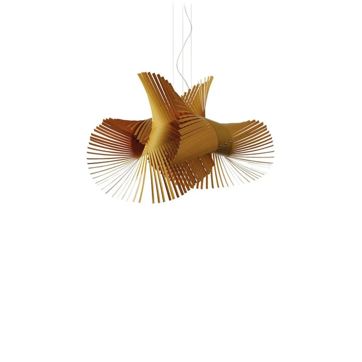 La lampe Mikado tire son nom du jeu classique de Pick-up-sticks, où les baguettes sont regroupées et qui, une fois libérées, tombent dans un fouillis circulaire. Une lumière rayonnante, les bandes de placage en bois de Mikado s’étendent vers l’extérieurn évoquant le plumage d’un oiseau. Intelligemment conçue, la forme du Mikado est à la fois chaotique et harmonieuse. Le Mikado est un esprit libre, possédant un air de nonchalance et une fanfaronne insipide. C’est une lumière dont le profil ressemble à un kaléisdocop de motif coruscating.