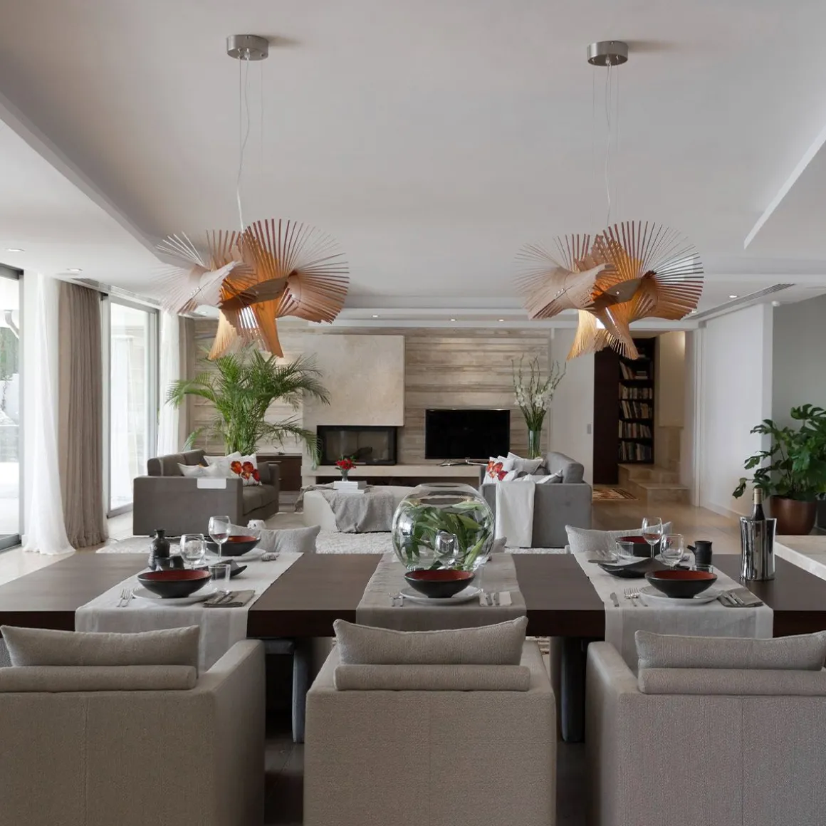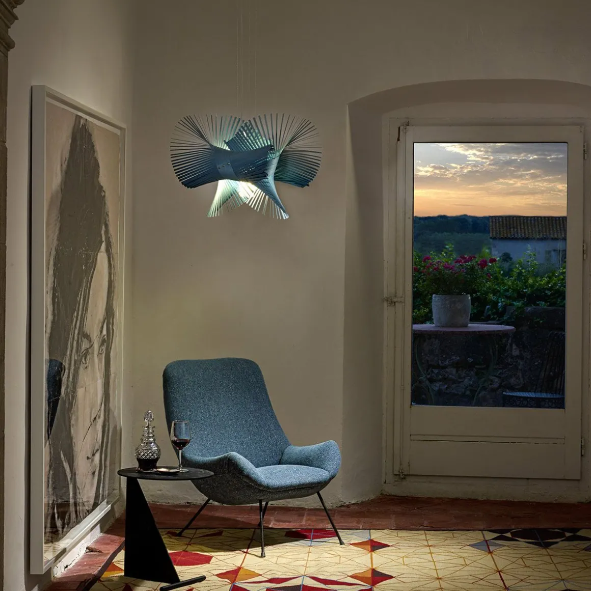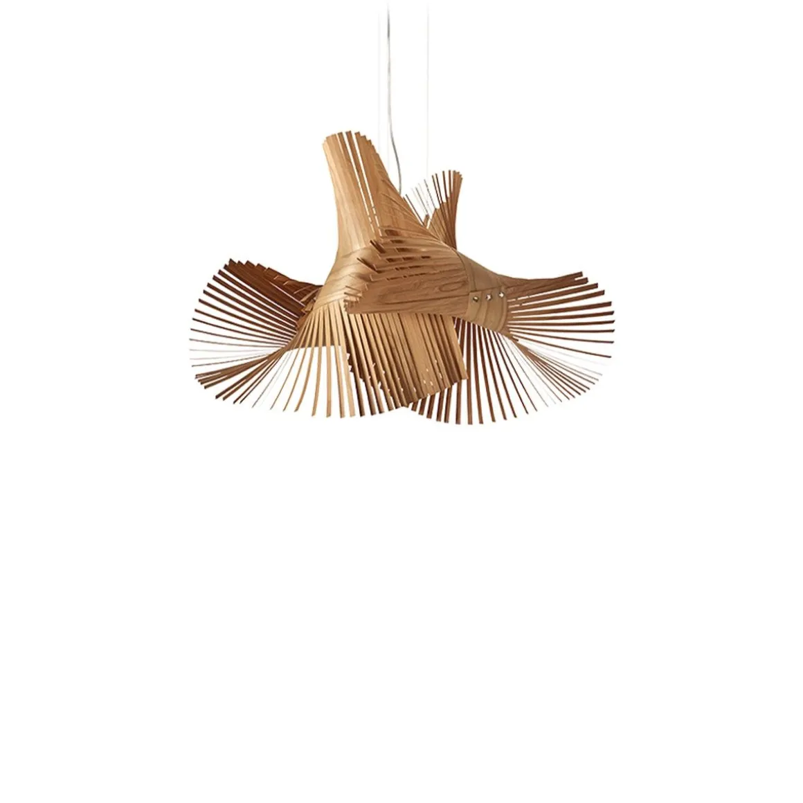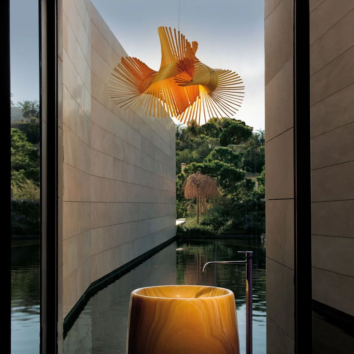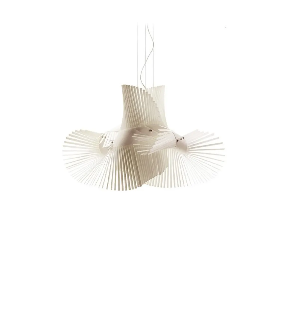 La lampe Mikado tire son nom du jeu classique de Pick-up-sticks, où les baguettes sont regroupées et qui, une fois libérées, tombent dans un fouillis circulaire. Une lumière rayonnante, les bandes de placage en bois de Mikado s’étendent vers l’extérieurn évoquant le plumage d’un oiseau. Intelligemment conçue, la forme du Mikado est à la fois chaotique et harmonieuse. Le Mikado est un esprit libre, possédant un air de nonchalance et une fanfaronne insipide. C’est une lumière dont le profil ressemble à un kaléisdocop de motif coruscating.