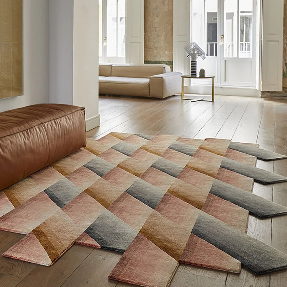 Mirage est un tapis atypique, non seulement en raison de sa forme irrégulière, mais aussi parce qu’il génère un effet particulier tant sur le spectateur que sur l’espace qu’il occupe. L’alternance des tons de l’orientation différente des dégradés génère un effet optique attractif, réalisé é avec de la laine de Nouvelle-Zélande. Le mirage ne cause pas l’indifférence.
