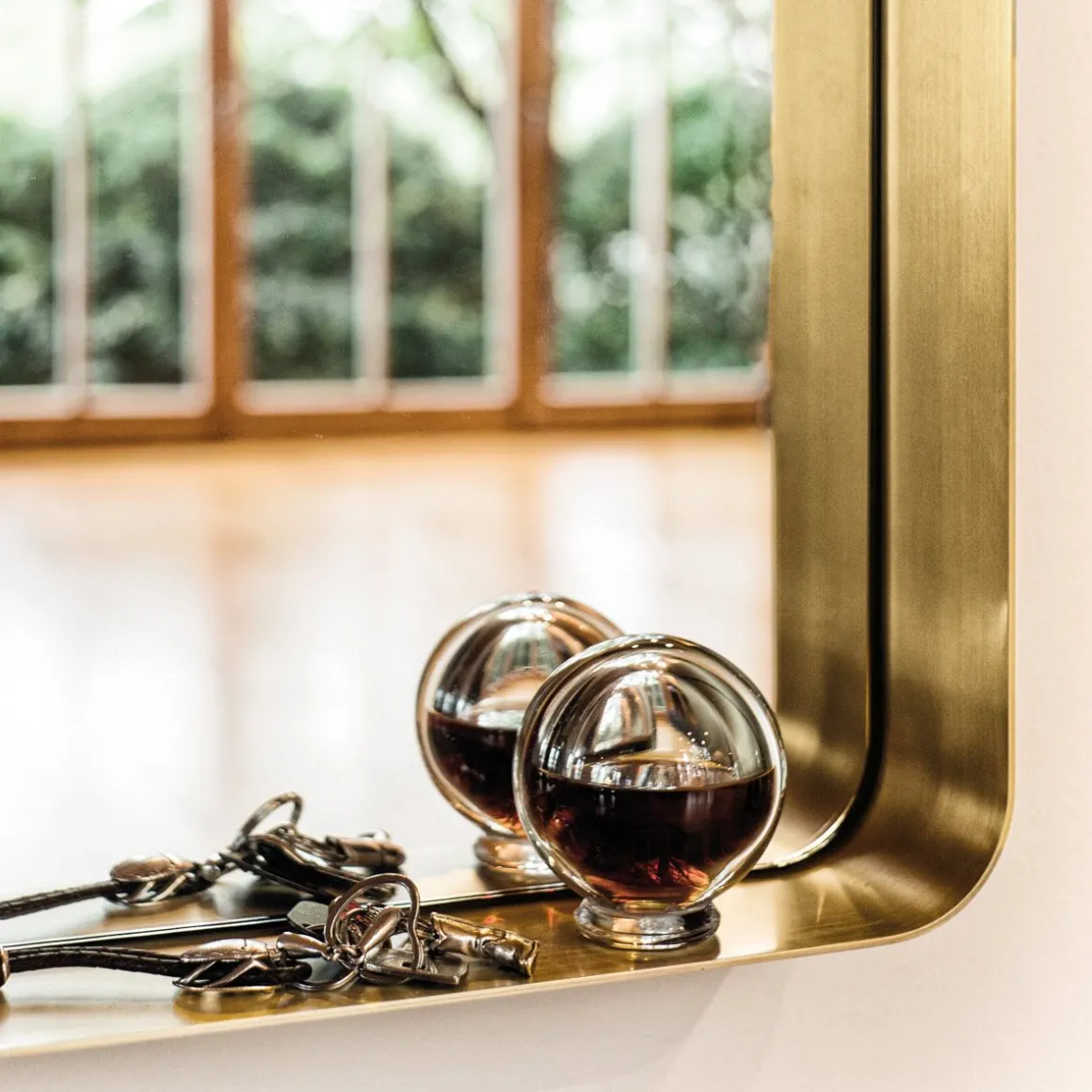 Le cadre en laiton en forme de ruban du miroir est fixé au mur comme zone de stockage pour les flacons, les cosmétiques ou les petites trouvailles, qui reçoivent ici un cadre parfait, une scène qui améliore l’effet de chaque objet.