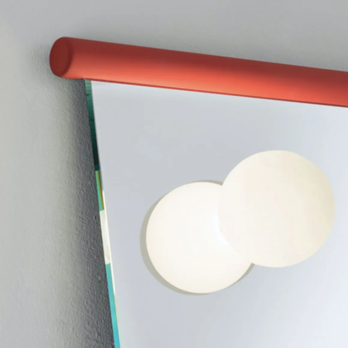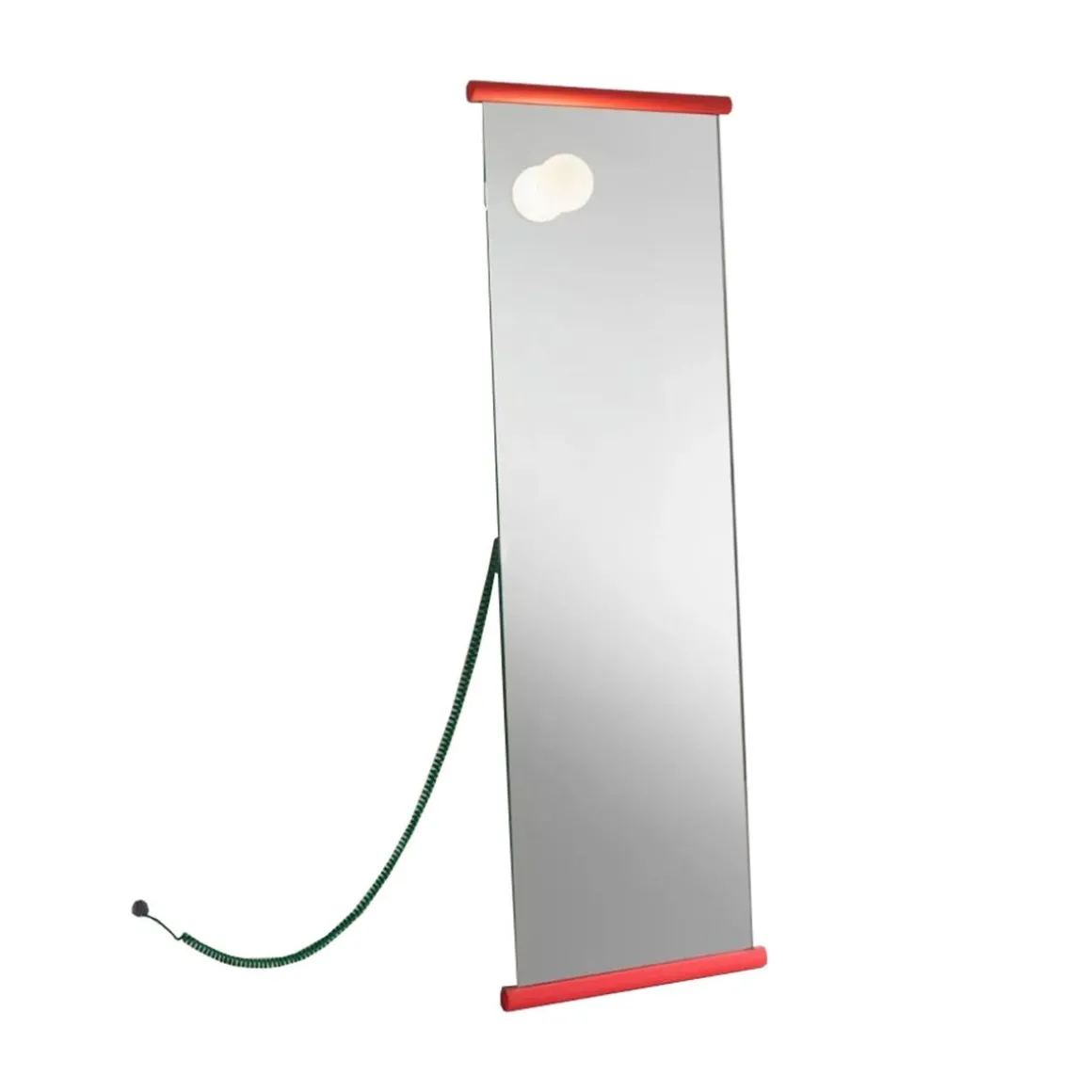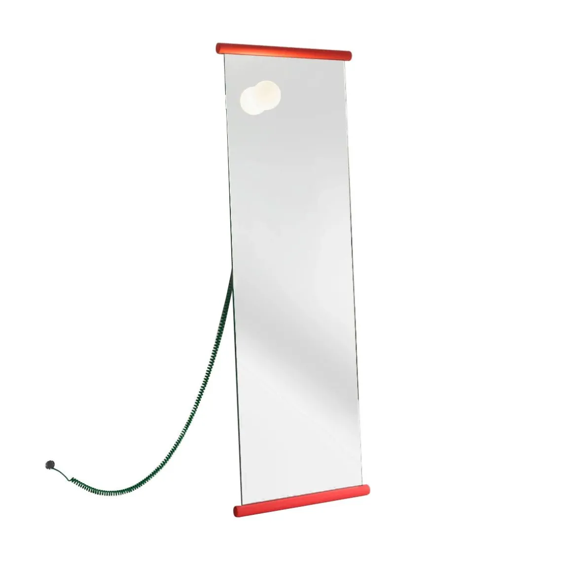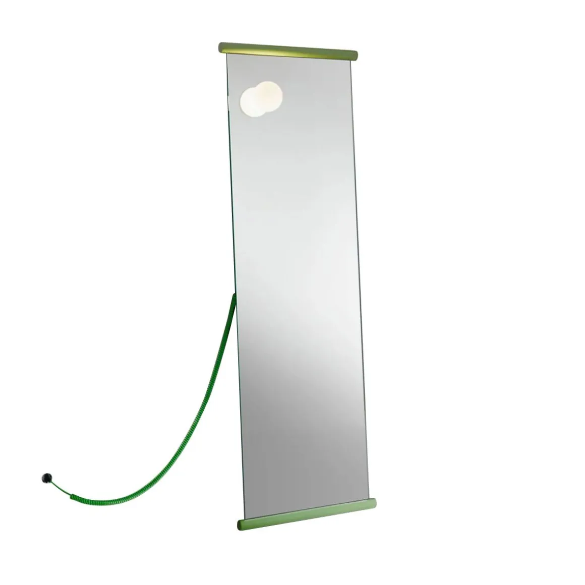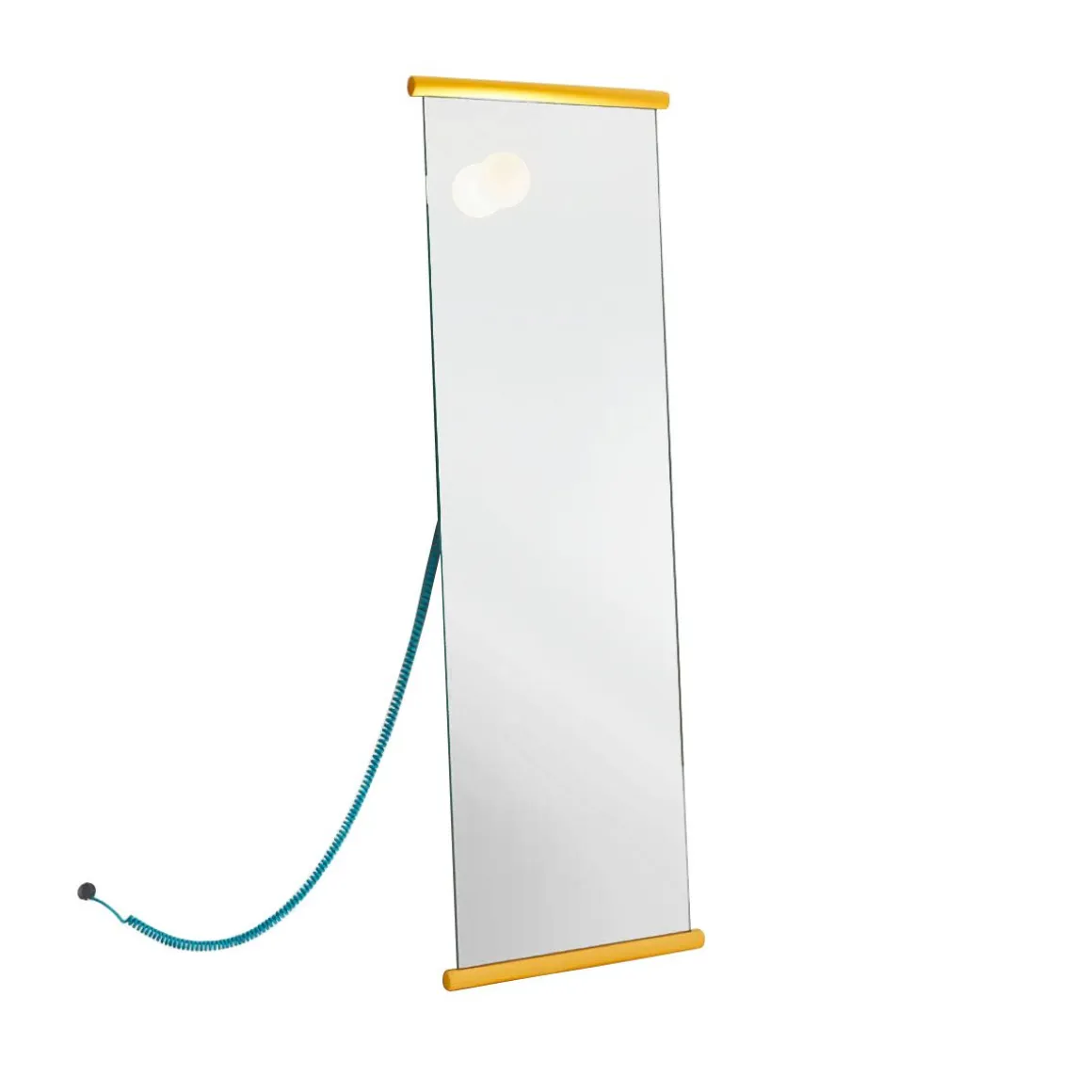 Miroir sur pied en verre extralight 12 mm, avec bords supérieurs et inférieurs détaillés de deux barres cylindriques peintes avec effet caoutchouc dans les couleurs : jaune, vert ou orange.