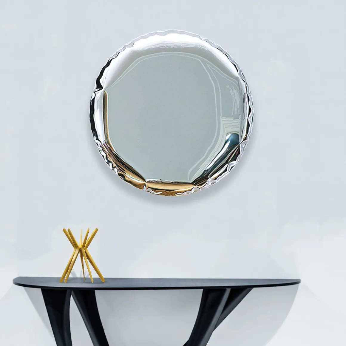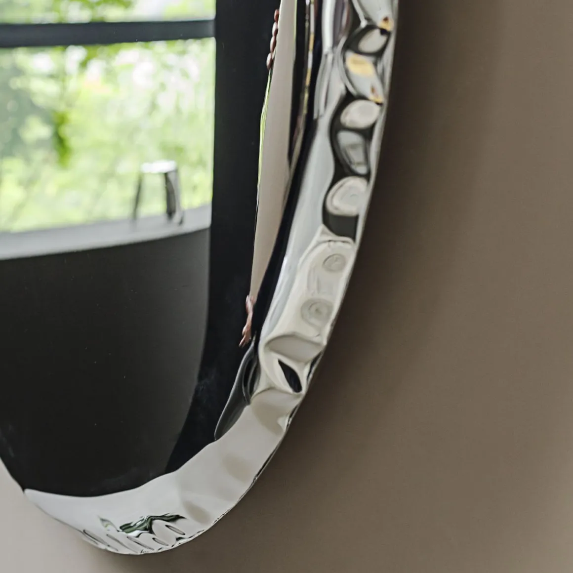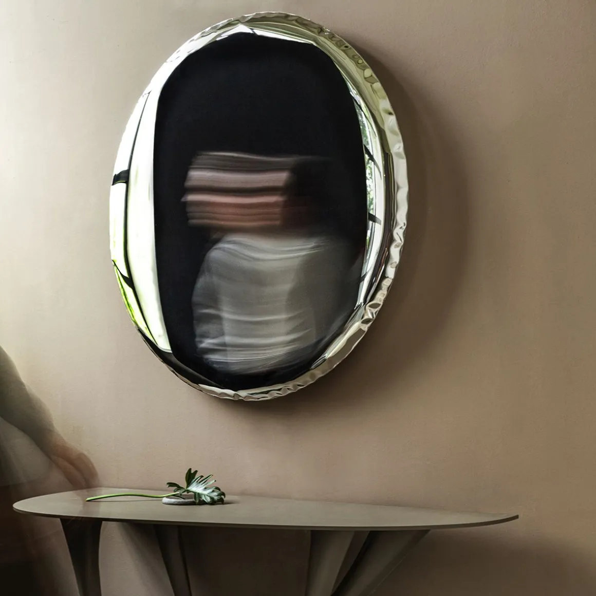 Le miroir OKO est un objet qui, grâce à sa nature réfléchissante, joue avec la perception humaine et donne l’impression d’être une entité qui regarde activement. Il s’agit d’une sculpture légère inspirée de formes liquides organiques et ressemblant à une énorme gouttelette de mercure argenté. Accroché au mur, on dirait qu’il flotte quelques millimètres à côté, comme une goutte d’eau sur la surface du verre. On dit que les yeux sont le miroir de l’âme. Par conséquent, OKO pourrait être l’âme de l’espace dans lequel il se trouve. Réalisée en acier inoxydable poli, sa surface lisse mais plissée diffuse la réalité environnante et révèle les phénomènes psycho-perceptifs de la matière. Le monde vu par OKO est un monde de déformations expressives d’un autre côté d’une sphère : mal à l’aise, mais aussi en quelque sorte romantique. OKO est une abstraction sculpturale de haute technologie qui montre la vraie nature de l’acier – un matériau commun que Zieta transforme en un objet raffiné diffusant subtilement la lumière. Cependant, c’est juste la façon dont il a l’air. Ce qu’elle implique est plus important : les déformations qu’elle crée nous rendent plus conscients de ce que nous voyons et de la manière dont nous voyons. À cet égard, OKO pourrait être comparé à une forme architecturale postmoderne miniature dédiée à la méditation personnelle.