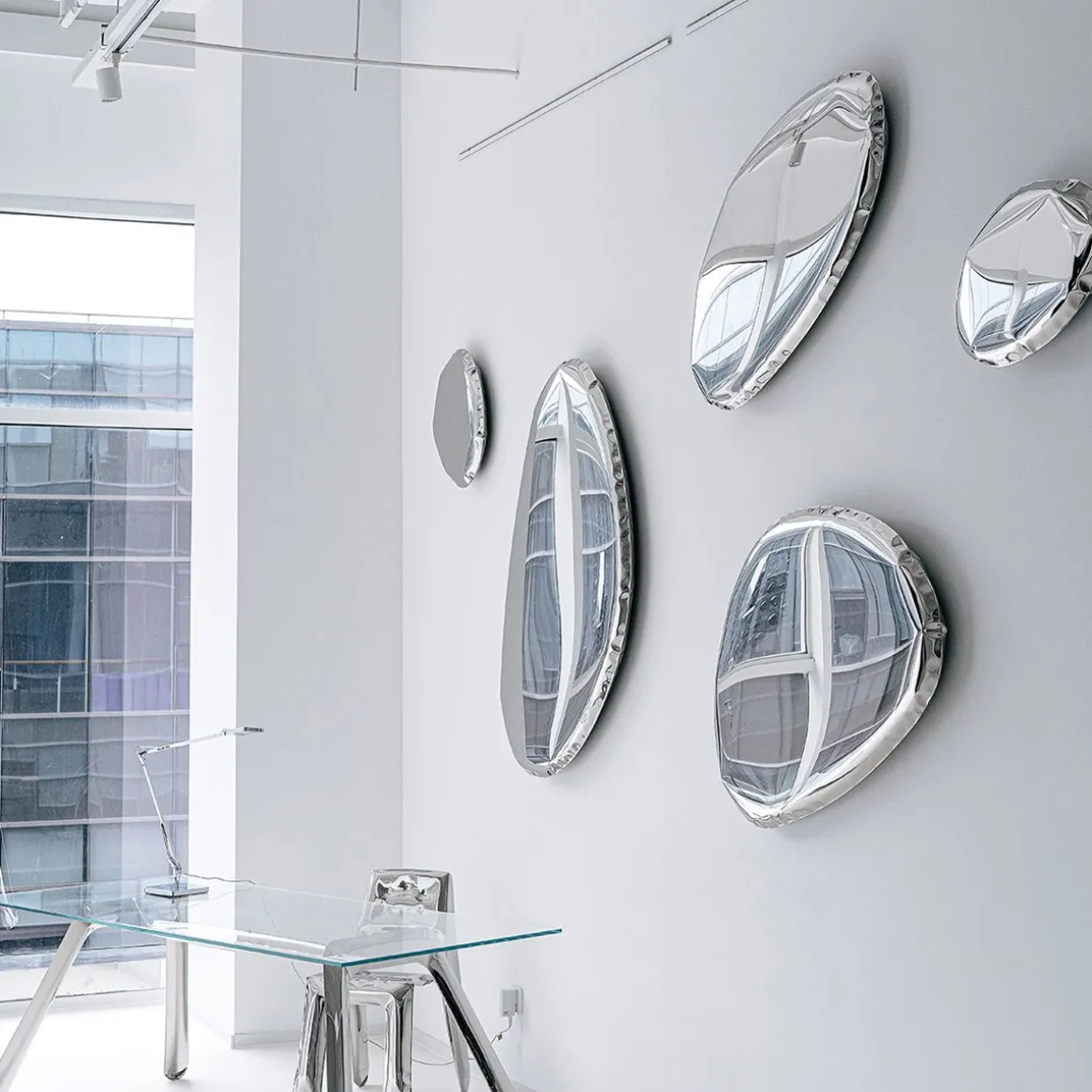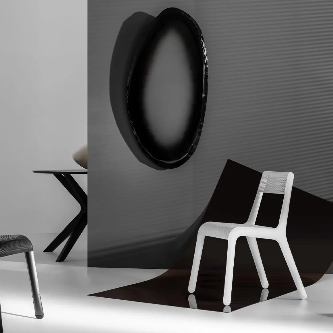 La série TABLA O se caractérise par des formes lisses et optiquement légères inspirées des gouttelettes de liquide et, grâce à sa forme unique, combine le monde du design, de l’art et de la technologie. La collection TABLE est une étape radicale vers de telles transformation. Le miroirs fabriqués avec la technologie FIDU sont le résultat d’une formation libre causée par une pression interne élevée. Ce processus crée des objets d’une grande durabilité mais une structure subtile. Comme les tout premiers miroirs, les TAFLA sont en métal. La technologie FIDU faute ressortir le vrai visage de l’acier et crée des objets aux formes uniques.