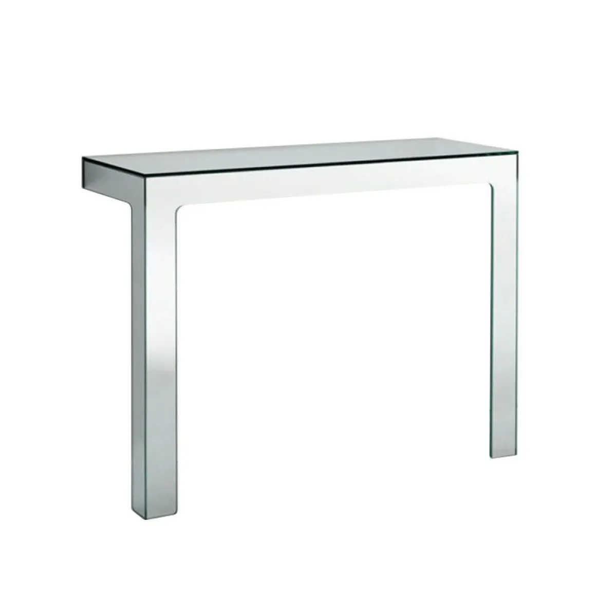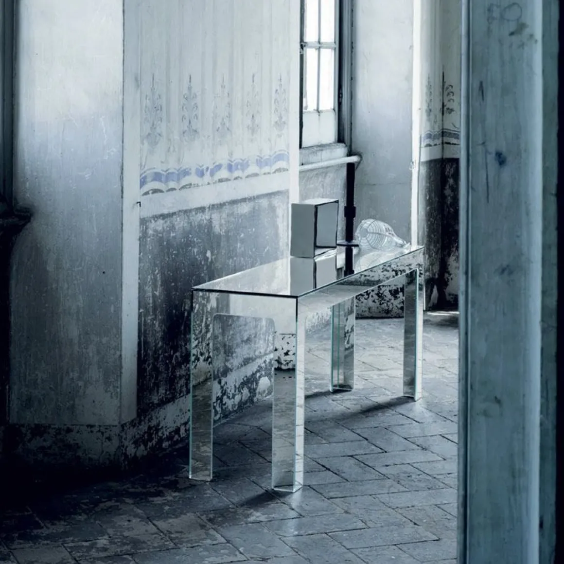 Collection de tables basses et consoles disponibles en différentes tailles, dont la base est obtenue par collage de dalles de miroir laminé double face découpées au jet d’eau à 45°.