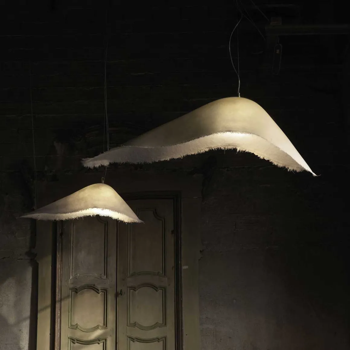 La suspension Moby dick de Karman, créée par le designer et directeur artistique de la marque Matteo Ugolini. Faite de fibre de verre avec extérieur lisse et intérieur rugueux, ce luminaire disponible en deux tailles existe aussi en modèle pour l’extérieur.