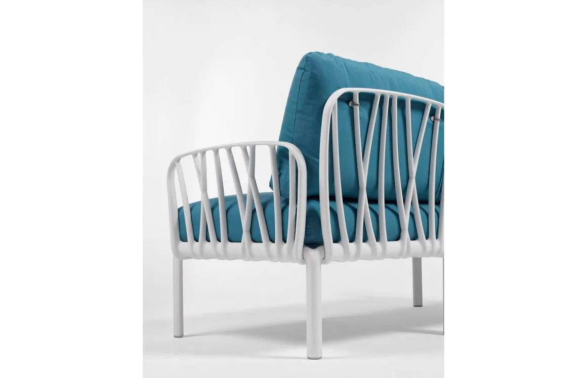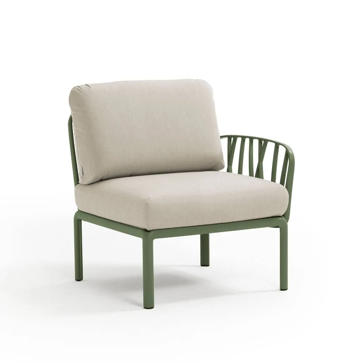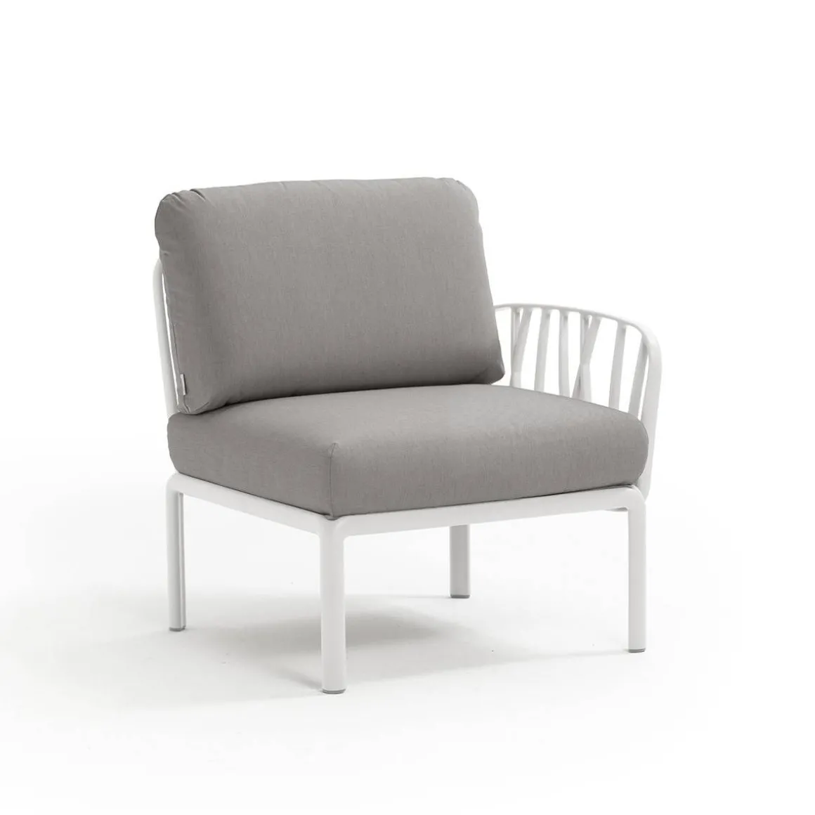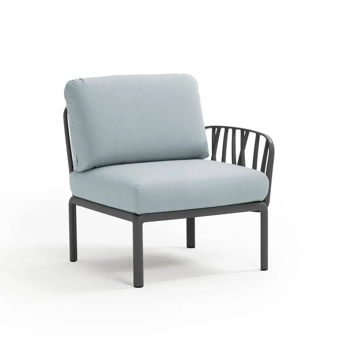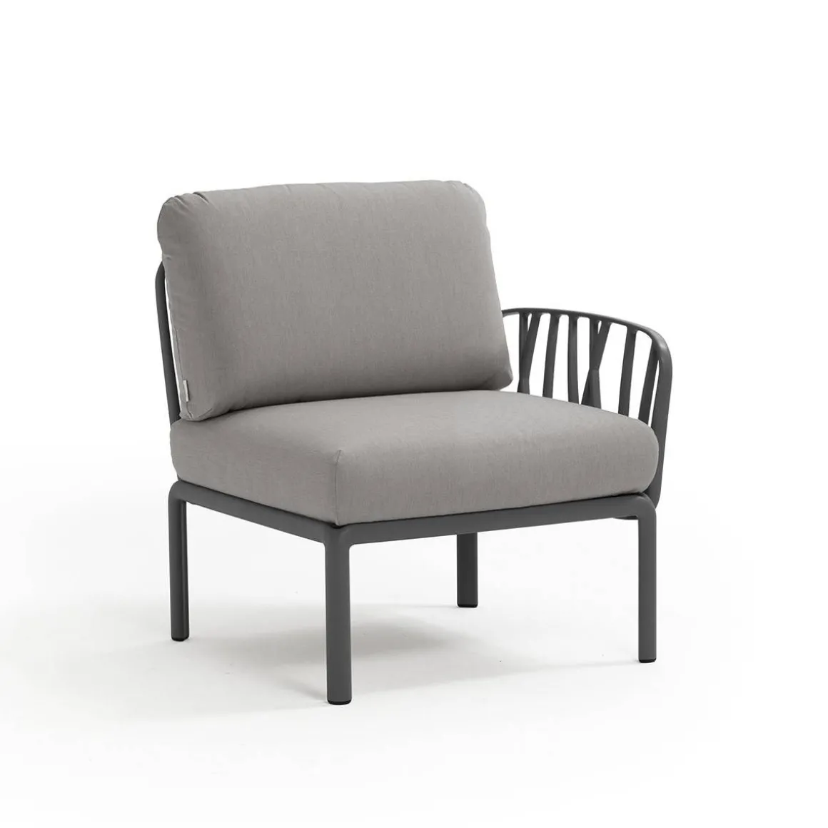 Fauteuil à accoudoir (droite ou gauche) en résine fibre de verre et élément rembourrés pouvant être configuré comme élément initial ou final dans une composition d’assises modulaires de la collection Komodo.