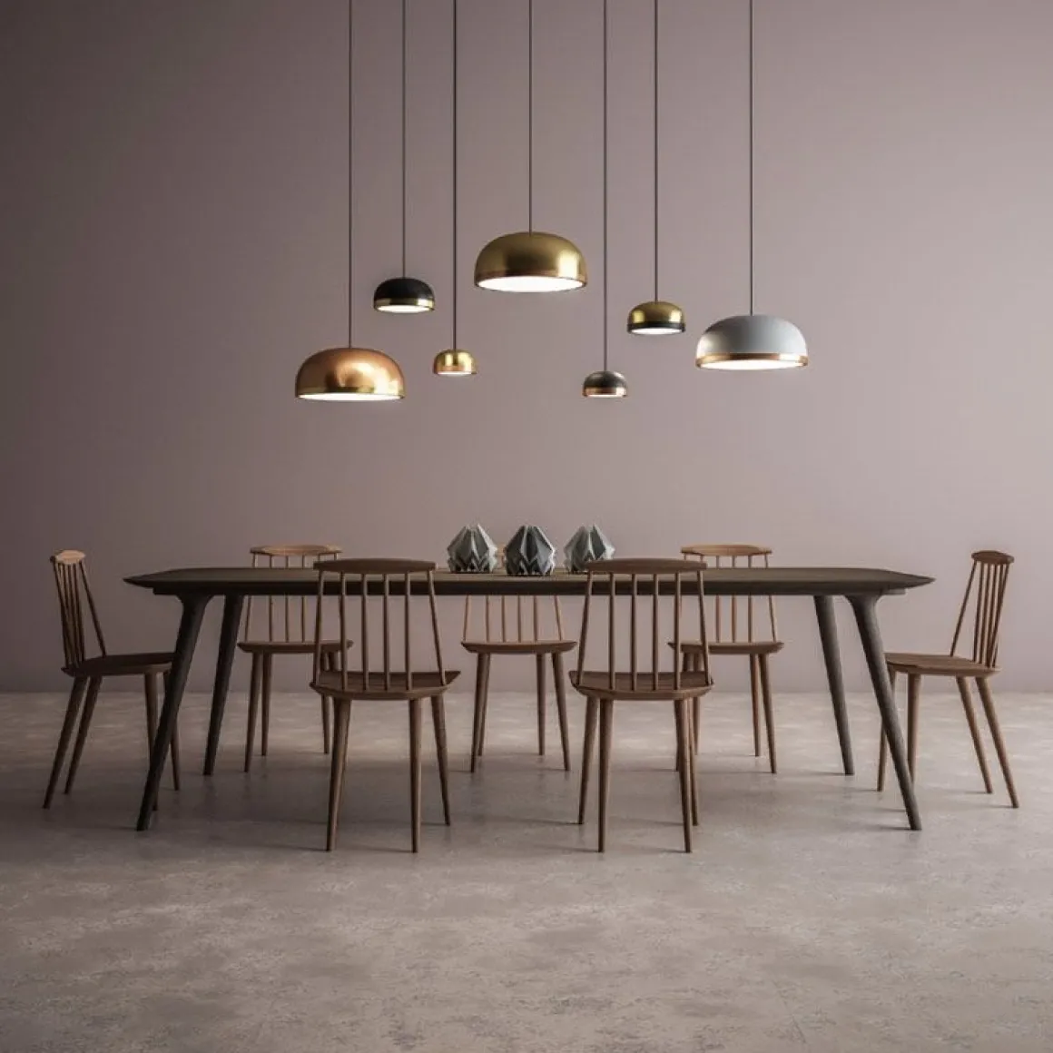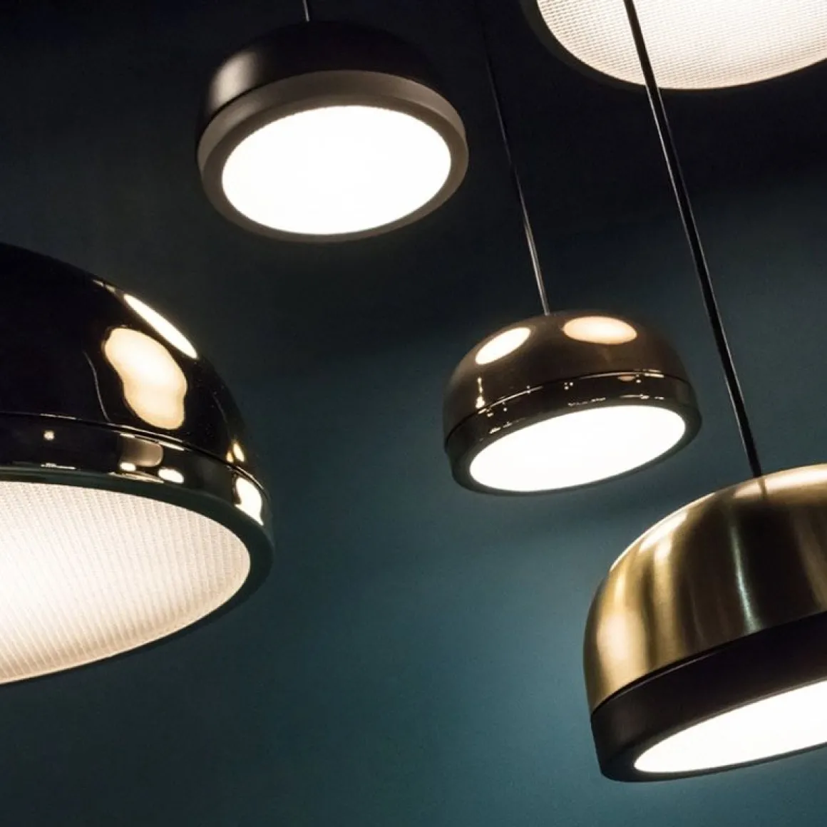Collection de lampes suspendues, murales, de sol, de table, latérales et de plafond contemporaines avec un dôme peint et un anneau peint ou fini en laiton brossé ou en cuivre galvanique. L’écran lumineux en diamant est en plexiglas pour mieux diffuser la lumière. La collection présente des lampes disponibles en trois tailles pour des compositions unitaires ou dynamiques. Ces lampes sont très polyvalentes et s’adaptent à tout type de cadre, grâce à leur forme simple mais à leurs matériaux riches.