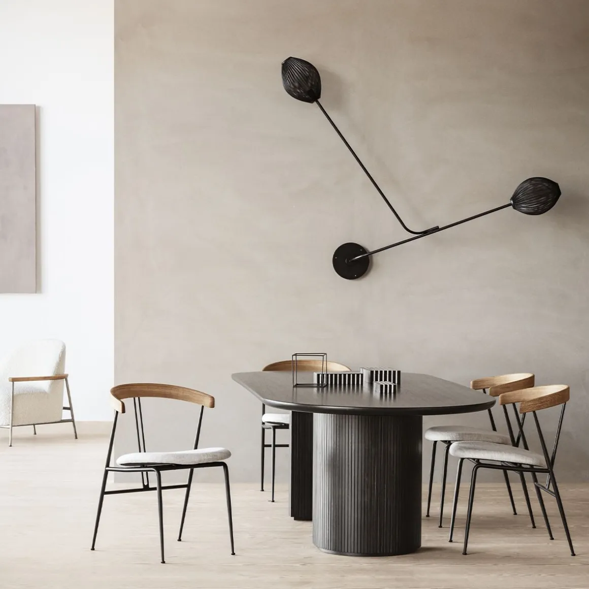 Moon Table de Gubi par Space Copenhagen. Space Copenhagen est le concepteur de la classique Moon Table, table organique pour les espaces domestiques et publics. L’interaction entre le magnifique plateau de table en chêne massif et la base lisse en forme de demi-lune, avec sa surface biseautée, servant de structure et d’ornement, crée une identité simple mais forte pour le design. Le résultat est une table élégante avec des références claires à la menuiserie traditionnelle danoise, où l’hommage du mariage entre design et artisanat est au centre.