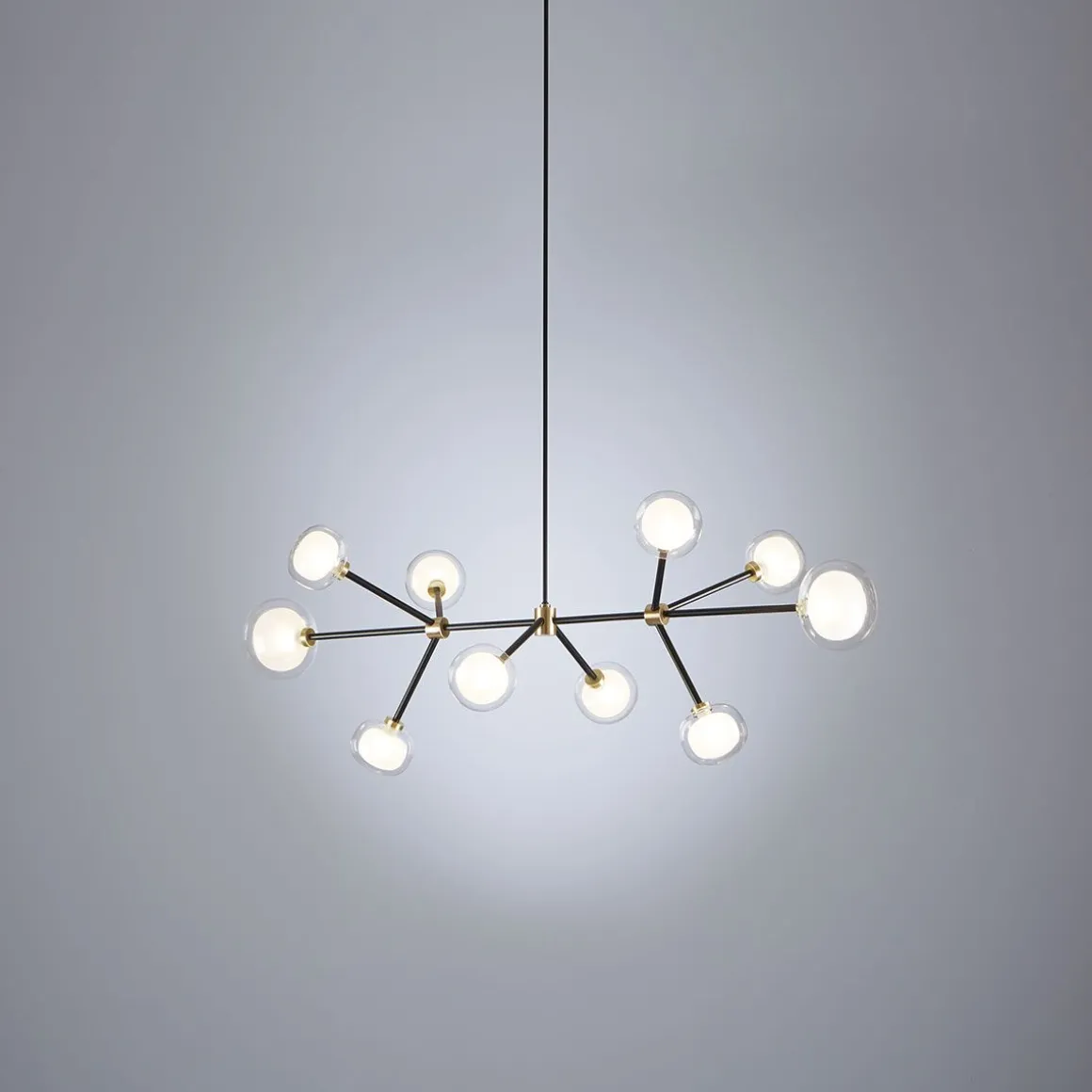 Collection Nabila de Tooy inspirée de lampes des années 50, élégantes et sophistiquées, représentant le détail pour enrichir n’importe quel endroit. Un objet lumineux sphérique double face en verre borosilicaté rend ces lampes existantes dans différentes compositions, avec une structure faite de métal laqué enrichie de détails en laiton brossé. Différents modèles sont disponibles pour toutes les situations. Richesse et sobriété en un seul élément.