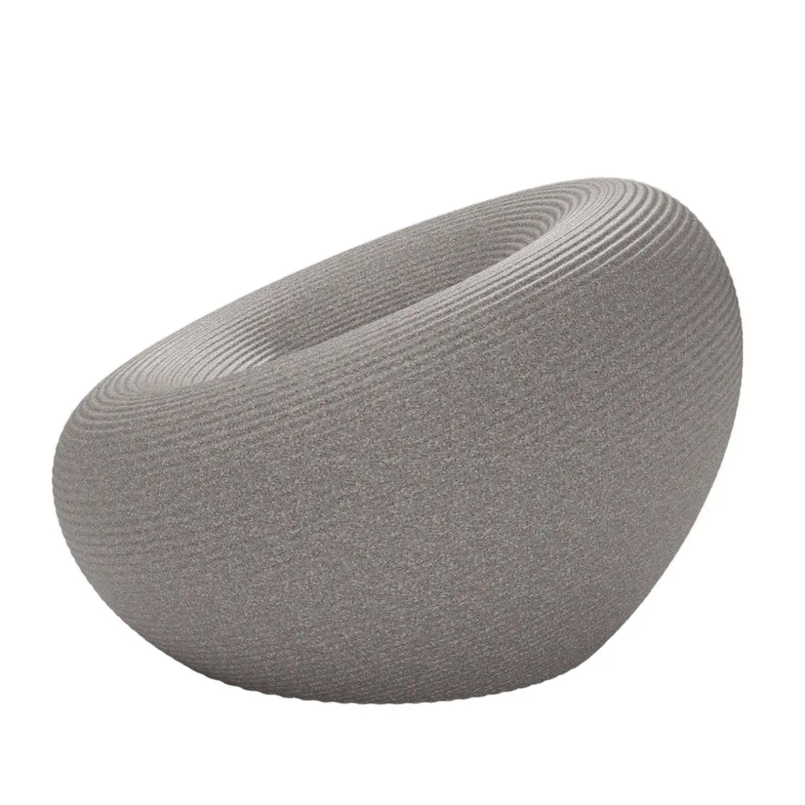 Nami de Qeeboo par Stefano Giovannoni. Le fauteuil Nami est obtenu par rotation d’une section sur un axe diagonal. Il présente une forme parfaitement circulaire où les moulures qui caractérisent sa surface se déroulent du centre vers les bords, formant une succession d’anneaux concentriques. Au centre du fauteuil se trouve le canal de reflux de l’eau. Disponible en six coloris, trois d’entre eux sont de couleur uniforme, les trois autres sont issus du recyclage et du mélange de matériaux avec deux ou trois nuances différentes.