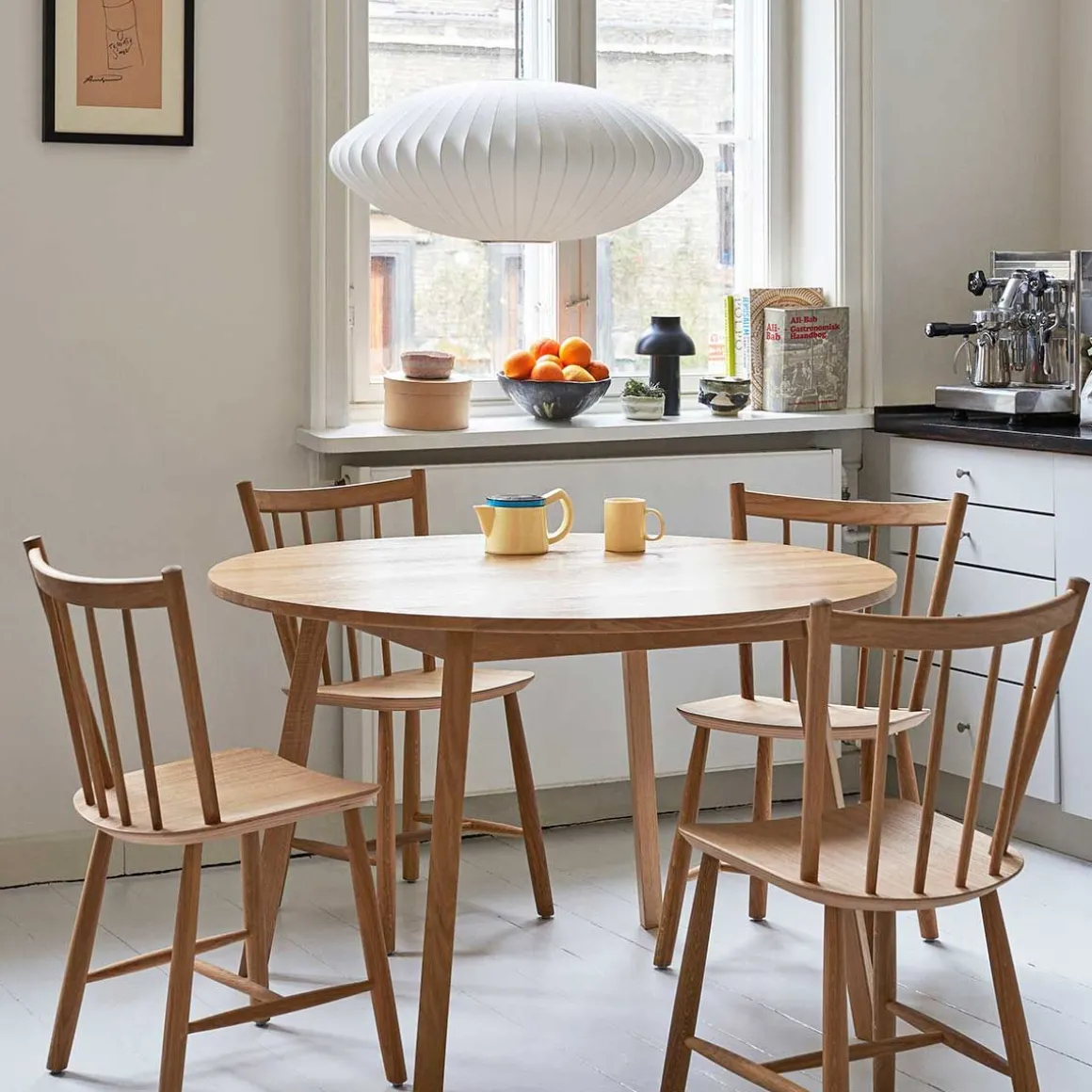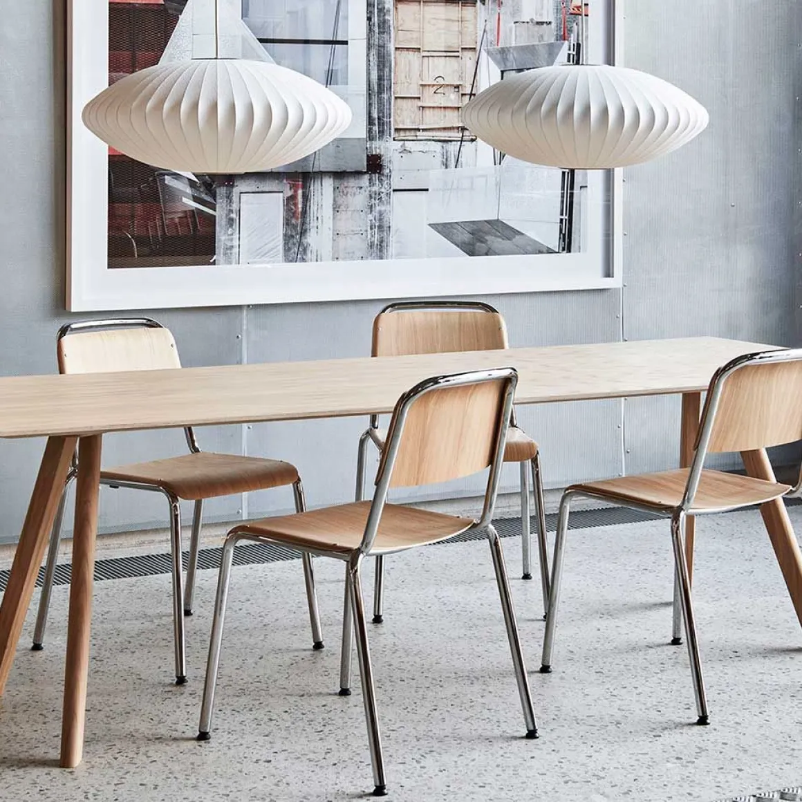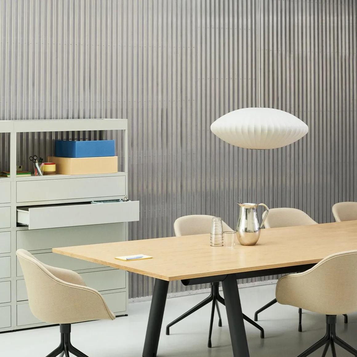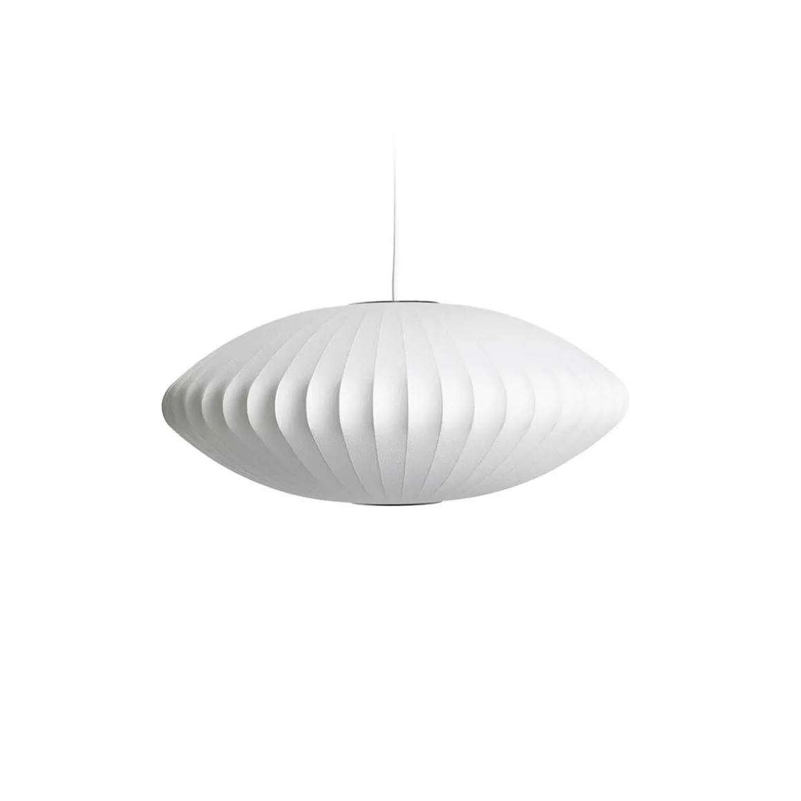Nelson Saucer Bubble de Hay. Conçue par le designer américain George Nelson en 1947 et produite pour la première fois en 1952, la lampe Bubble a marqué une révolution dans l’industrie de l’éclairage moderniste. Disponibles dans un assortiment de tailles et de formes organiques, ces orbes élégants trouvent leur inspiration dans un ensemble de lampes suspendues suédoises recouvertes de soie que Nelson voulait pour son bureau, mais qu’il trouvait trop cher. Utilisant l’ingéniosité qui caractérisait son processus de travail, il a décidé d’utiliser un aérosol en plastique autolubrifiant mis au point par l’armée américaine et l’a appliqué sur une structure en acier léger et arrondi pour produire ces luminaires doux et brillants.
