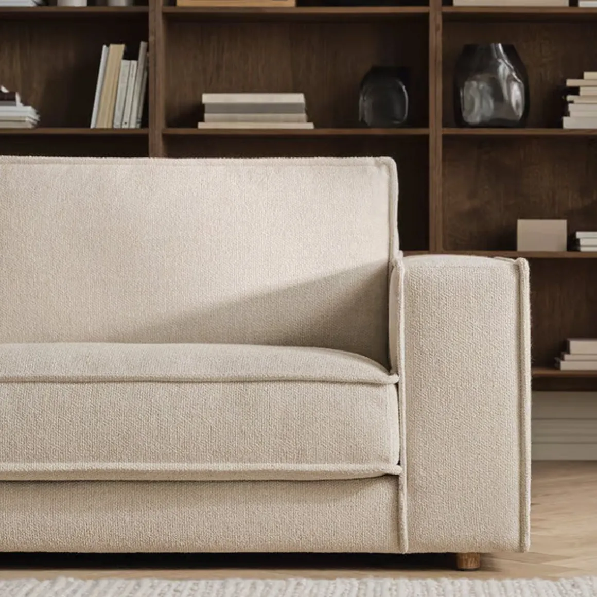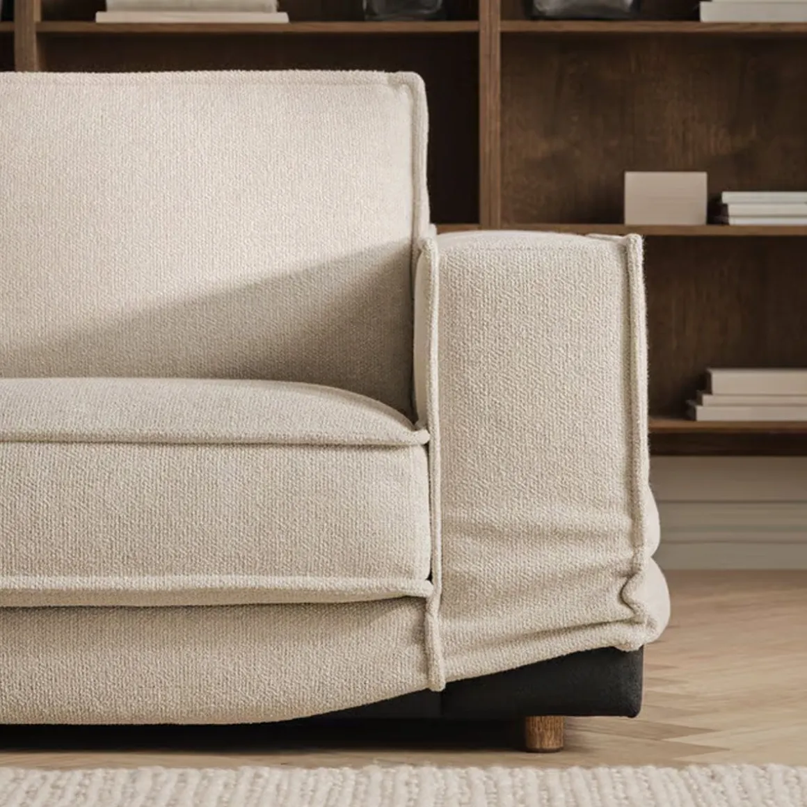 Matériaux : Bois mixte, tissu Monza bouclé & texture (28 % polyacrylique, 24 % coton, 20 % viscose, 16 % laine, 12 % polyester)