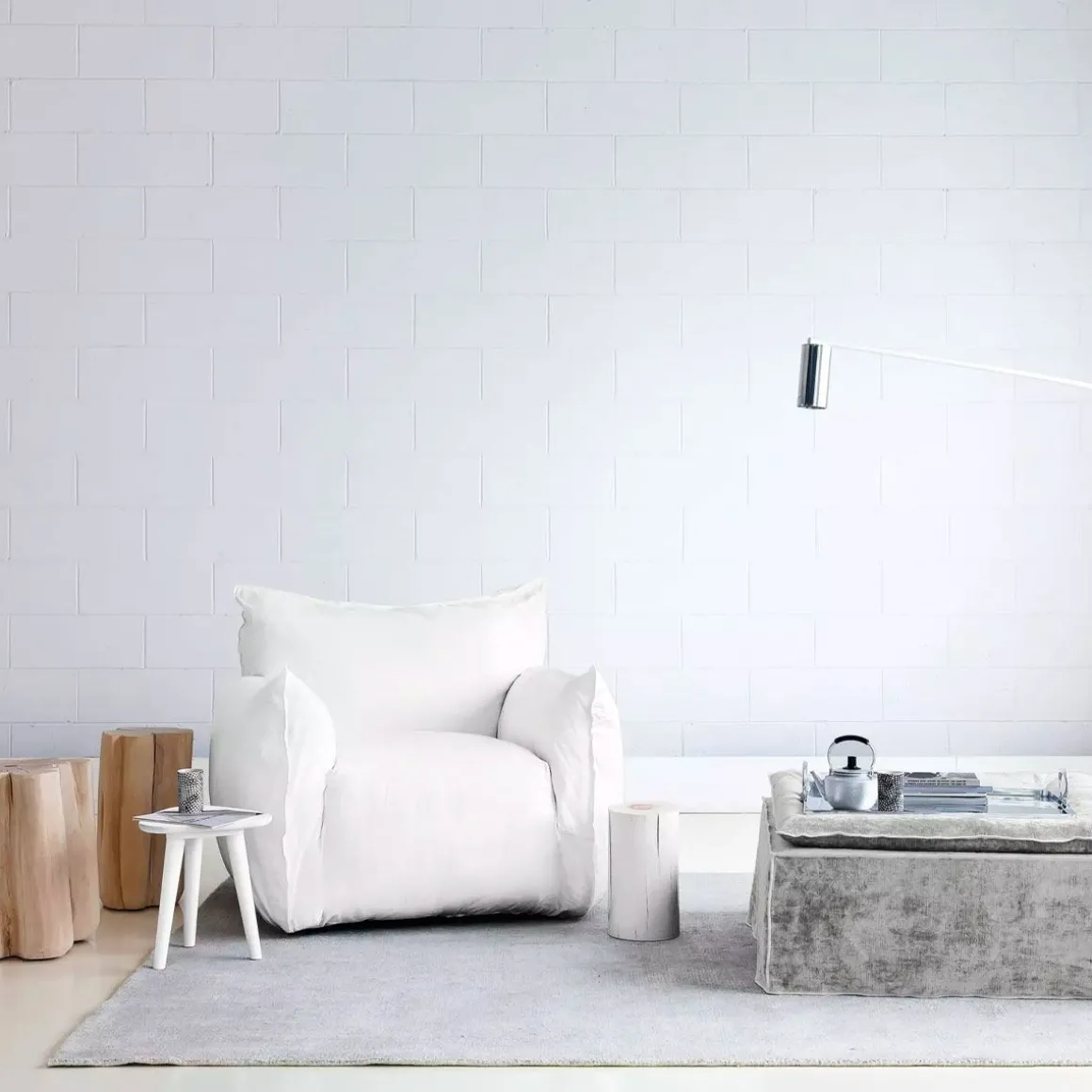Nuvola 05 fauteuil de Gervasoni par Paola Navone. Famille de fauteuils aux formes tendres et attrayantes, Nuvola possède une esthétique qui invite à s’y plonger : les accoudoirs hauts accueillent une assise profonde comme une embrassade pour créer une véritable impression de cocon. Disponibles en deux tailles, ils sont rembourrés de mousse de polyuréthane de différentes densités et recouverts d’une courtepointe matelassée garnie de duvet d’oie et de flocons en fibre de polyester. La housse, amovible, est ornée de coutures apparentes qui dessinent le profil du produit et peut être réalisée avec tous les revêtements du catalogue, pour un maximum de polyvalence.