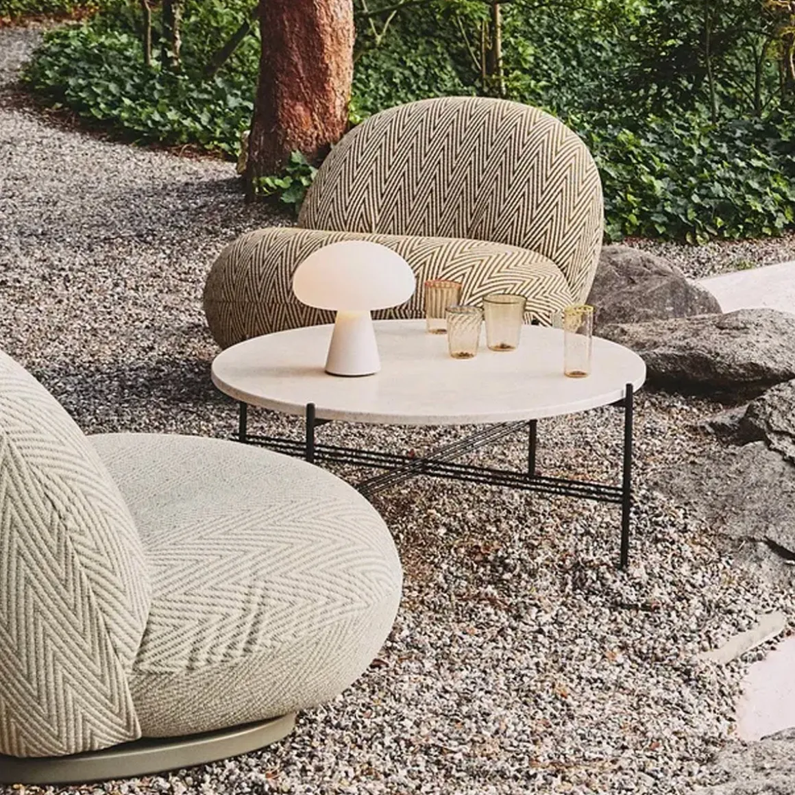 Obello – lampe portable de Gubi par Bill Curry. Avec un abat-jour en verre dépoli soufflé à la bouche, comme utilisé pour les lampes originales de Curry, et une source de lumière LED à intensité variable intégrée, la lampe rechargeable peut facilement être déplacée entre l’intérieur et l’extérieur. Avec une charge complète en quatre heures et demie, fournissant jusqu’à 40 heures de lumière, Obello créera une atmosphère chaleureuse lorsque le soleil commencera à se coucher et durera jusque tard dans la nuit. La lampe Obello est un design emblématique de l’ère spatiale qui fera forte impression, soit comme pièce maîtresse ludique, soit comme point de curiosité dans n’importe quel espace extérieur.