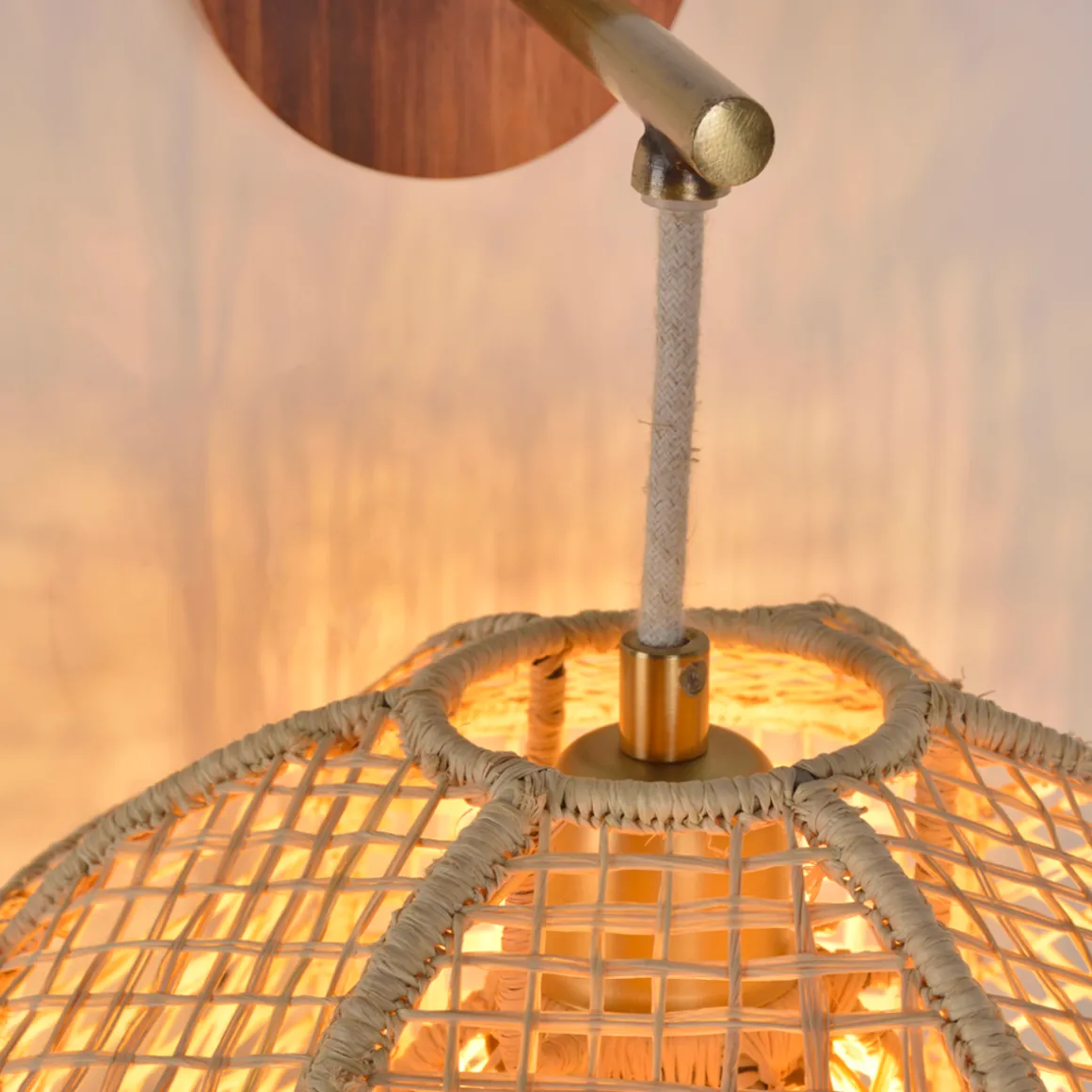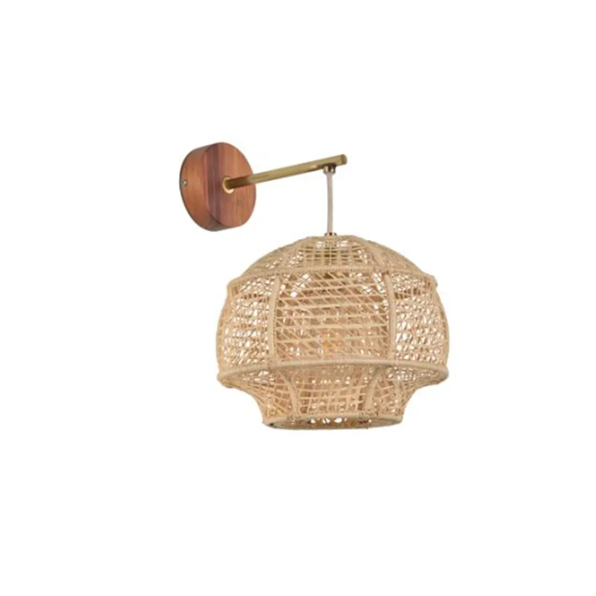 Odyssée applique en forme de dôme et en raphia naturel tressé à la main. Équipée d’une patère avec cordon textile et base en bois, finition laiton.