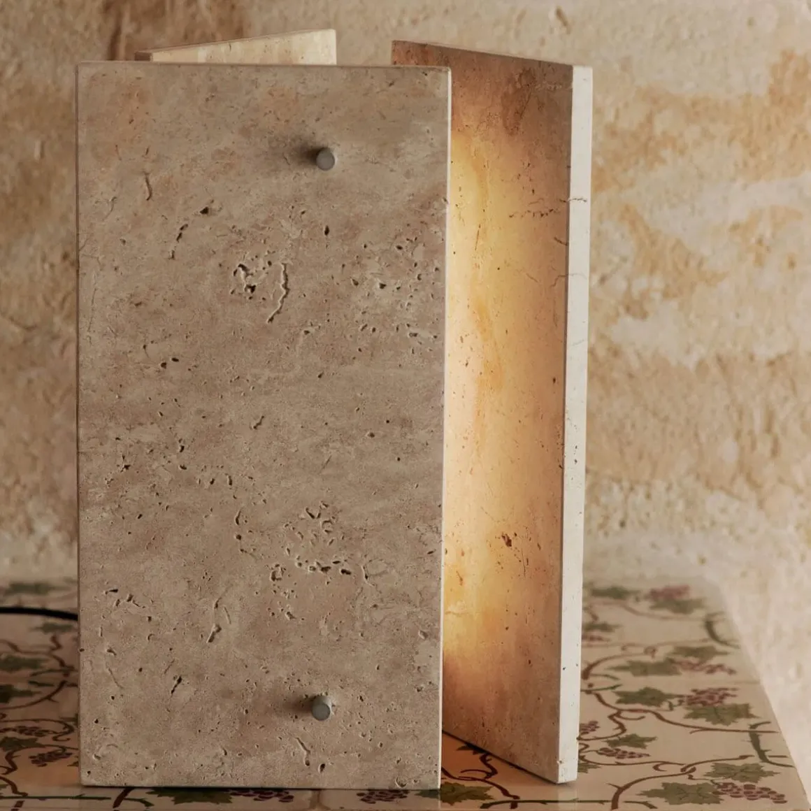 Oeste de Ferm Living. La lampe de table Oeste se compose de trois panneaux de travertin entourant une source lumineuse centrale, créant ainsi un jeu dynamique d’ombre et de lumière. La texture naturelle de la pierre met en valeur la lumière chaude et diffuse, projetant une lueur douce et architecturale. Emballée à plat pour un assemblage facile et dotée d’une fonction de variation d’intensité, le design de la lampe allie matérialité et utilité et offre une solution d’éclairage d’ambiance pour tous les espaces.