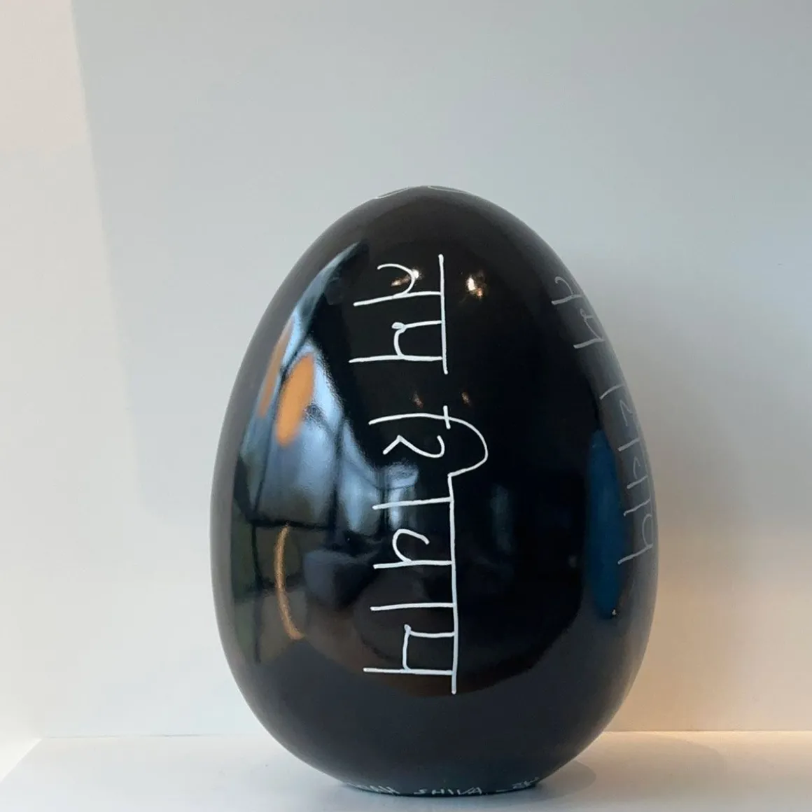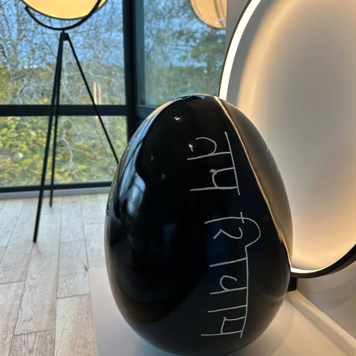 Cette pièce est spectaculaire grâce à sa finition noir brillant intense, qui confère à la sculpture un aspect à la fois mystérieux et profondément moderne. Le noir, symbole de l’absorption et du cycle, est mis en valeur par la calligraphie blanche faite à la main par l’artiste SJ. Ce contraste puissant attire le regard et souligne le travail artisanal de l’inscription. Comme toute œuvre artisanale, cette sculpture peut présenter de subtiles variations, qui attestent de son caractère unique et peint à la main. C’est une œuvre qui allie la profondeur philosophique à l’audace du design Pop Art.