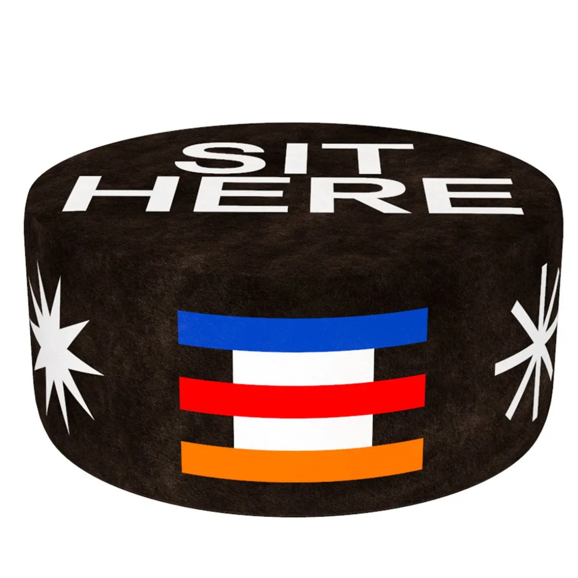 Oggian Sit here de Qeeboo par Marco Oggian. Ces poufs, se caractérisent par des motifs ludiques tout autour. Au-dessus d’eux, vous trouverez un panneau « SIT HERE » encourageant les gens à les essayer et à profiter de leur confort.