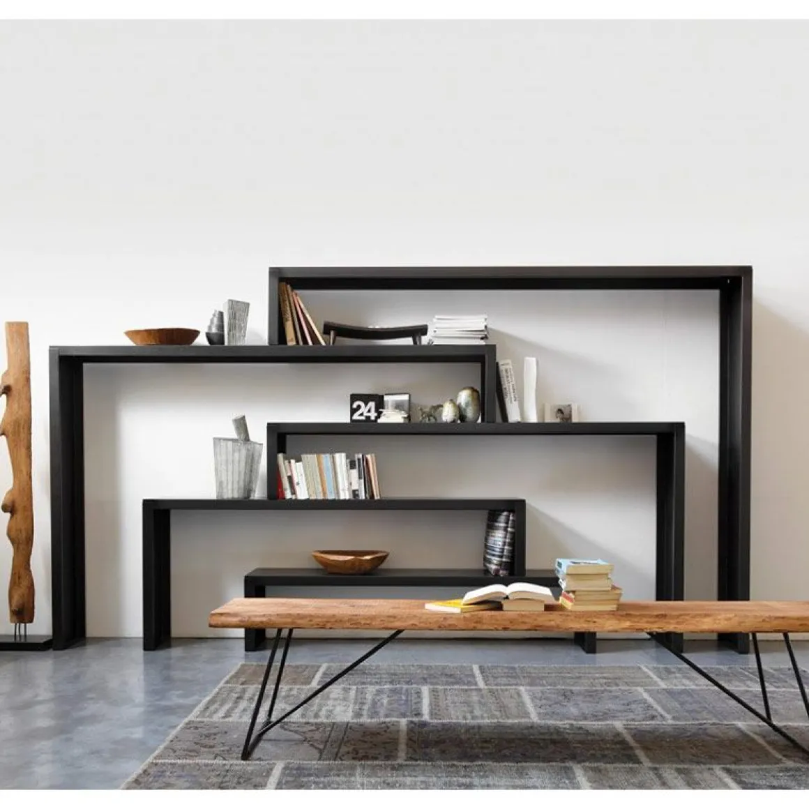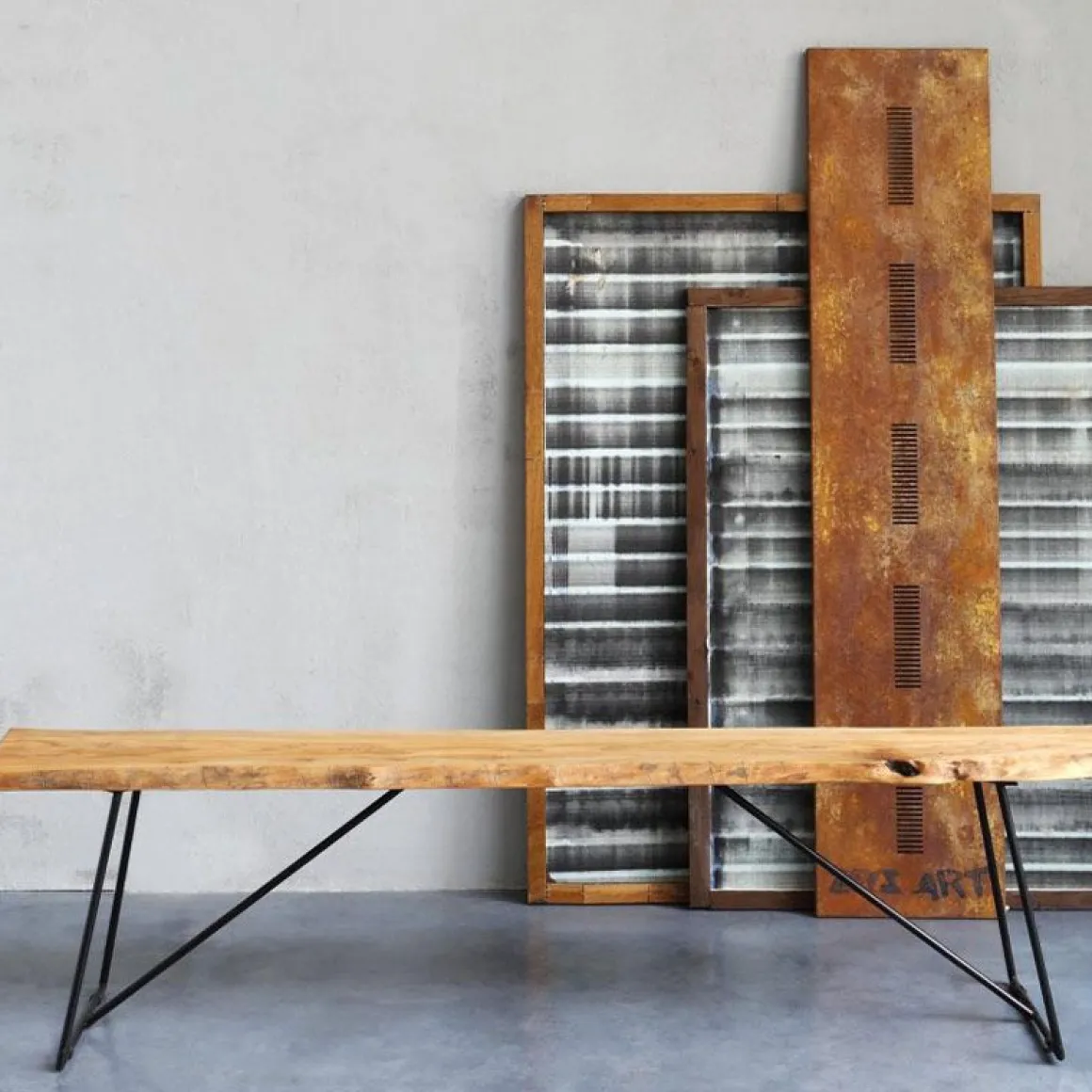 Matériaux : peinture époxy noir cuivré sablé et bois d’olivier massif vieilli