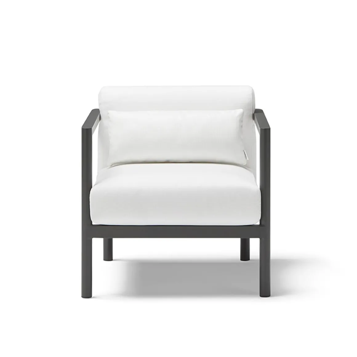 Matériaux : structure en aluminium peint en poudre, coussin d’assise et dossier en mousse de polyuréthane de 35 kg haute résistance