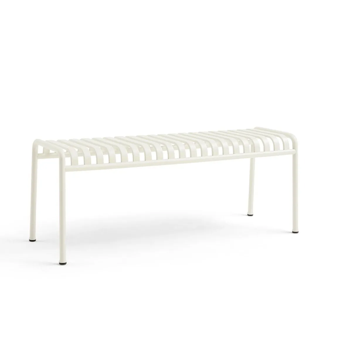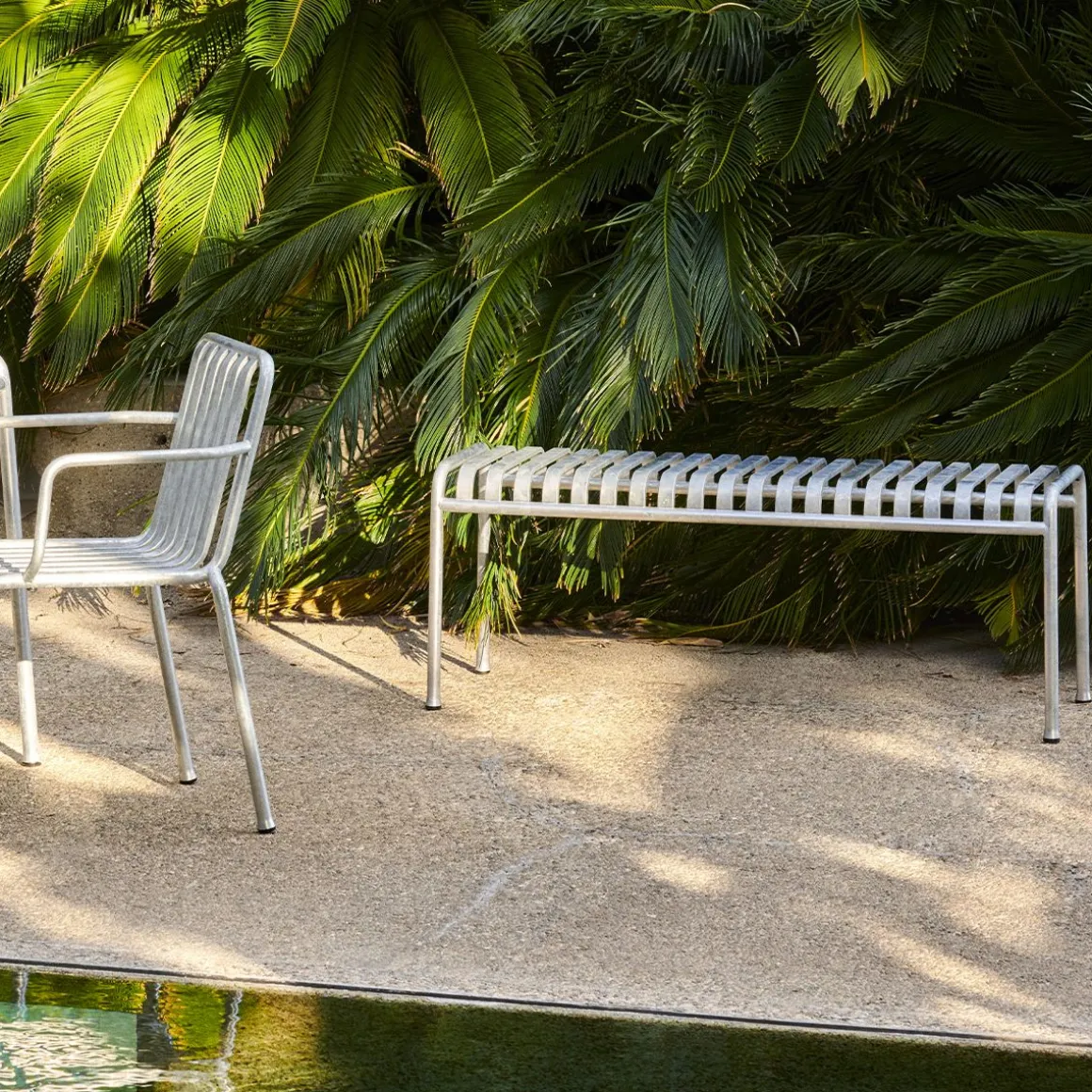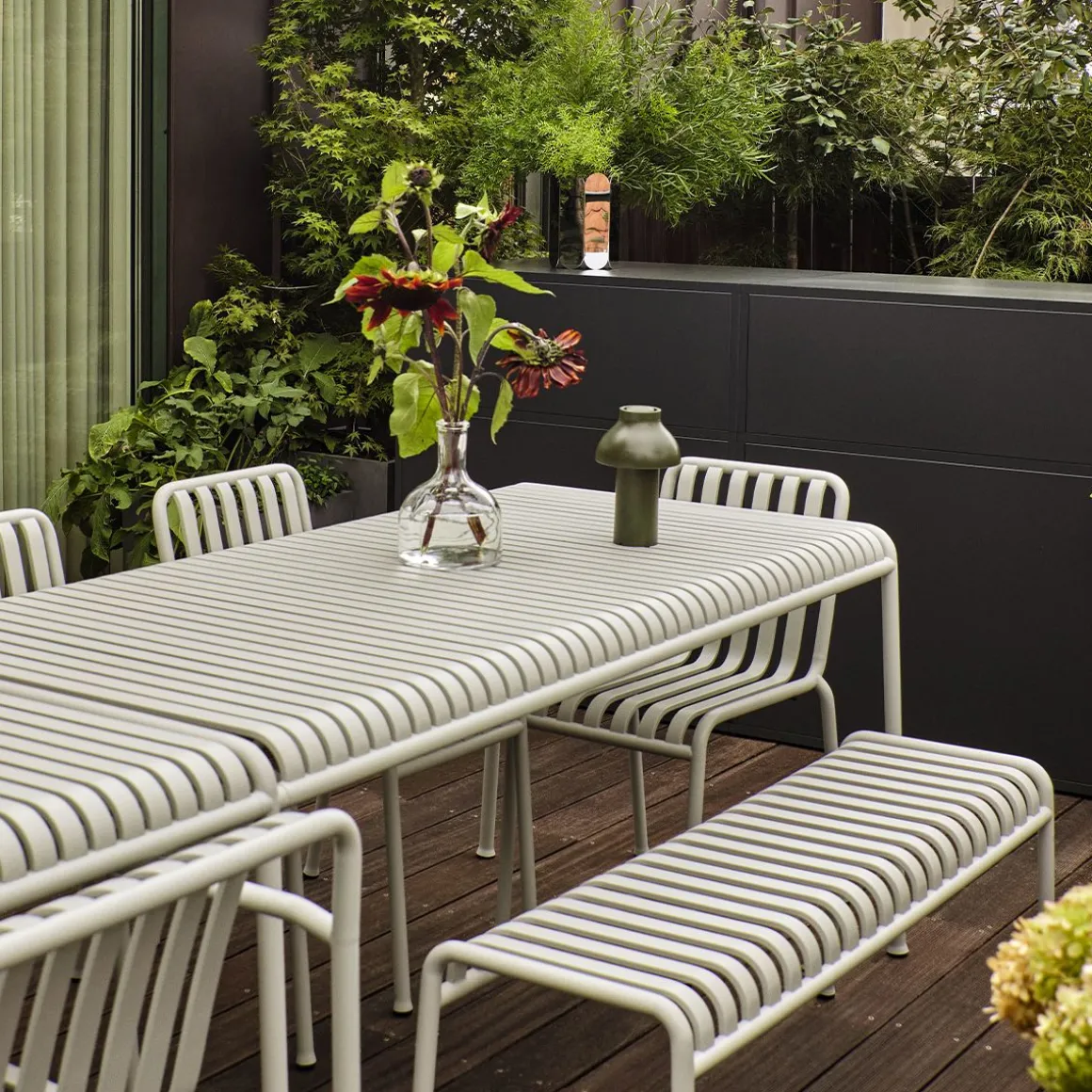 Palissade banc sans dossier de Hay. Palissade est une collection de mobilier d’extérieur conçue par Ronan et Erwan Bouroullec pour Hay. La collection a été conçue pour s’adapter à une grande variété d’environnements : cafés, restaurants, jardins, terrasses et balcons. La construction permet un large éventail de typologies avec un langage formel commun. Des tabourets et des bancs aux chaises en passant par les tables, les chaises longues et les canapés, la collection comprend 13 différents, unis non seulement par leur image graphique, mais également par leur caractéristiques communes : ils sont solides sans être volumineux, élégants sans être fragiles