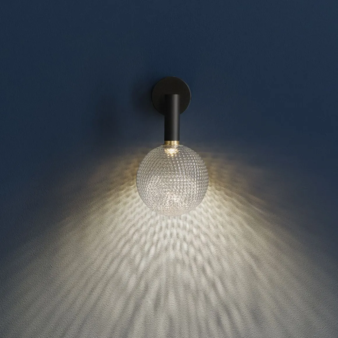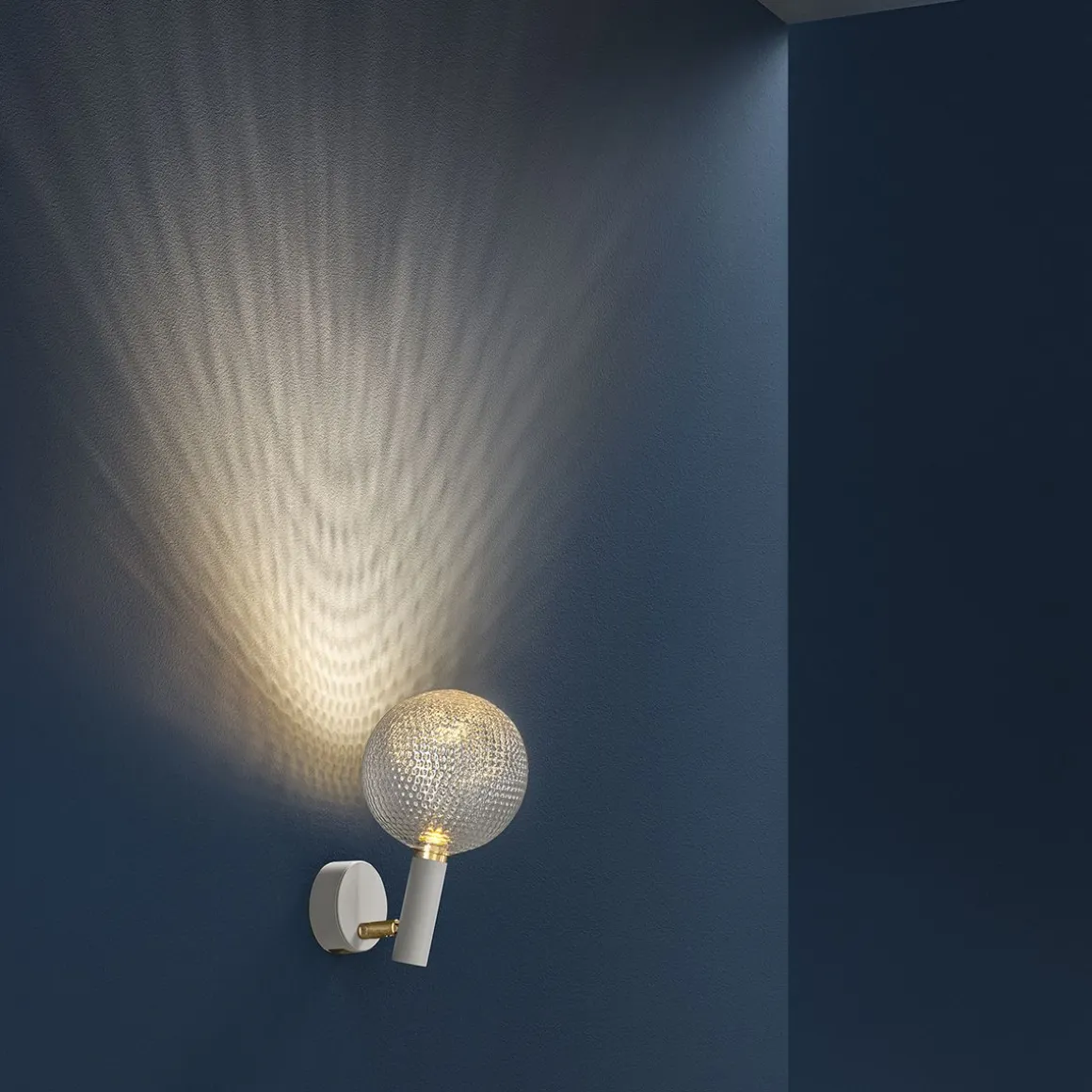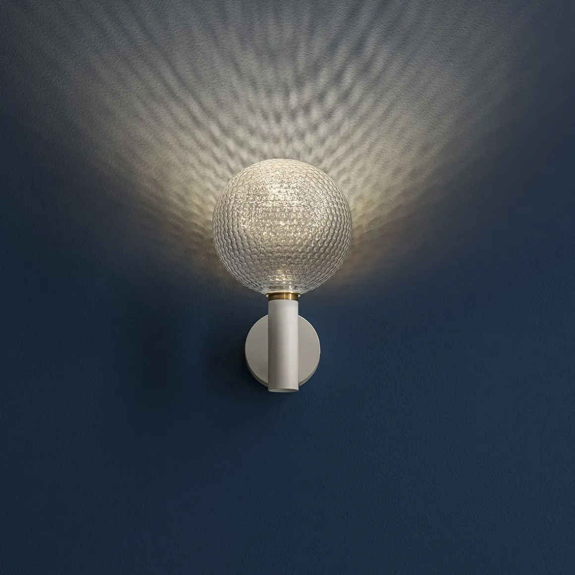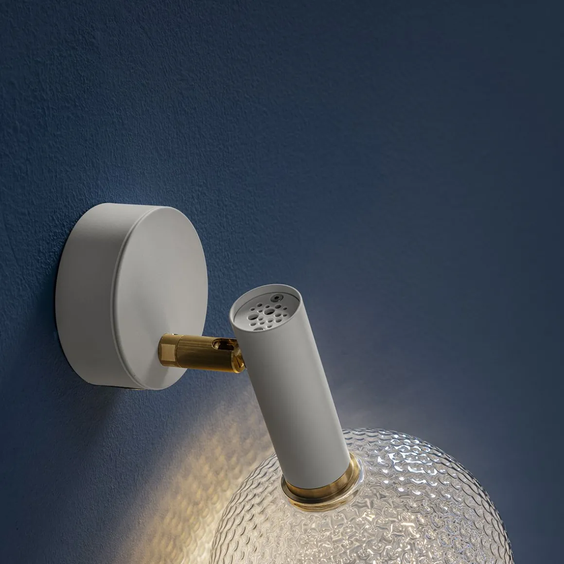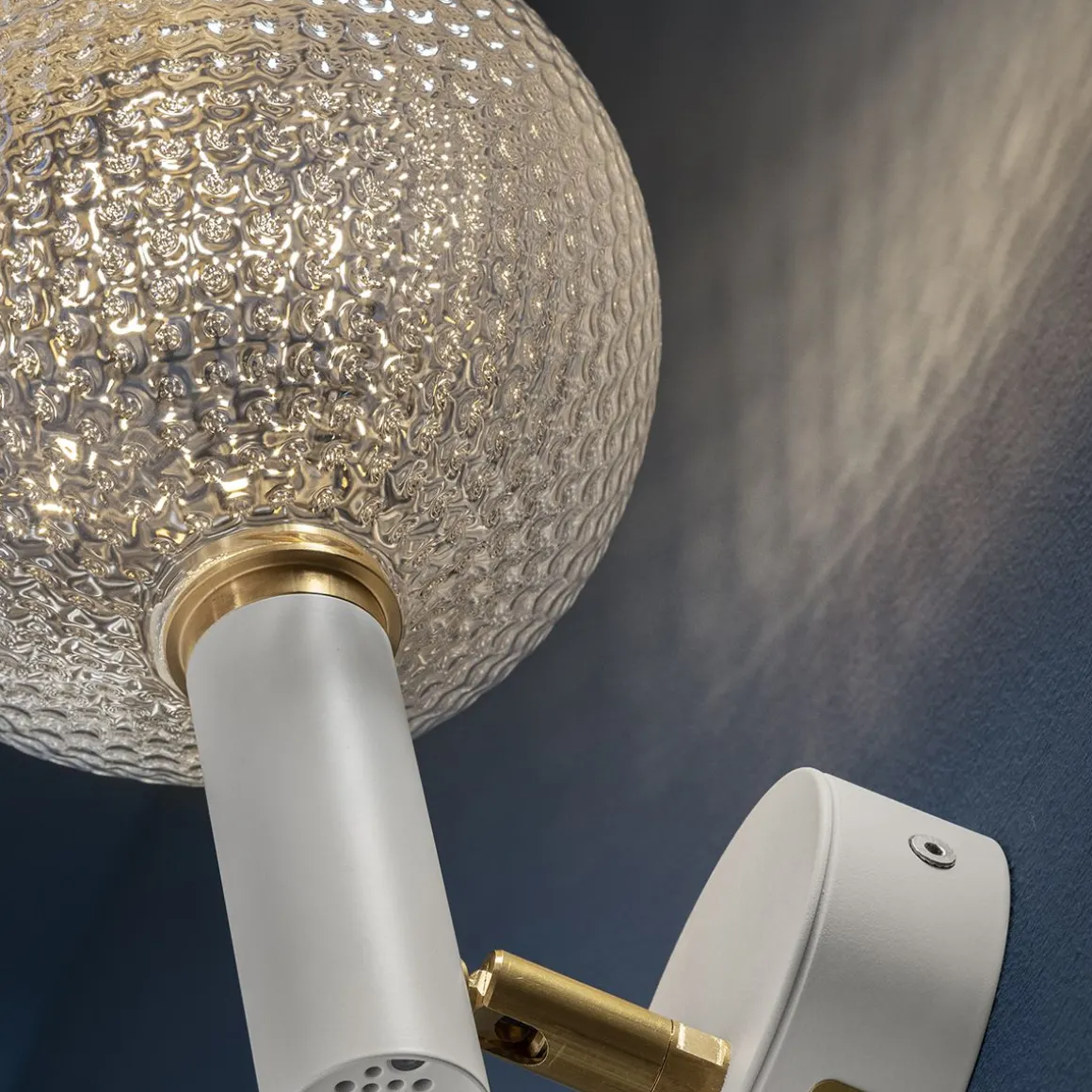 Les nouveaux modèles Par 18 de Catellani & Smith se caractérisent par des écrans en verre soufflé irrégulier. Cette texture exclusive, créée selon le design de Catellani & Smith par des maîtres verriers bohémiens et ressemblant joyeusement à une balle de golf, vise à maintenir la transparence du verre tout en générant une interaction distinctive de la lumière avec la surface irrégulière des sphères. L’applique Par 18 est disponible en deux finitions, blanche et noire, toutes deux avec des éléments en laiton. Grâce à la lumière émise par une LED COB basse tension, le Par 18 crée une lumière diffuse, ainsi qu’un motif d’ombre suggestif sur le mur ou le plafond, grâce à la surface irrégulière de la sphère en verre de 16 cm. L’articulation en laiton sur la base permet une rotation de la sphère à 350° sur l’axe horizontal et jusqu’à 90° sur l’axe vertical ; le faisceau lumineux peut être ajusté dans la direction désirée et recréer des effets lumineux suggestifs sur le mur.