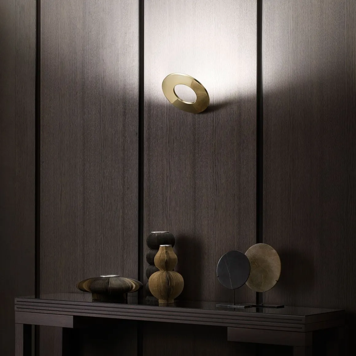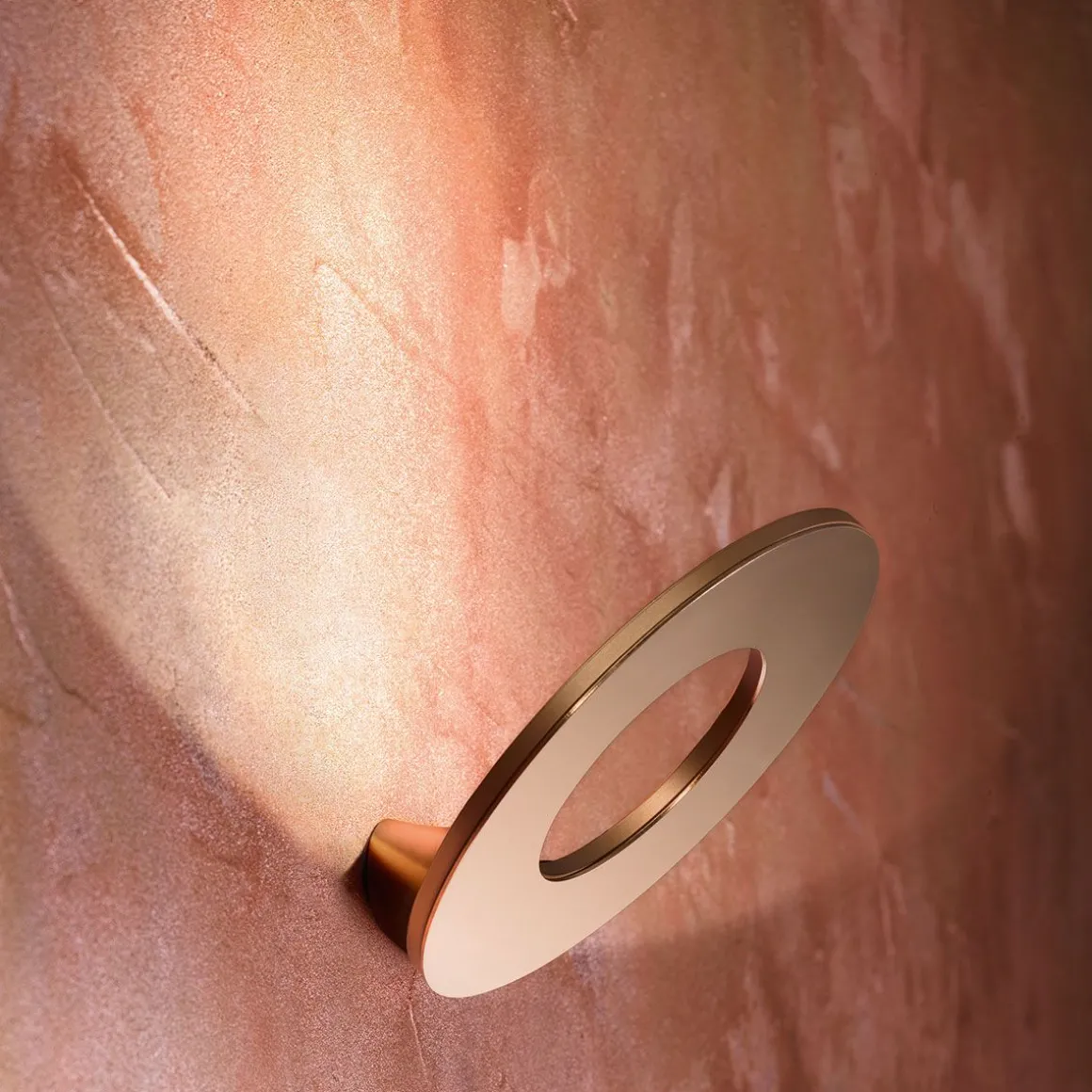 Applique au dessin linéaire et élégant en forme d’anneau. La structure mince en aluminium est accouplée à un disque réalisé en acier émaillé en plusieurs couleurs comme le rouge, le blanc et le noir et en finitions recherchés comme le cuivre, le laiton et l’acier chromé. Lampes LED dimmables à mur, d’intérieur, pour un éclairage indirect.