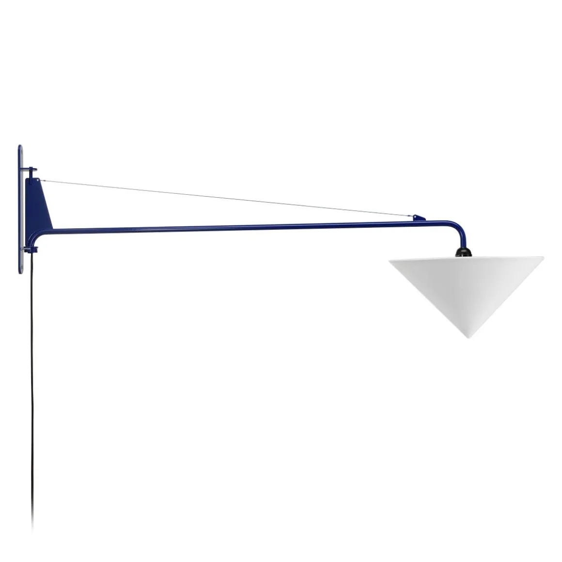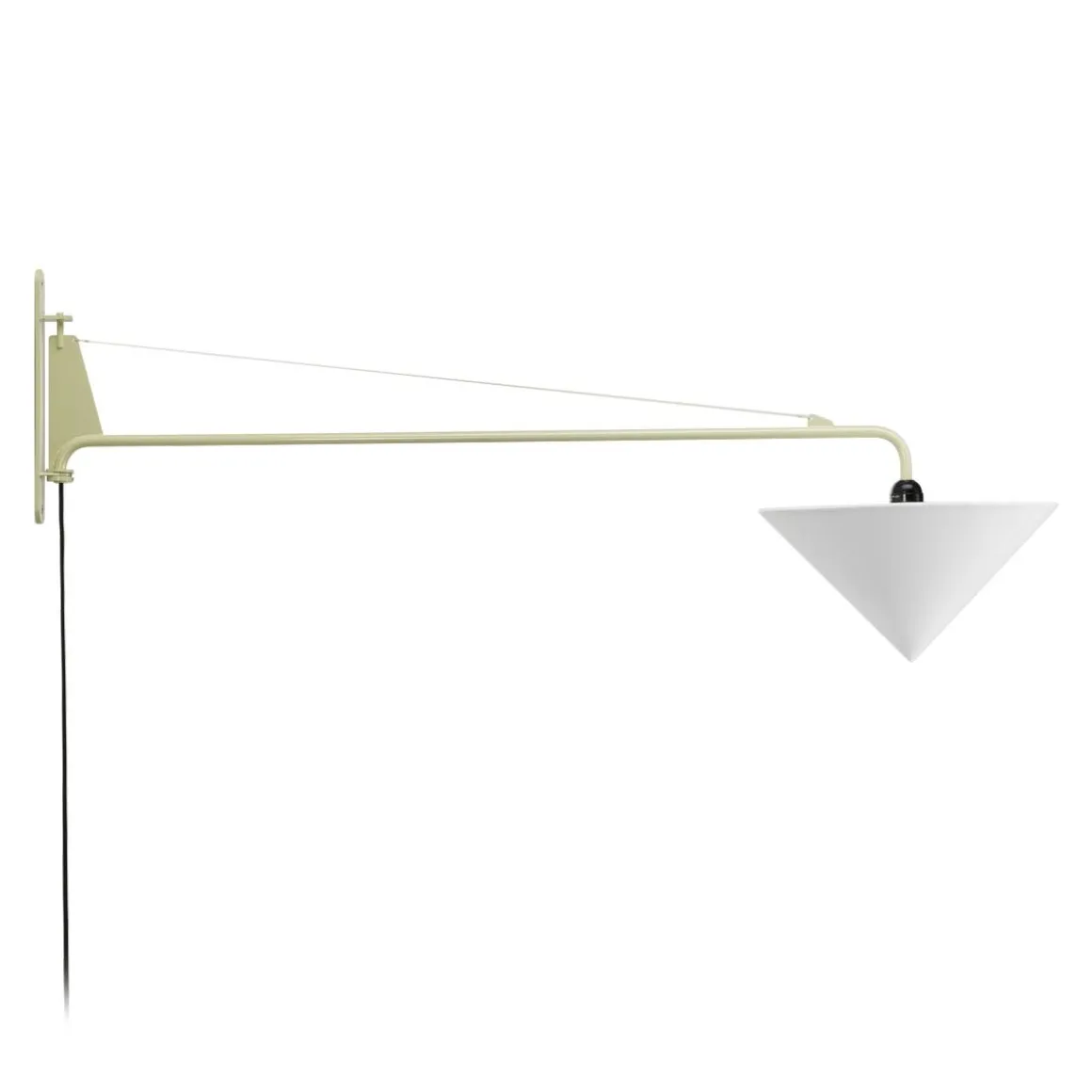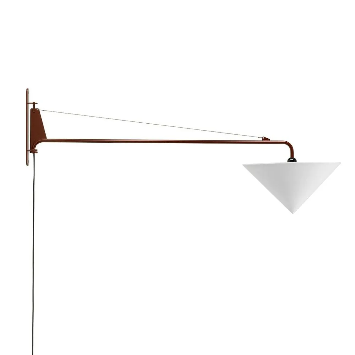 Petite Potence a des proportions similaires au grand modèle Potence, ses dimensions compactes étant idéales pour les petites intérieurs. Jean Prouvé a créé la première version de la lampe murale Potence pour sa propre maison à Nancy dans les années 1940 : une simple ampoule fixée à une longue barre pivotante en acier, maintenue par un fil d’acier. Cette création épurée et fonctionnaliste a rapidement été produite en différentes tailles, avec une poignée supplémentaire sur les modèles plus grands pour faciliter le mouvement pivotant. Petite Potence a des proportions similaires au grand modèle Potence, ses dimensions compactes étant idéales pour les petits intérieurs. Le bras oscillant mesure 103 cm de long, avec une finition époxy aux couleurs dérivées de teintes de haute qualité de l’ampoule LED est variable. Grâce à son esthétique minimaliste, Petite Potence est une solution d’éclairage idéale pour une grande variété d’environnements, des salles à manger et salon, aux bureaux et cafés.
