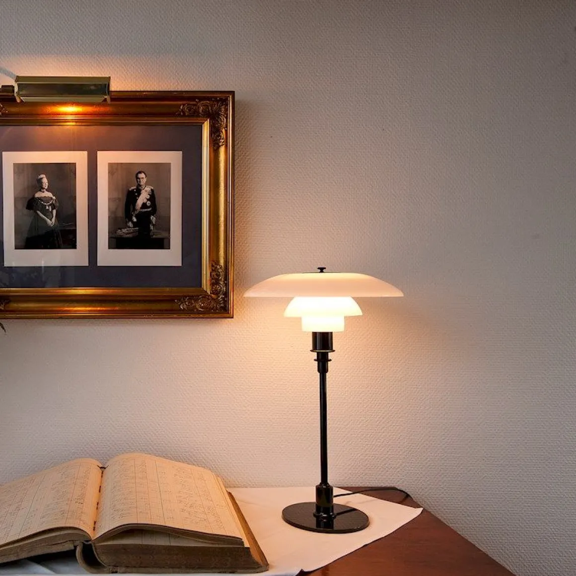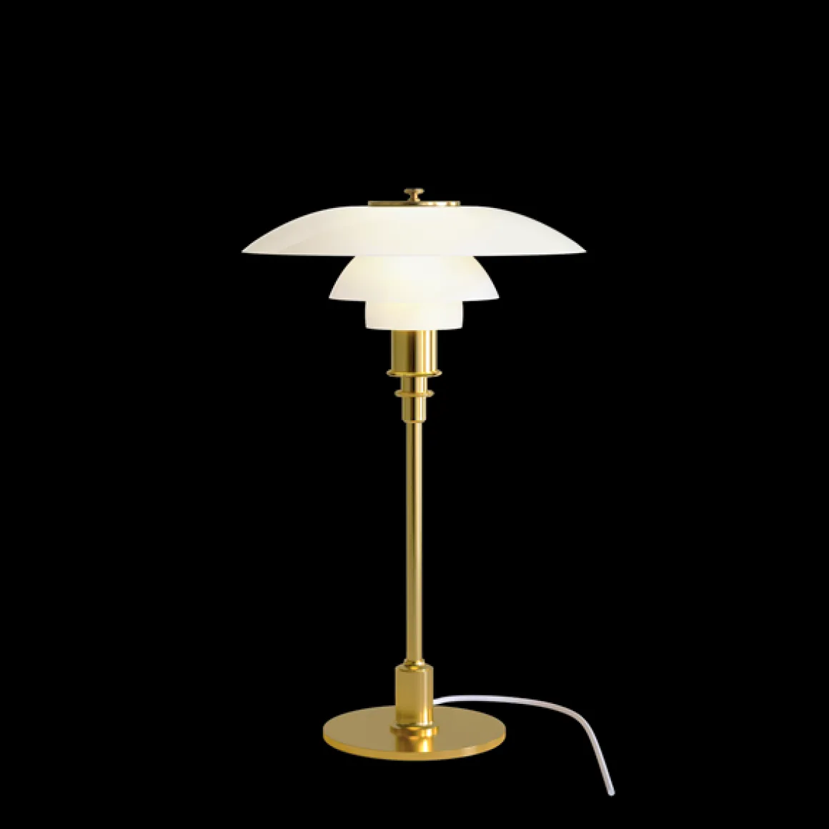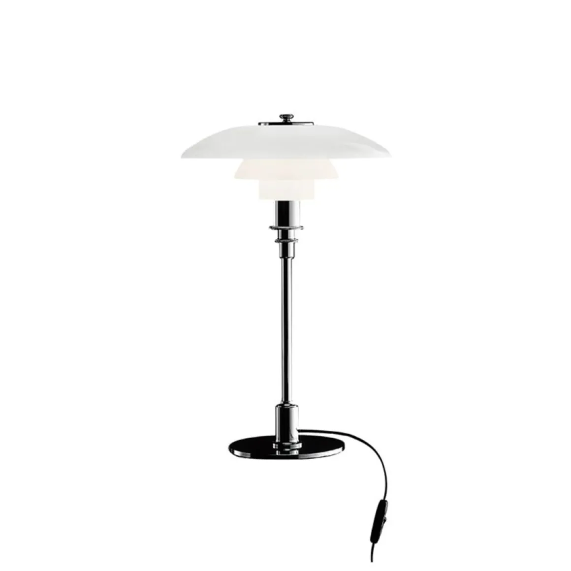 La lampe de table PH 3/2 fait partie de la famille PH 3-abat-jour, et le principe du luminaire PH 3-abat-jour a été réalisé durant les quelques mois mouvementés de l’hiver 1925-26 pour une grande halle d’exposition à Copenhague, au Danemark, appelée « Forum ». Les luminaires PH sont conçus comme un système d’éclairage rationnel dans lequel la taille de l’abat-jour, son matériau et ses surfaces pouvaient être combinées mutuellement en fonction de la nature du projet. Les abat-jours de la lampe de table PH 3/2 sont composés de trois couches de verre opalisé soufflé, poli à l’extérieur et sablé à l’intérieur, qui émettent une lumière douce et diffuse, le pied du luminaire et la colonne sont en laiton chromé à finition brillant. Ce luminaire est réfléchi par plusieurs réflecteurs et n’éblouit pas. La forme des réflecteurs repose sur une spirale logarithmique au centre de laquelle est placée une ampoule.