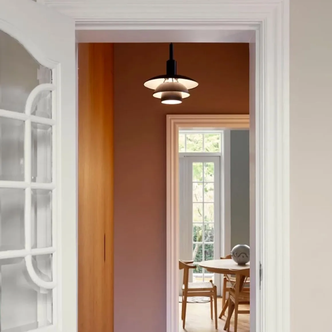 La lampe produit une lumière anti-éblouissante diffuse et agréable, typique de l’ensemble abat-jour réfléchissant de Poul Henningsen. Cette lampe est disponible en verre opalisé blanc, ou en métal peint noir finition soft touch et face interne blanche. Les abat-jour translucides en verre soufflé à trois couches génèrent une lueur chaleureuse autour de la suspension, tandis que les abat-jour métalliques à la face interne blanche renvoient une jolie lumière essentiellement dirigée vers le bas. La combinaison d’un abat-jour supérieur en métal et d’un abat-jour intermédiaire et inférieur en verre opalisé offre les deux types d’éclairage simultanément. Le diffuseur fourni en verre dépoli est très simple à insérer et permet d’adoucir encore plus la répartition de la lumière.
