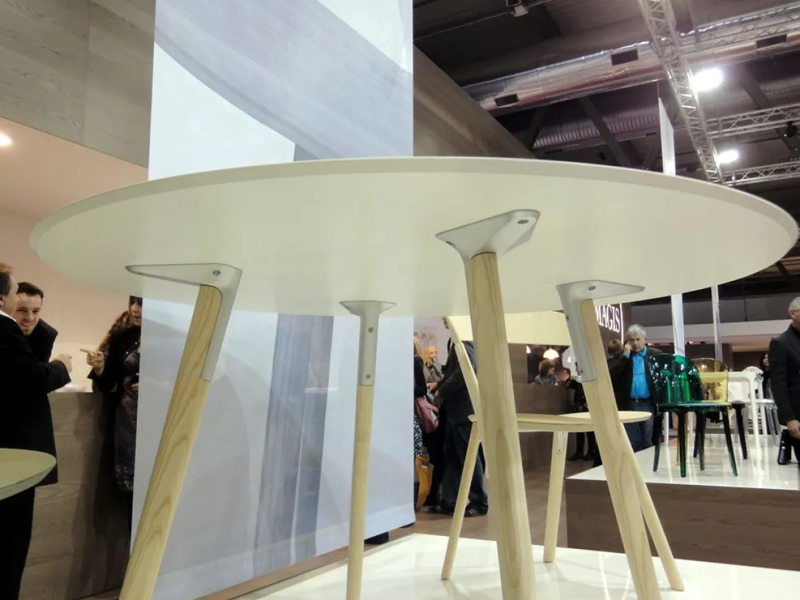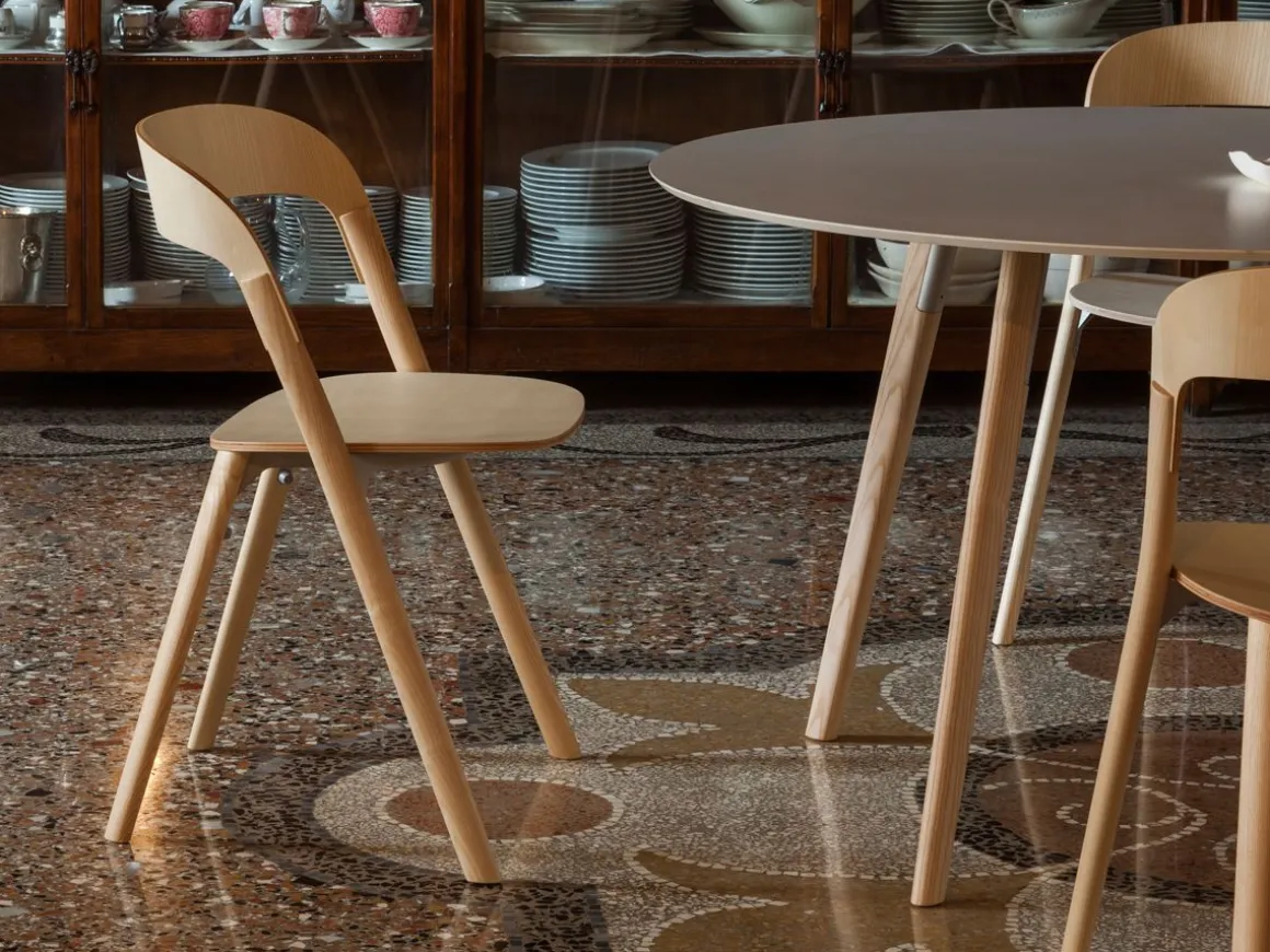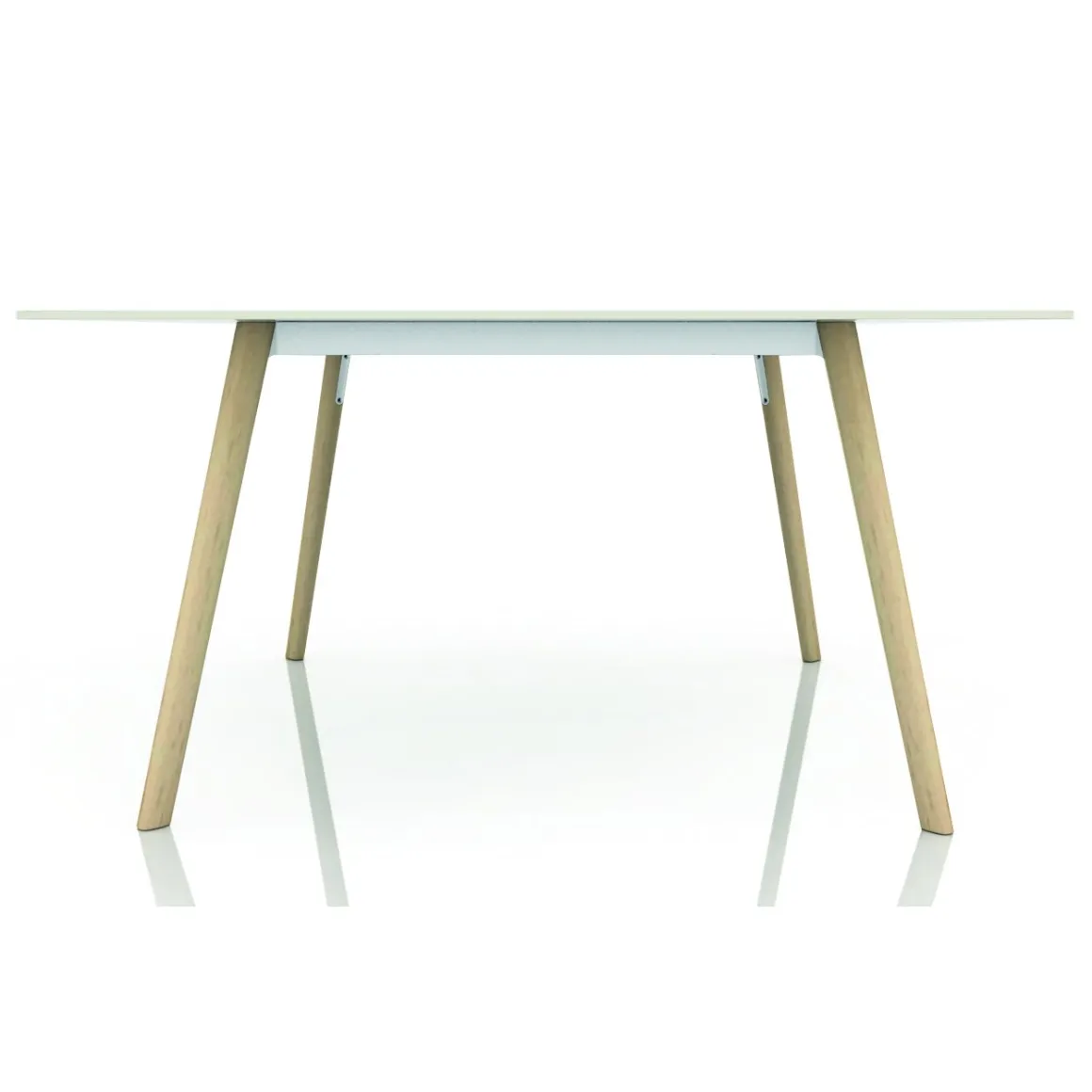 Matériaux: pieds en frêne massif, naturel ou teinté – plateau en HPL – traverses en tube d’acier verni en résine époxy – joints en fonte d’aluminium, sablé ou verni en résine époxy