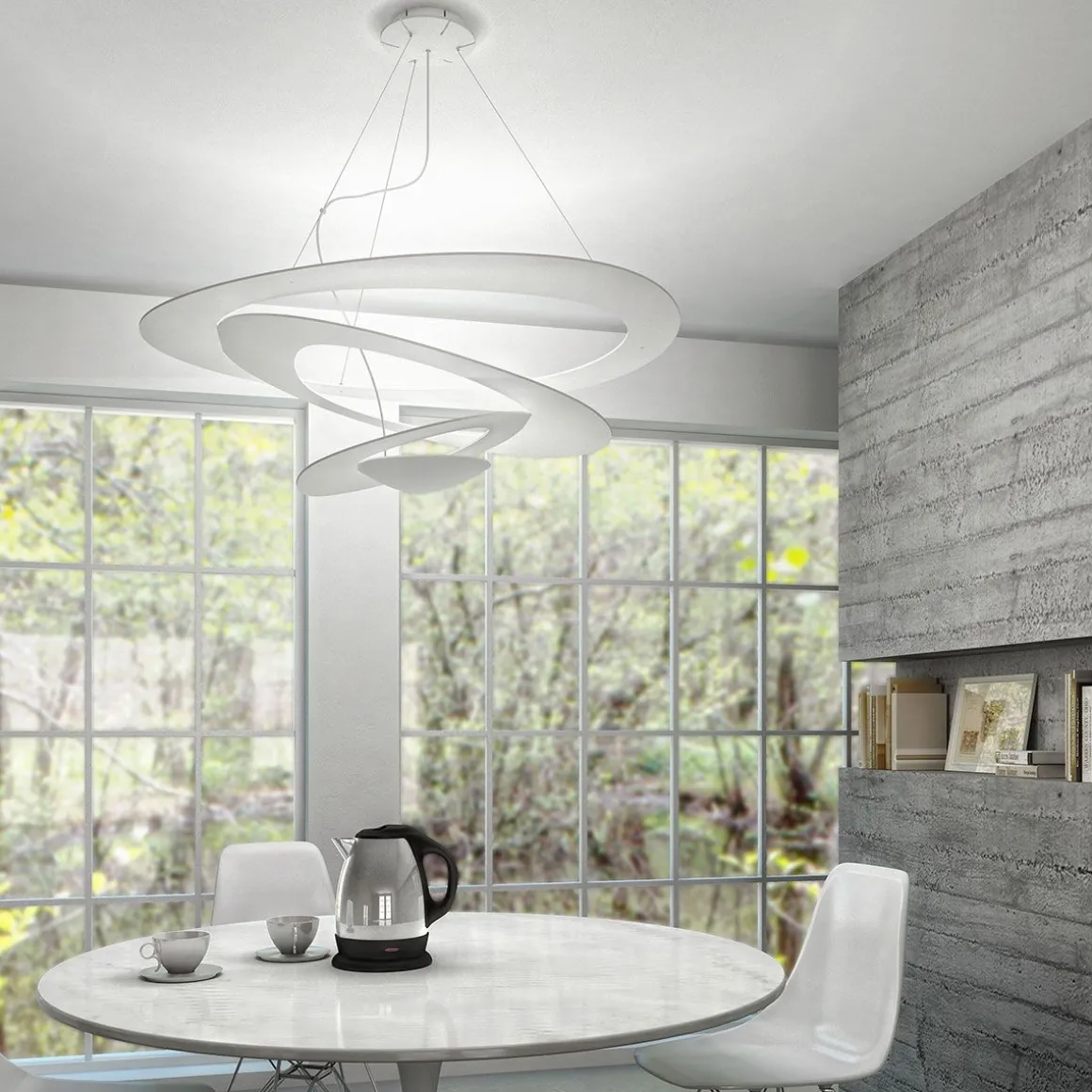 La suspension Pirce Mini LED se compose de spirales découpées dans un grand disque d’aluminium verni blanc. La source LED est située sur la coupole du bas. La lumière, dirigée vers le haut, rebondit sur les spirales réfléchissantes. Ce ruban lumineux joue avec les ombres pour un effet magique… Cette suspension possède un style aérien et graphique. Un disque mince donne naissance à des volutes flottantes qui retombent doucement vers le bas en créant des effets magiques de forme et de lumière. Sublimez votre intérieur grâce à Pirce.