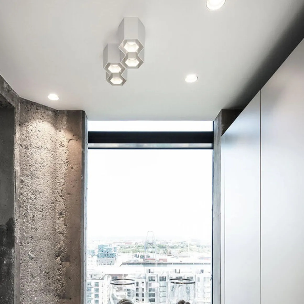 Créez un plafond en nid d’abeilles avec le plafonnier Hexo. Simple et original il vous apportera des formes originales si vous en mettez plusieurs à la suite.