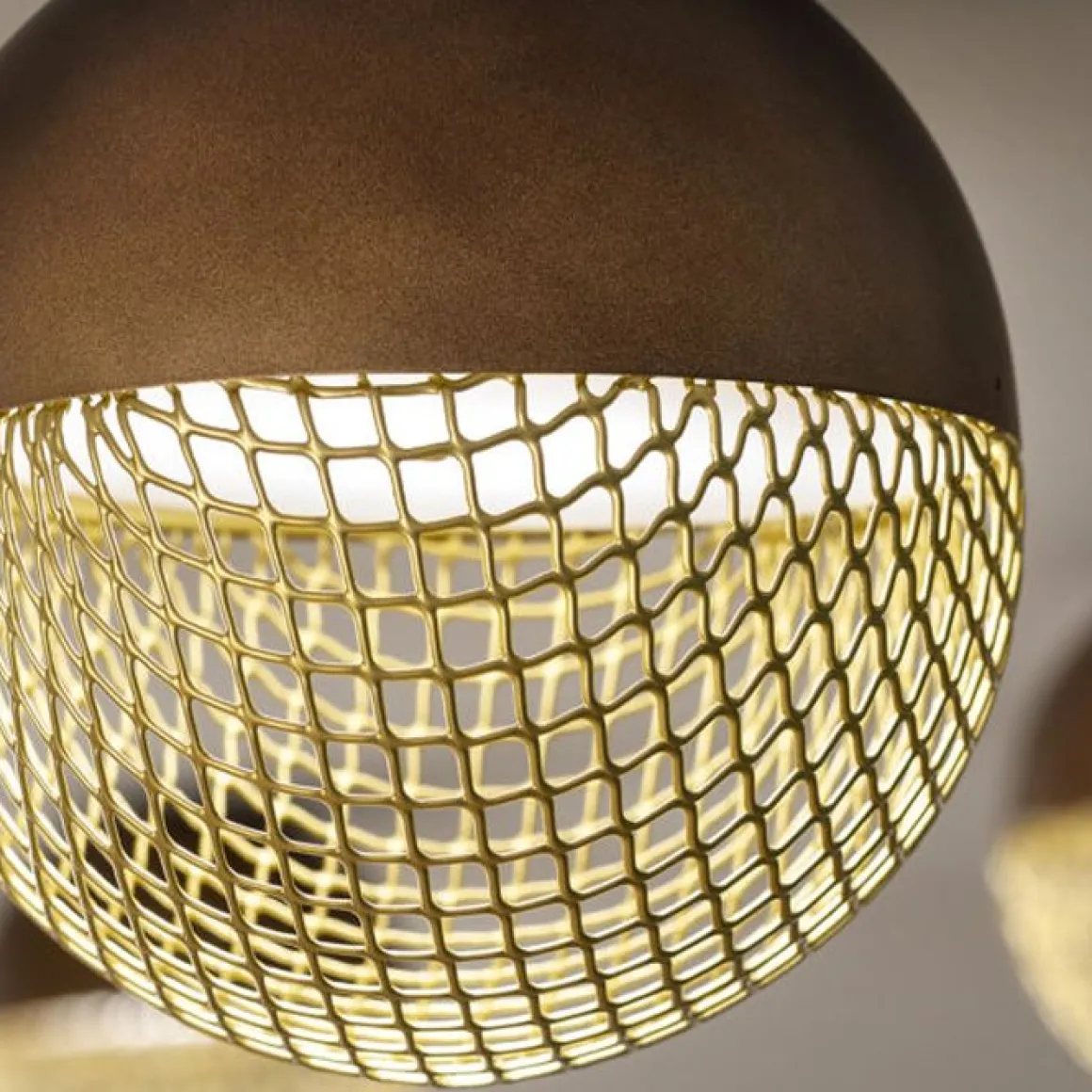 Iglù est une forme née de l’intuition observant la perfection de la sphère, transformée en une forme parfaite, reconnaissable et unique par un maillage qui, plutôt que d’obstruer la lumière, crée plutôt un motif de lumière et d’ombre, transformant le métal en un bijou lumineux.