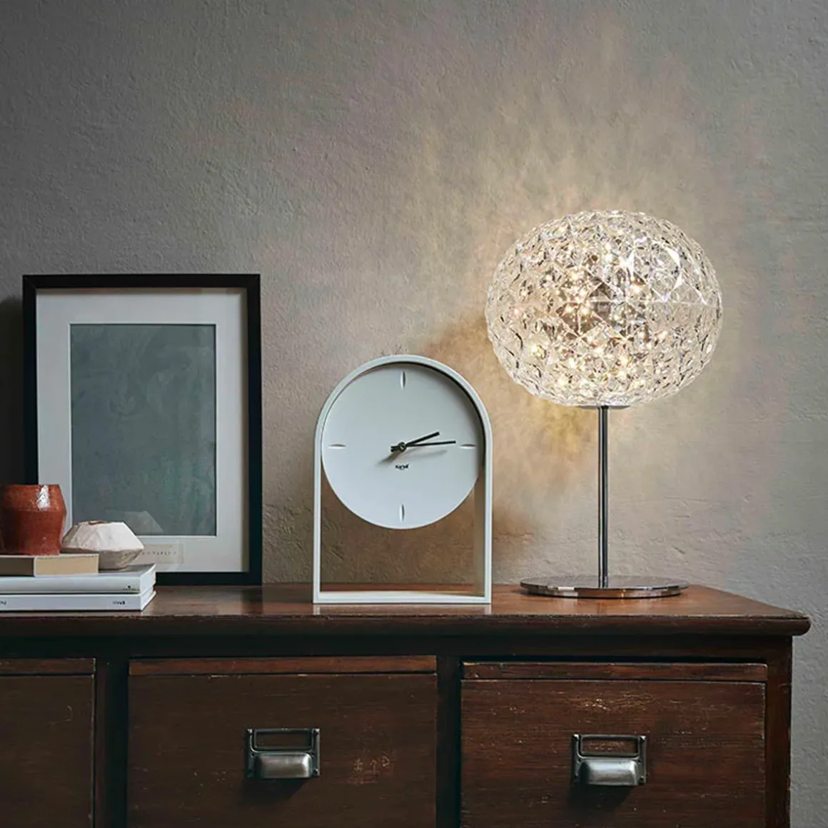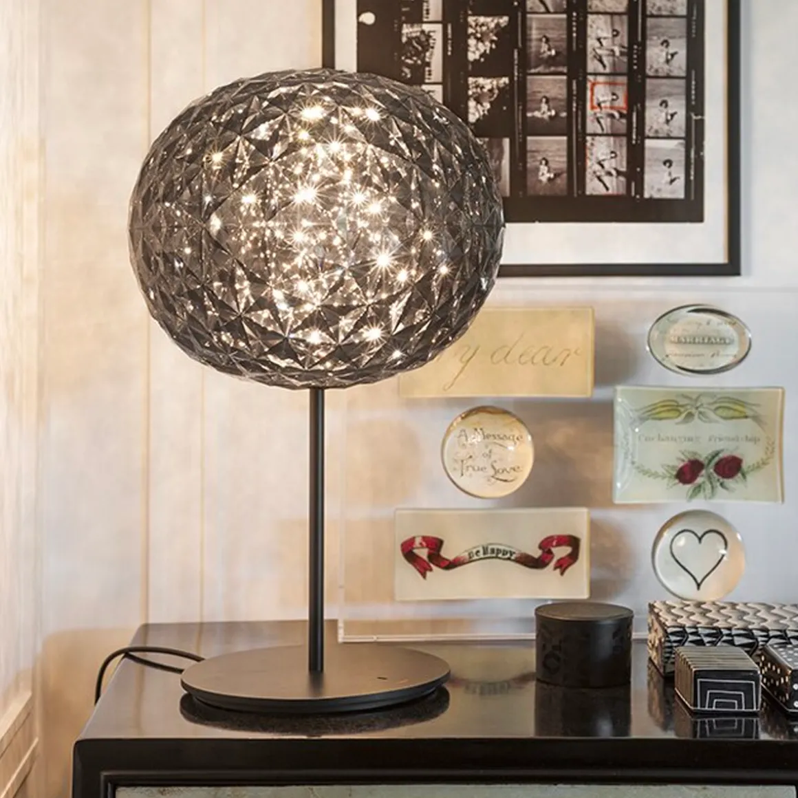 Tokujin Yoshioka présente son premier projet d’éclairage pour Kartell. Planet est une sphère qui vit des réfractions, avec une série complexe de surfaces et de réflexions. Elle fait partie d’une série complète de lampes caractérisée par la forme particulière du diffuseur. Cette lampe à poser possède une forme ovoïdale et est réalisée avec un matériau transparent taillé en facettes, à l’intérieur et à l’extérieur, qui crée un éclairage scénographique. Avec sa finition cristal, elle s’adapte à différentes décorations et apporte sa touche design !