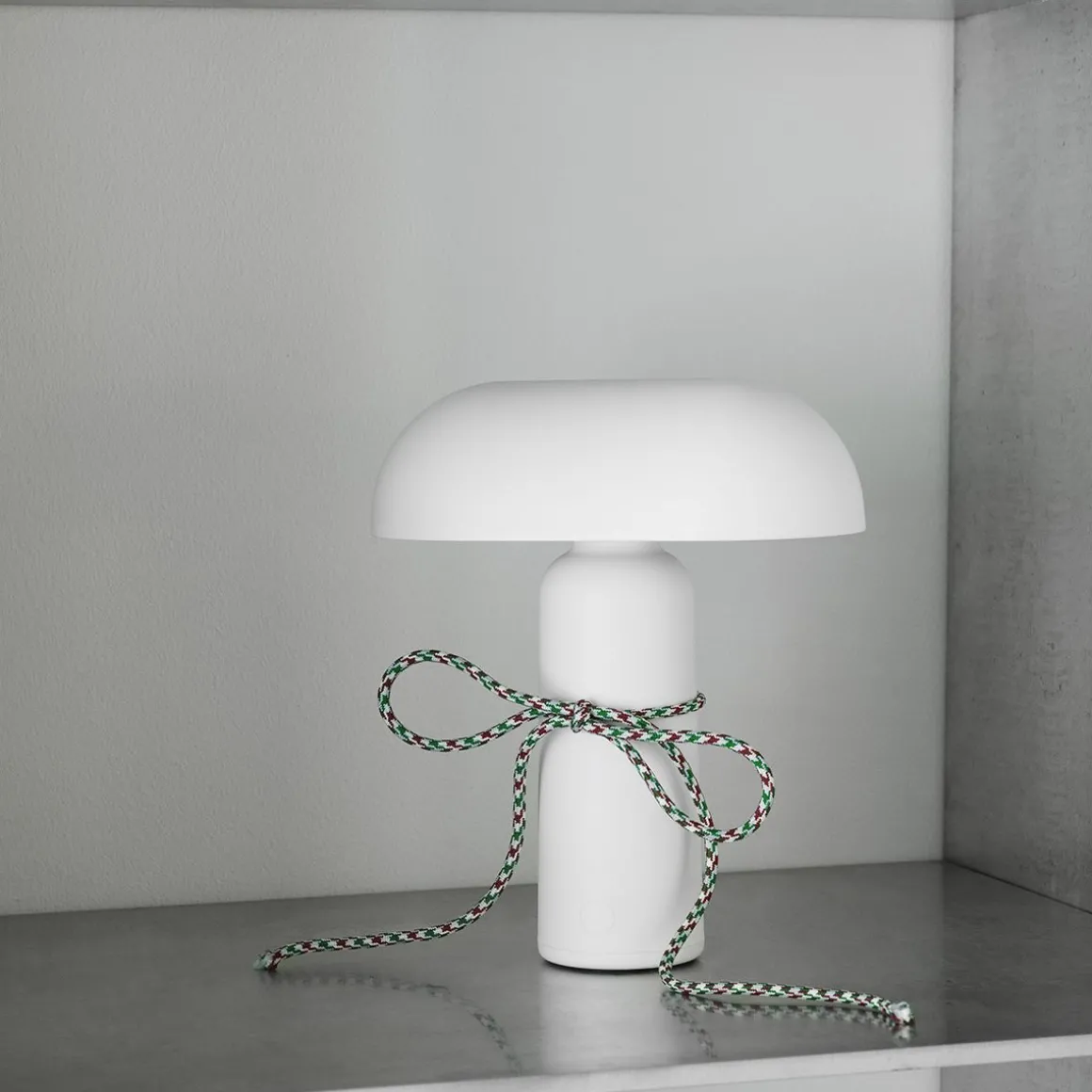 La lampe de table Porta se compose d’un abat-jour reposant sur une base robuste et arrondie, tous deux en plastique ABS. Un écran intérieur en acrylique blanc assure une lueur agréable et uniforme. Un anneau de base en silicone permet à la lampe de rester bien en place.